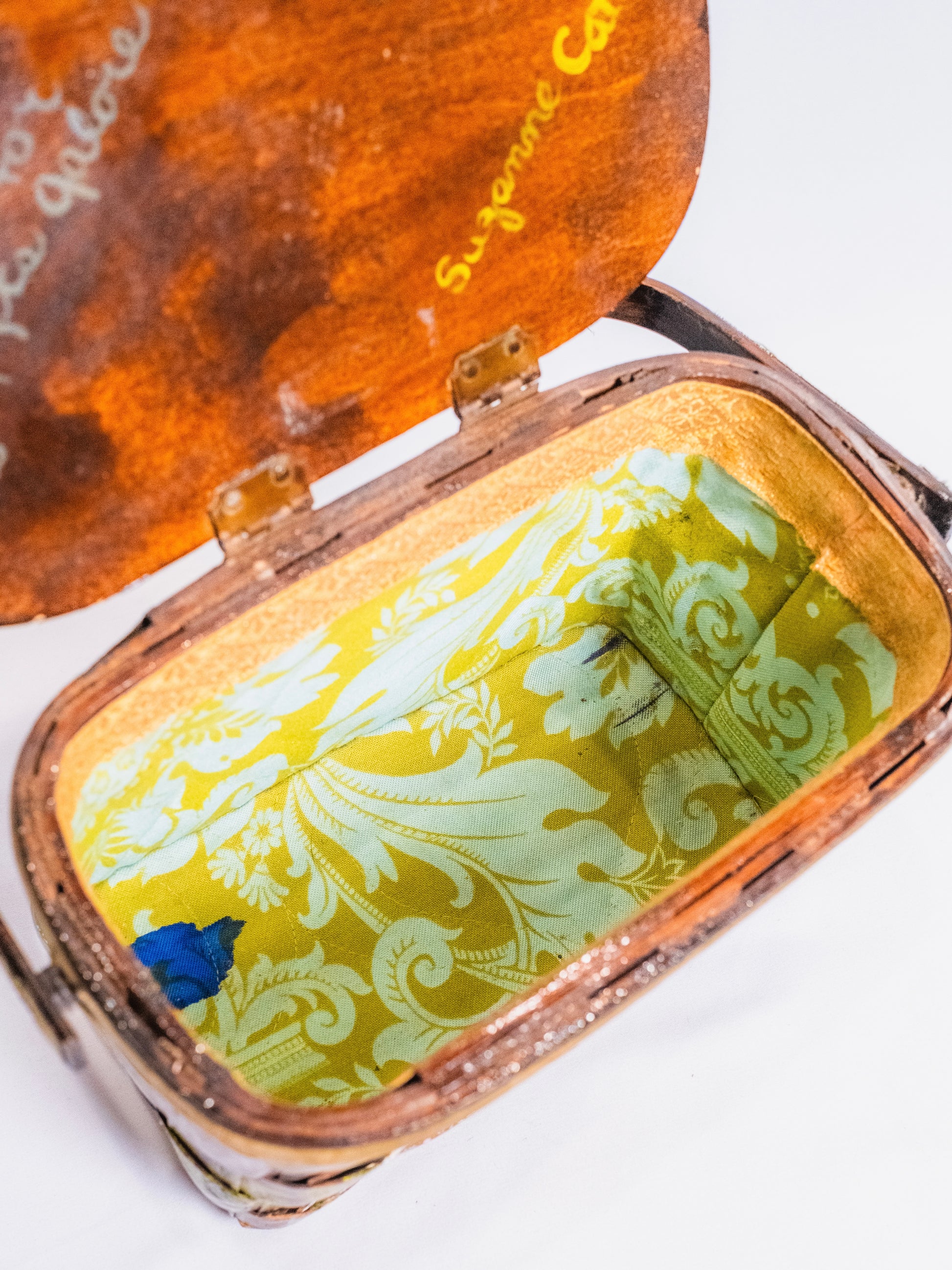 Vintage 1960s Woven Wood Hand-Painted “Newark City” Basket Purse. Features velvet trim & quilted paisley lining inside basket.