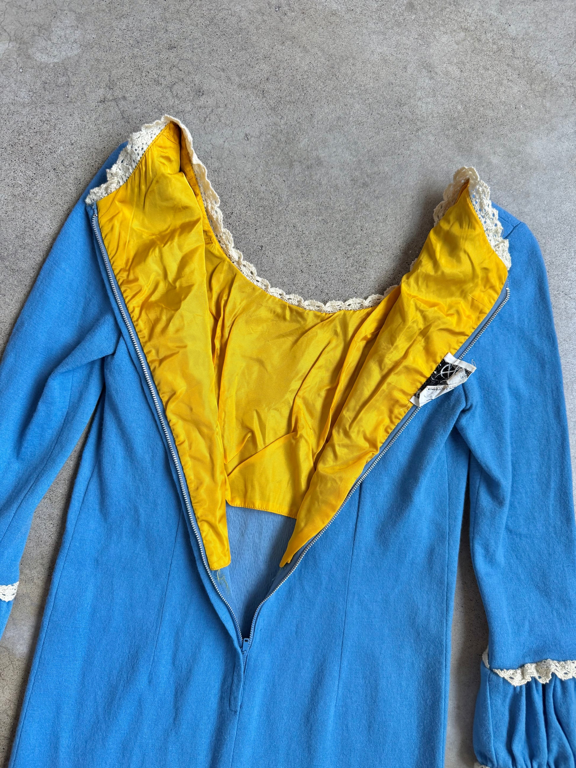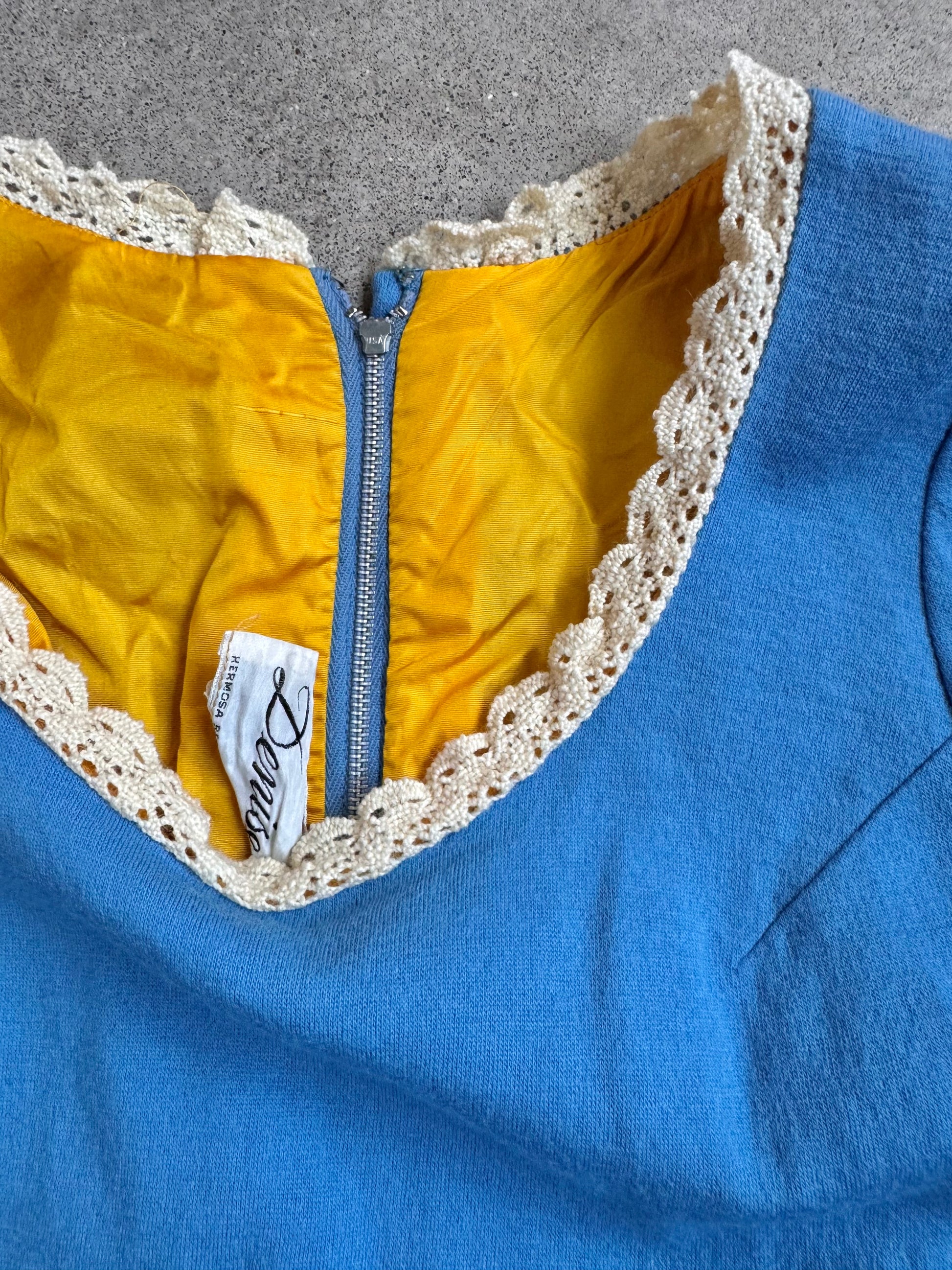 Vintage 1960s Denise Blue Wool & Crochet Trim Long Sleeve Dress. Features a zipper closure at back.
