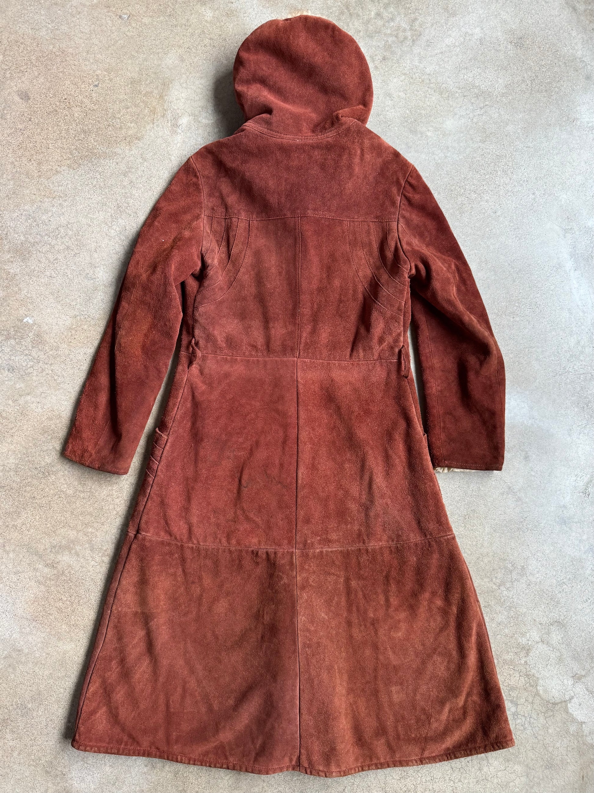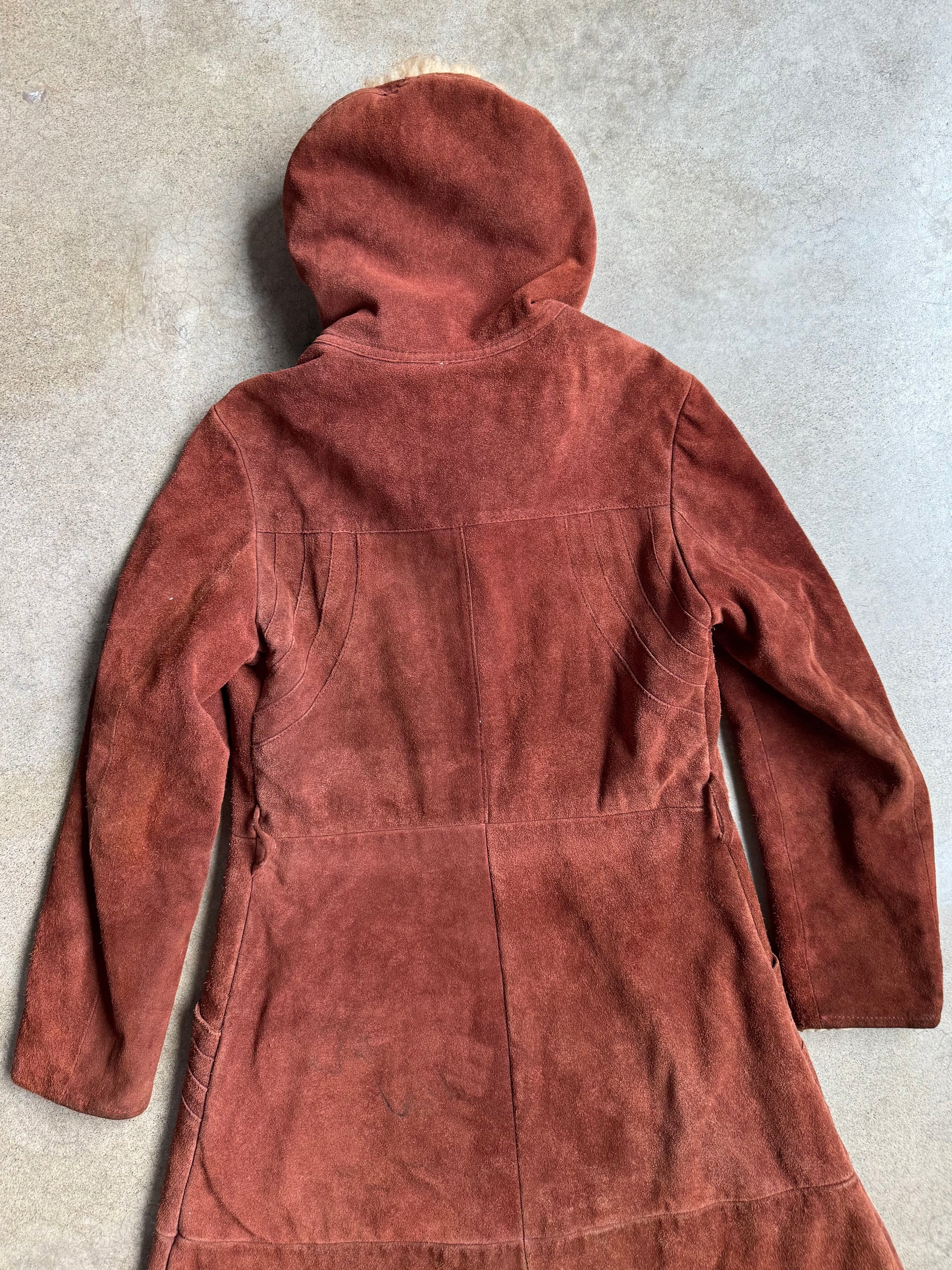 Vintage 1970s Berman’s Rusty Brown Suede Lamb Fur Trim Hooded Overcoat. Features button closures down the front, belt loops, front pockets, and faux fur Sherpa lining.