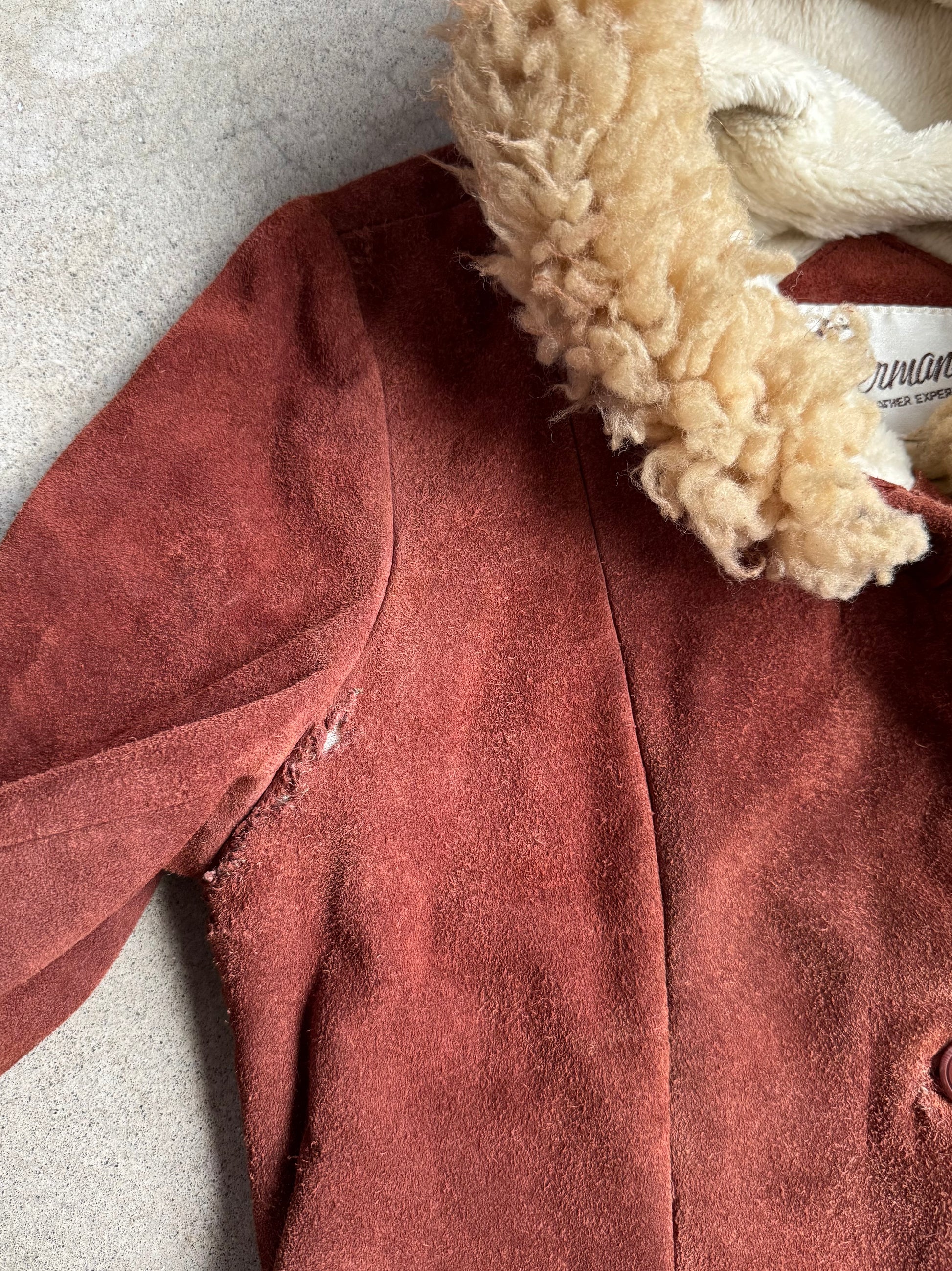 Item Condition - Suede looks worn and has a few mended rips around underarms (see photos). Inside lining and trim are in good condition.