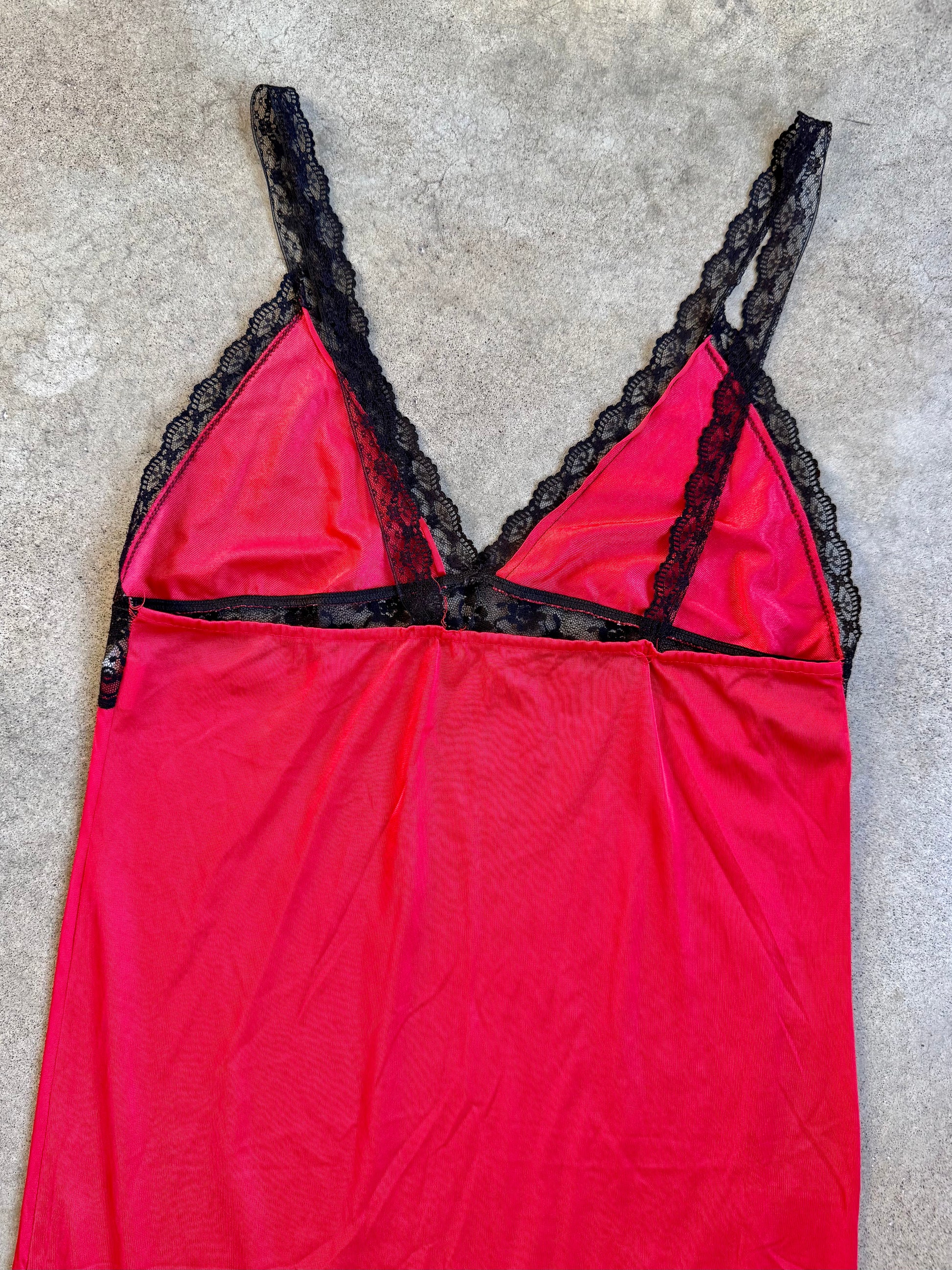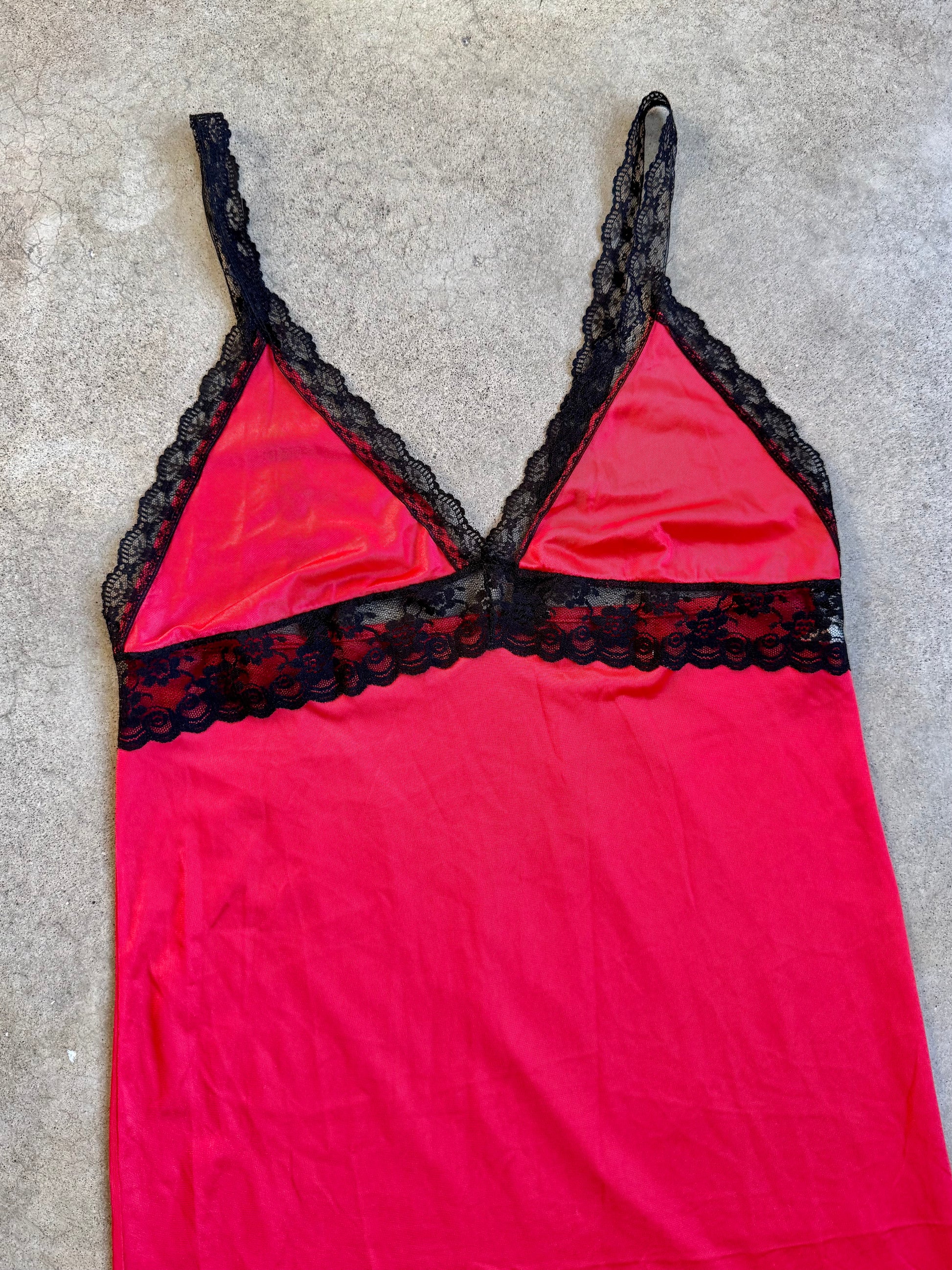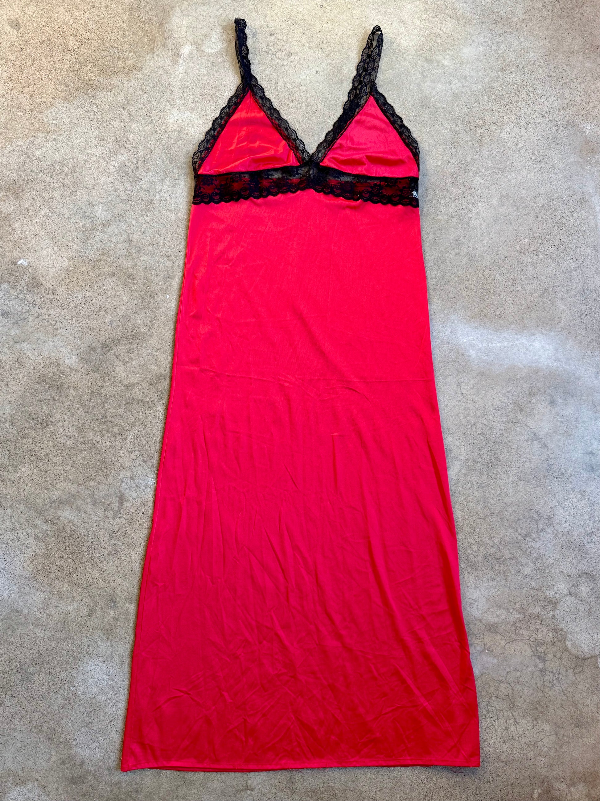 Vintage 1970s By Beverly Red & Black Lace Trim Maxi Slip Dress. Silky nylon fabric.