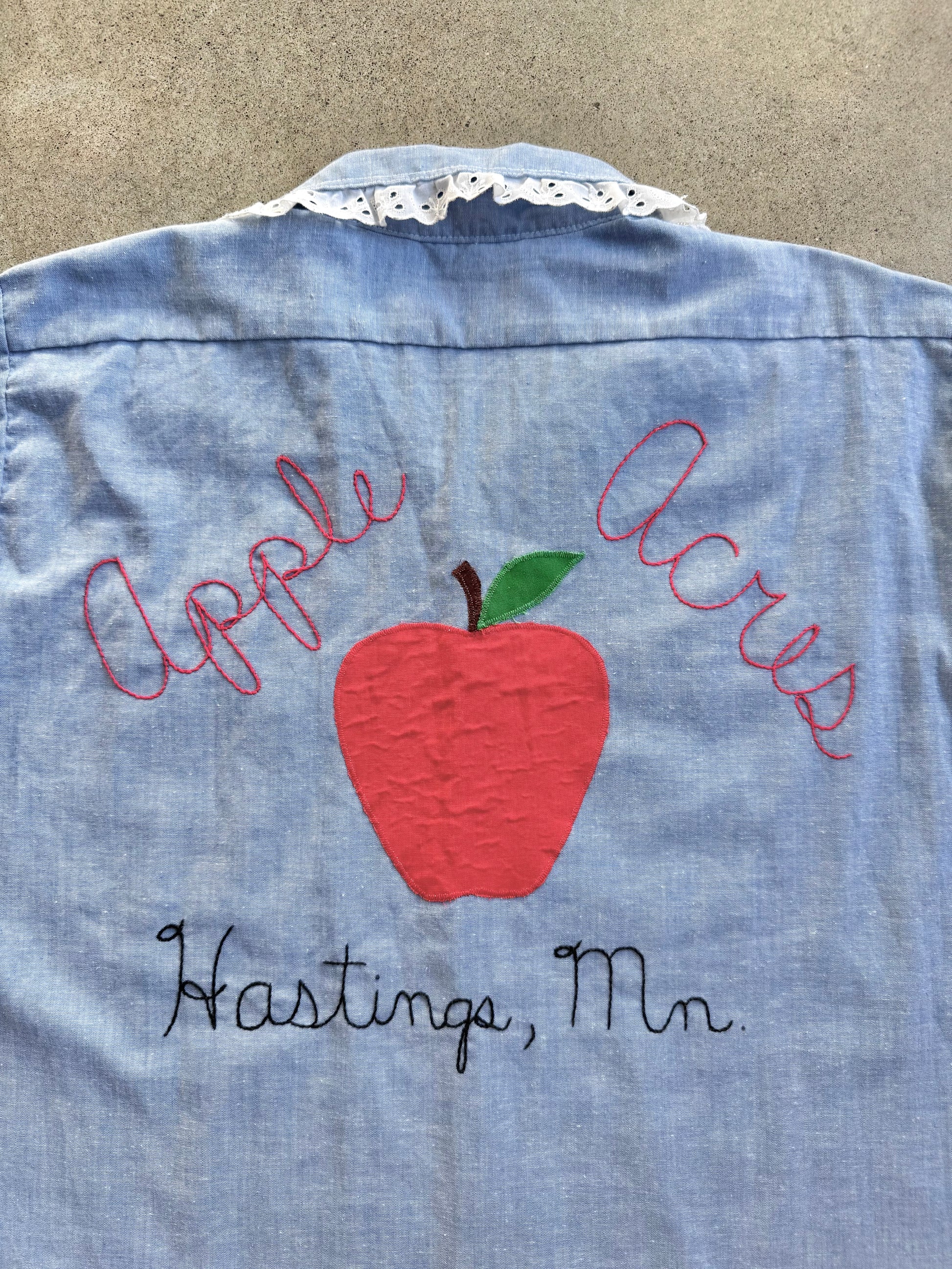 Vintage 1970s Big Ben by Wrangler Chainstitch Apple Acres Hastings, MN “Harriet” Blue Work Shirt w/ Frilled Eyelet Trim.