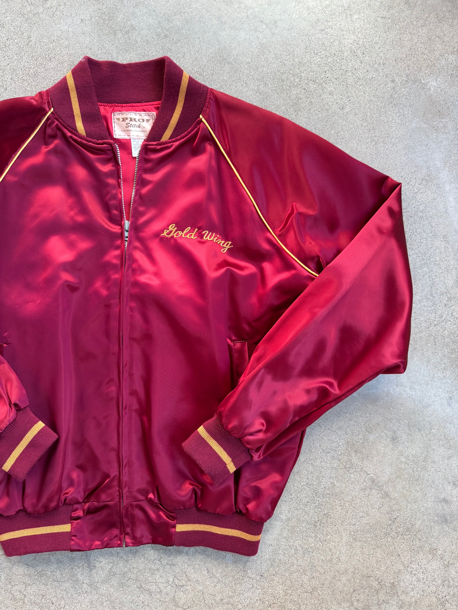 Vintage 1970s Burgundy “Gold Wing” Embroidered Satin Zip-Up Bomber Jacket.