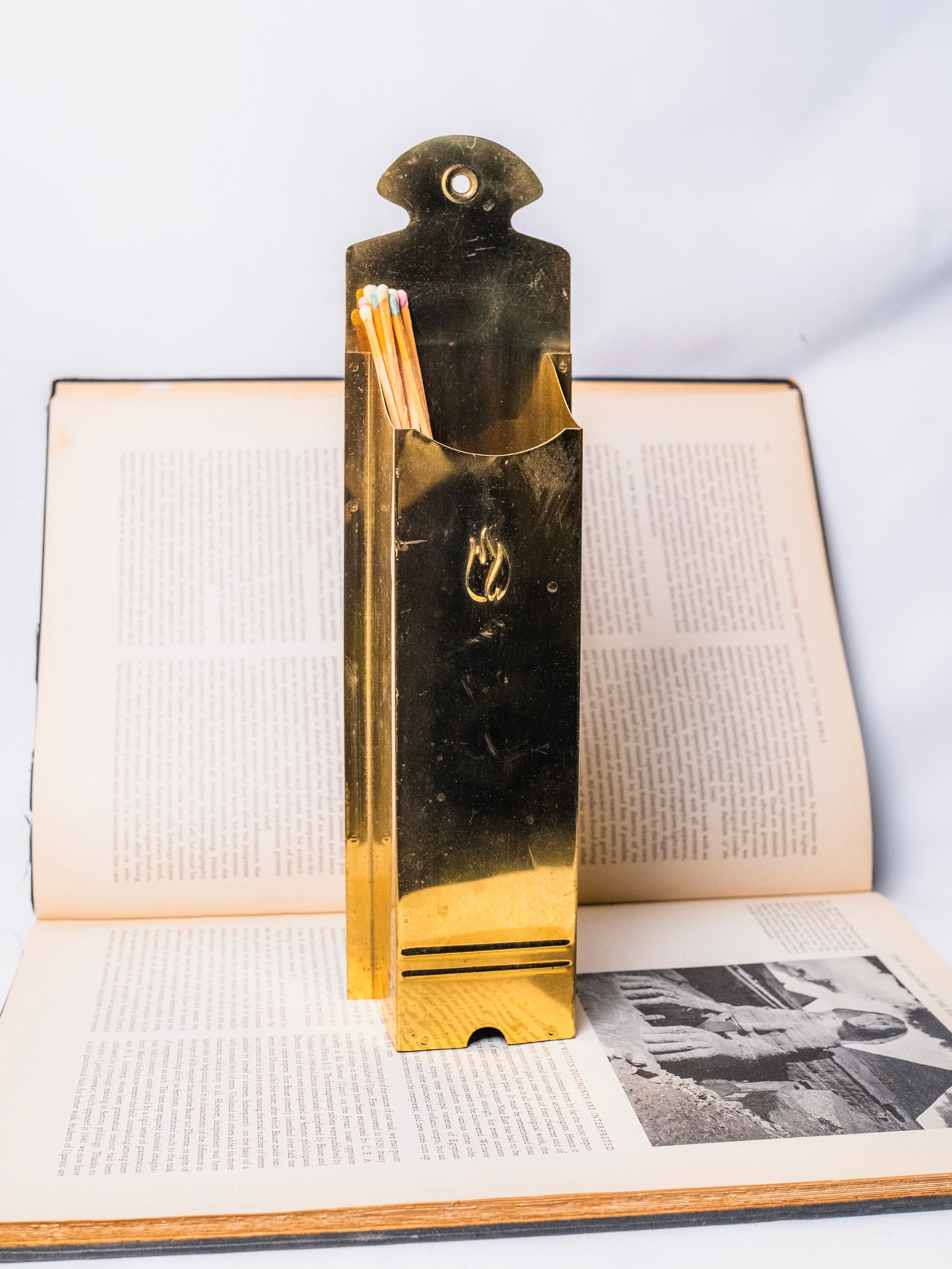 Vintage 1970s Gold Metal Fireplace Matchstick Holder Wall Pocket.