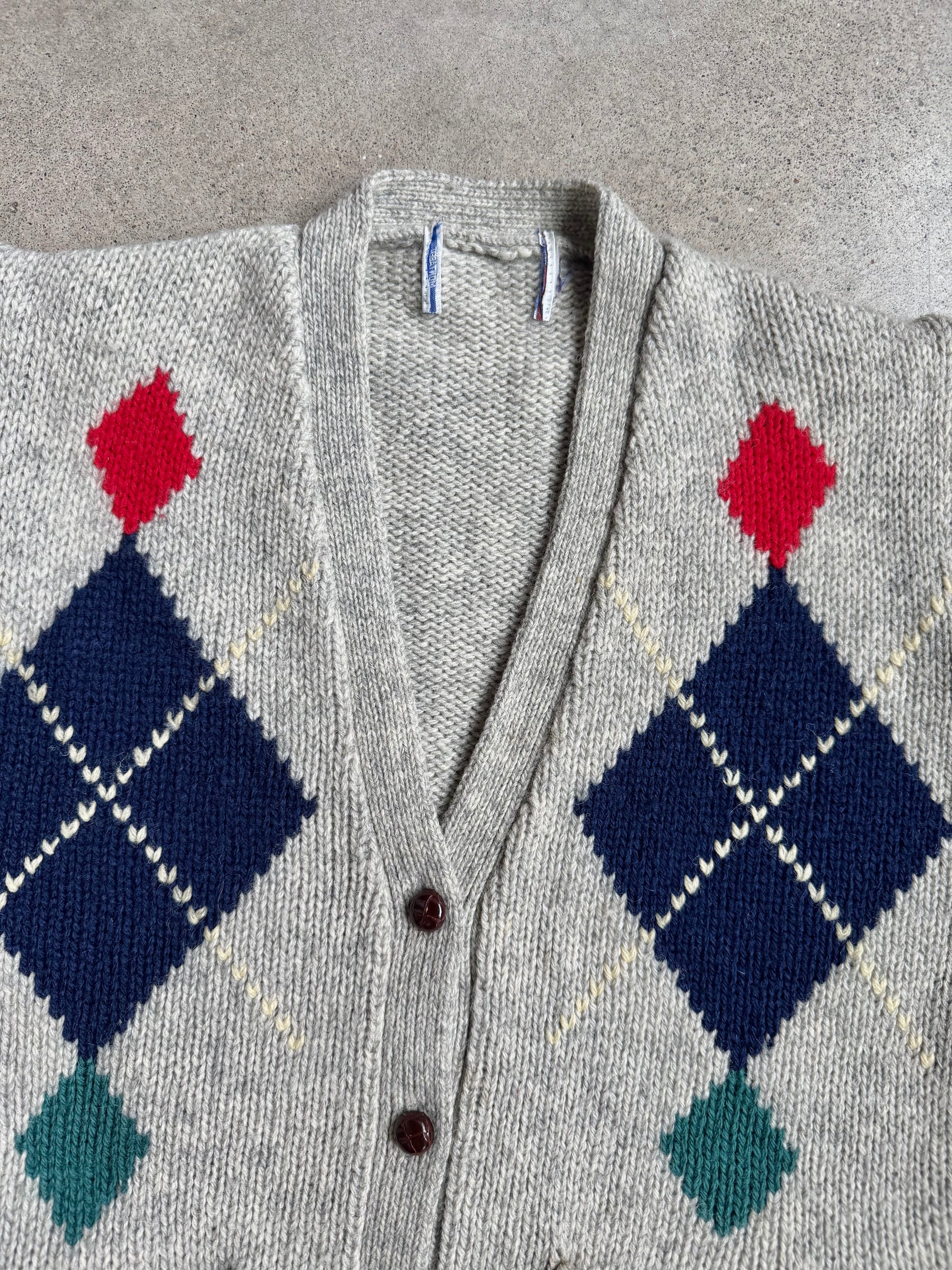 Vintage 1970s Grey Argyle Pattern Buttoned V-Neck Cardigan Sweater.