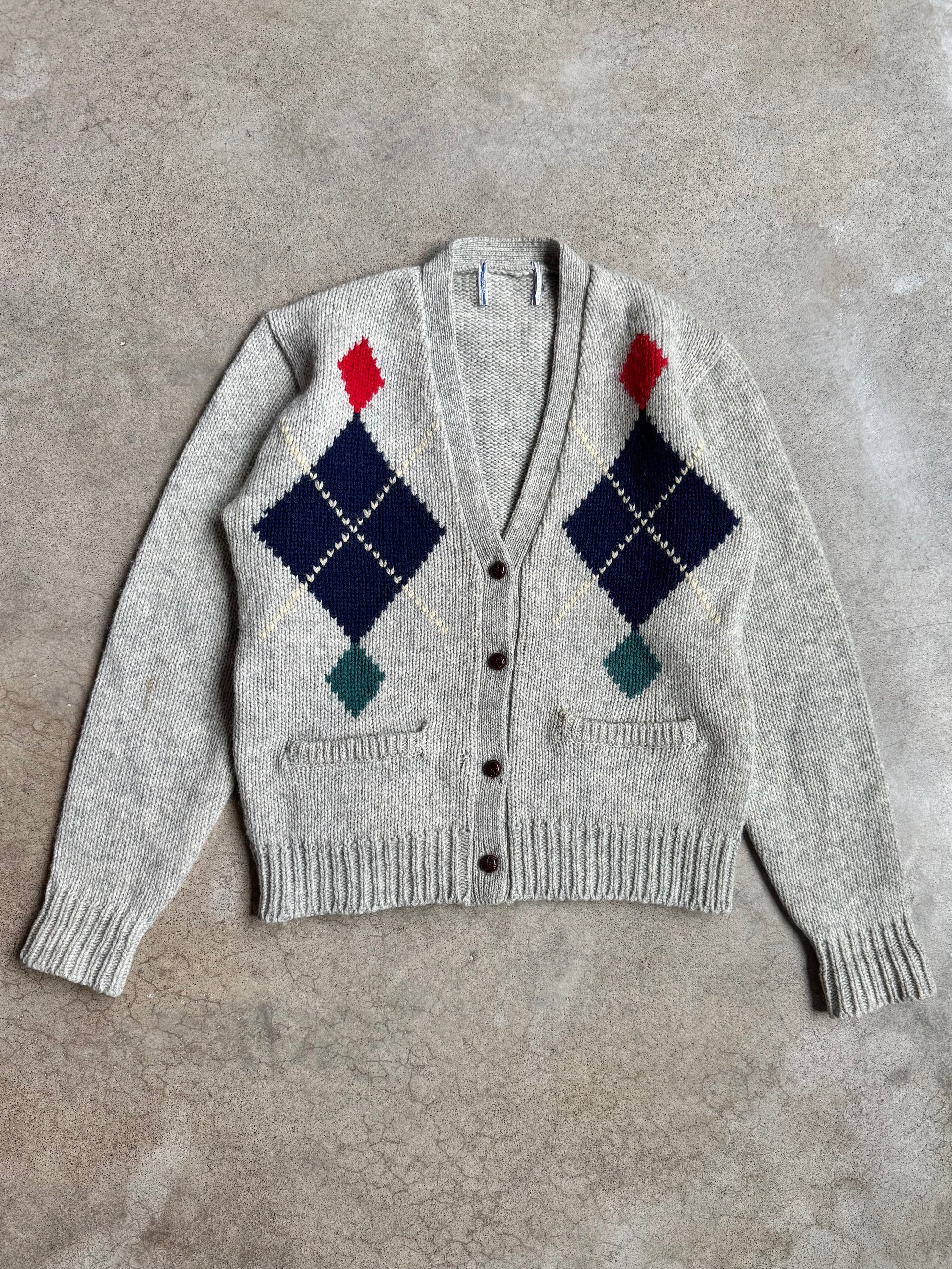 Vintage 1970s Grey Argyle V-Neck Cardigan | Small