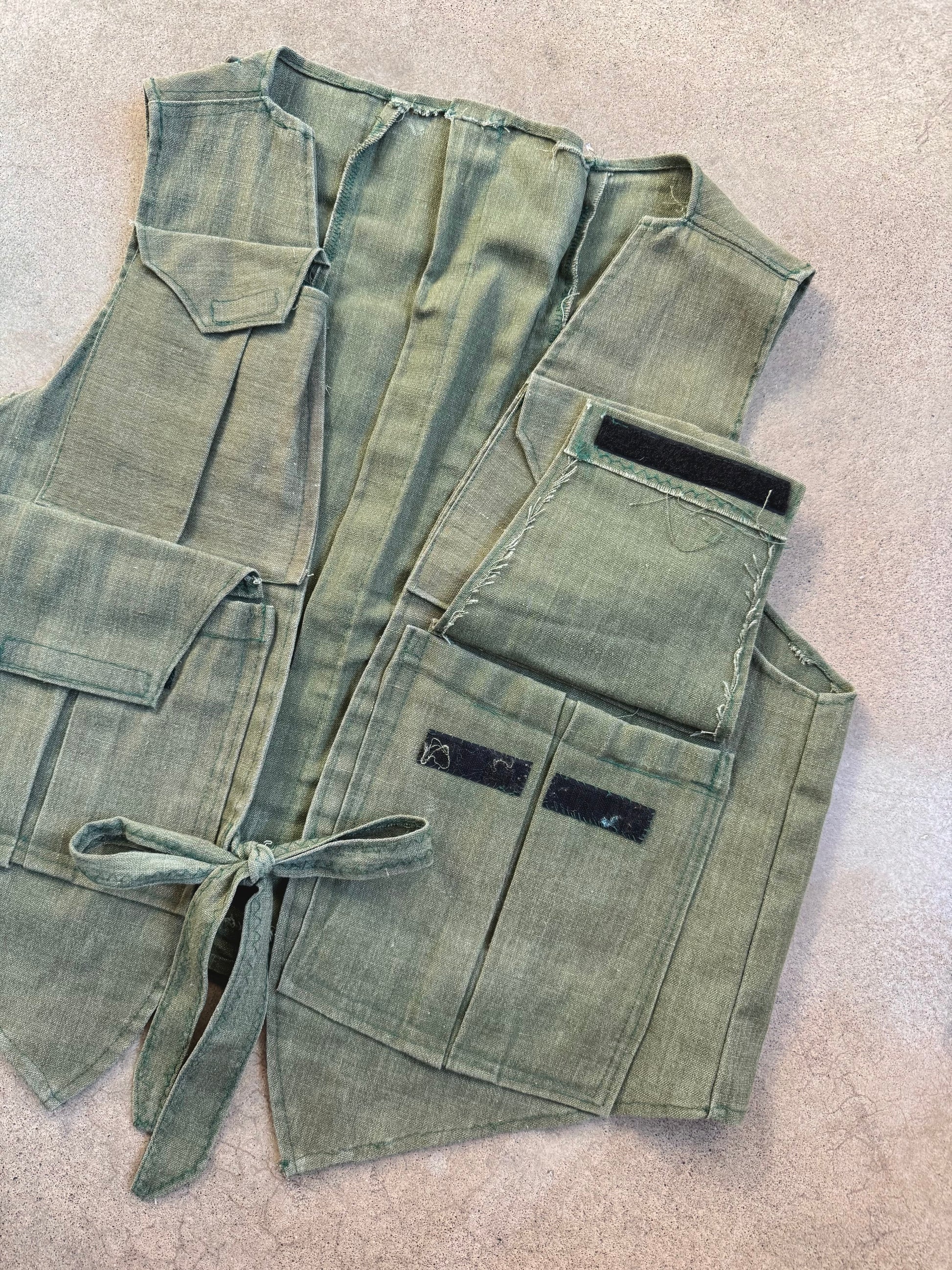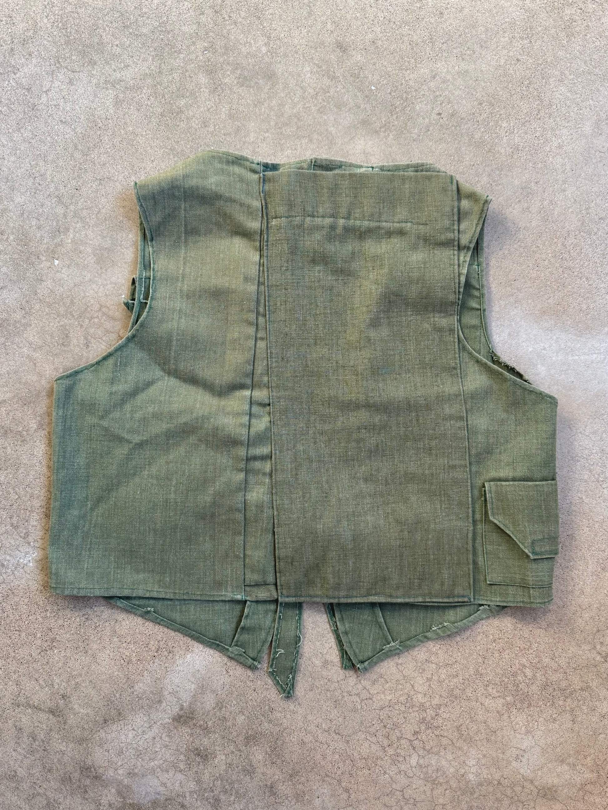 Vintage 1970s Handmade Green Cargo Utility Vest. Features a tie closure at front & velcro cargo pockets.