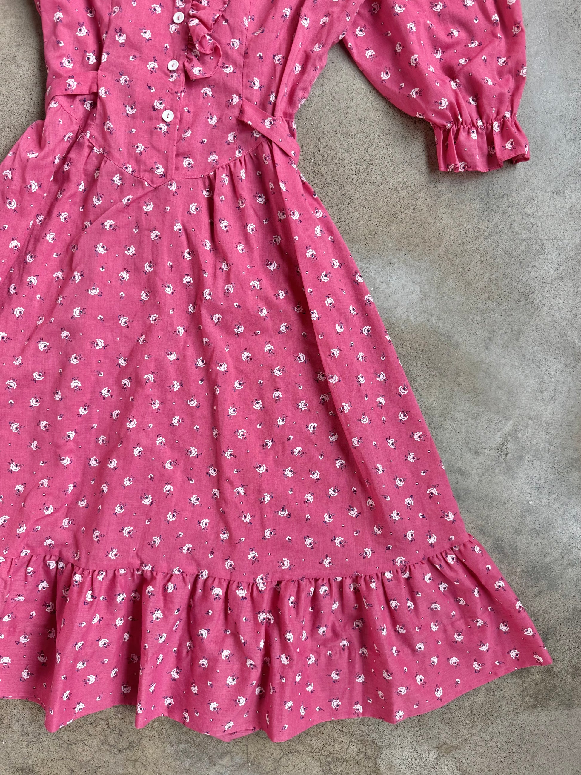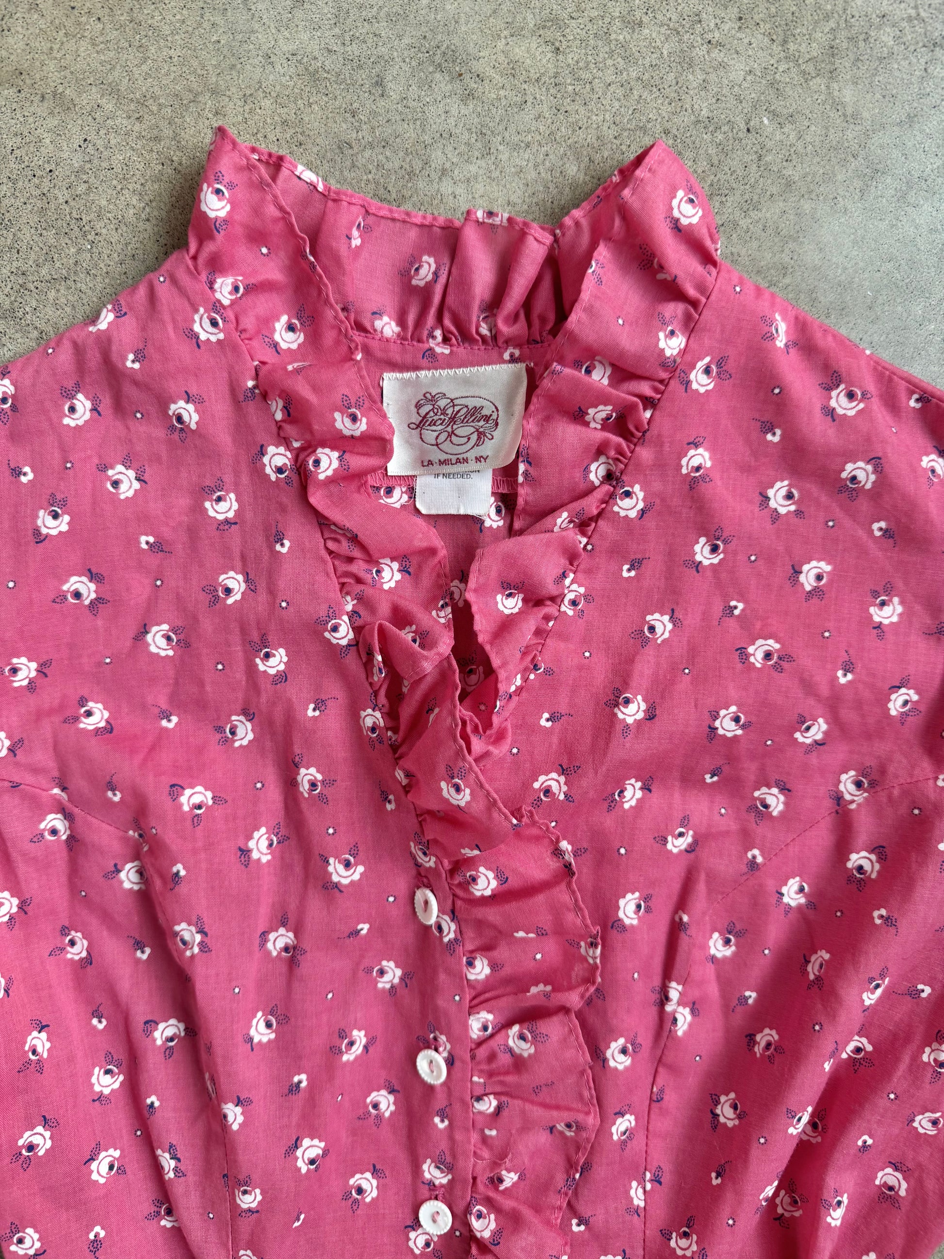 Vintage 1970s Luci Pellini Pink Floral Frilled Puff Sleeve Button-Front Dress. Features an adjustable tie at waist (also elasticated at back of waist) & ruffle trim detailing. Lightweight cotton-poly fabric.