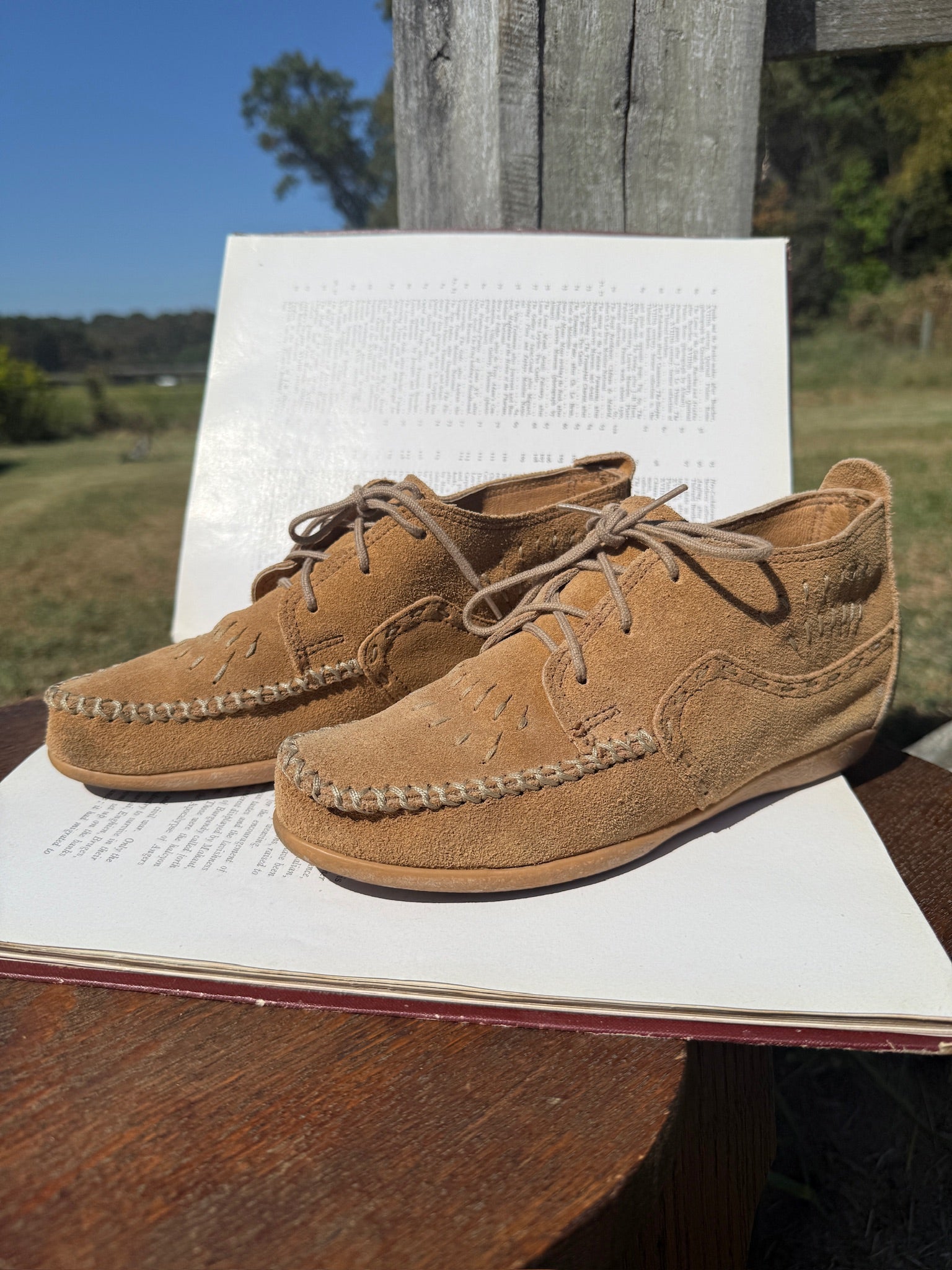 Vintage 1970s Minnetonka Suede Lace-Up Moccasin Shoes.