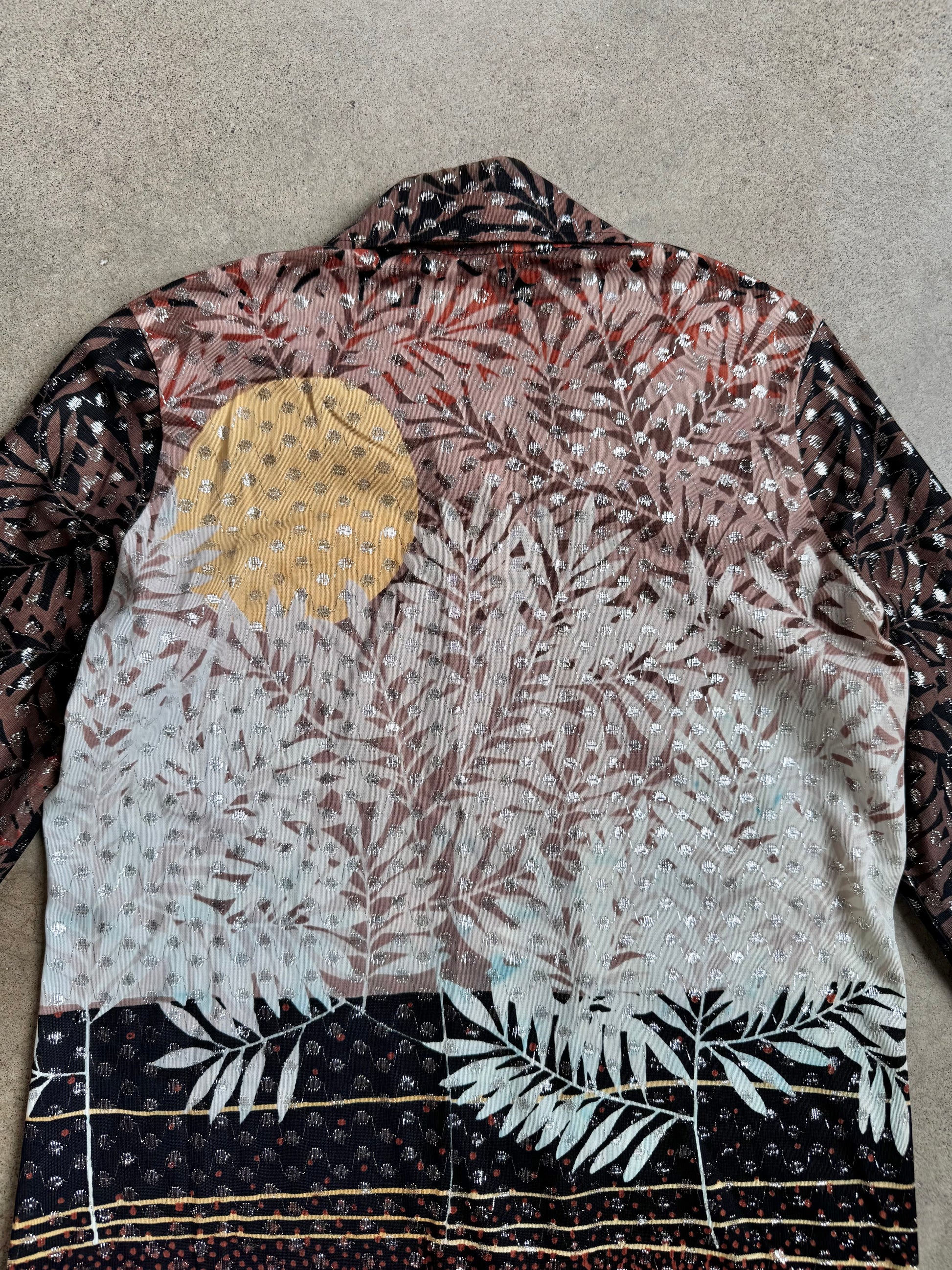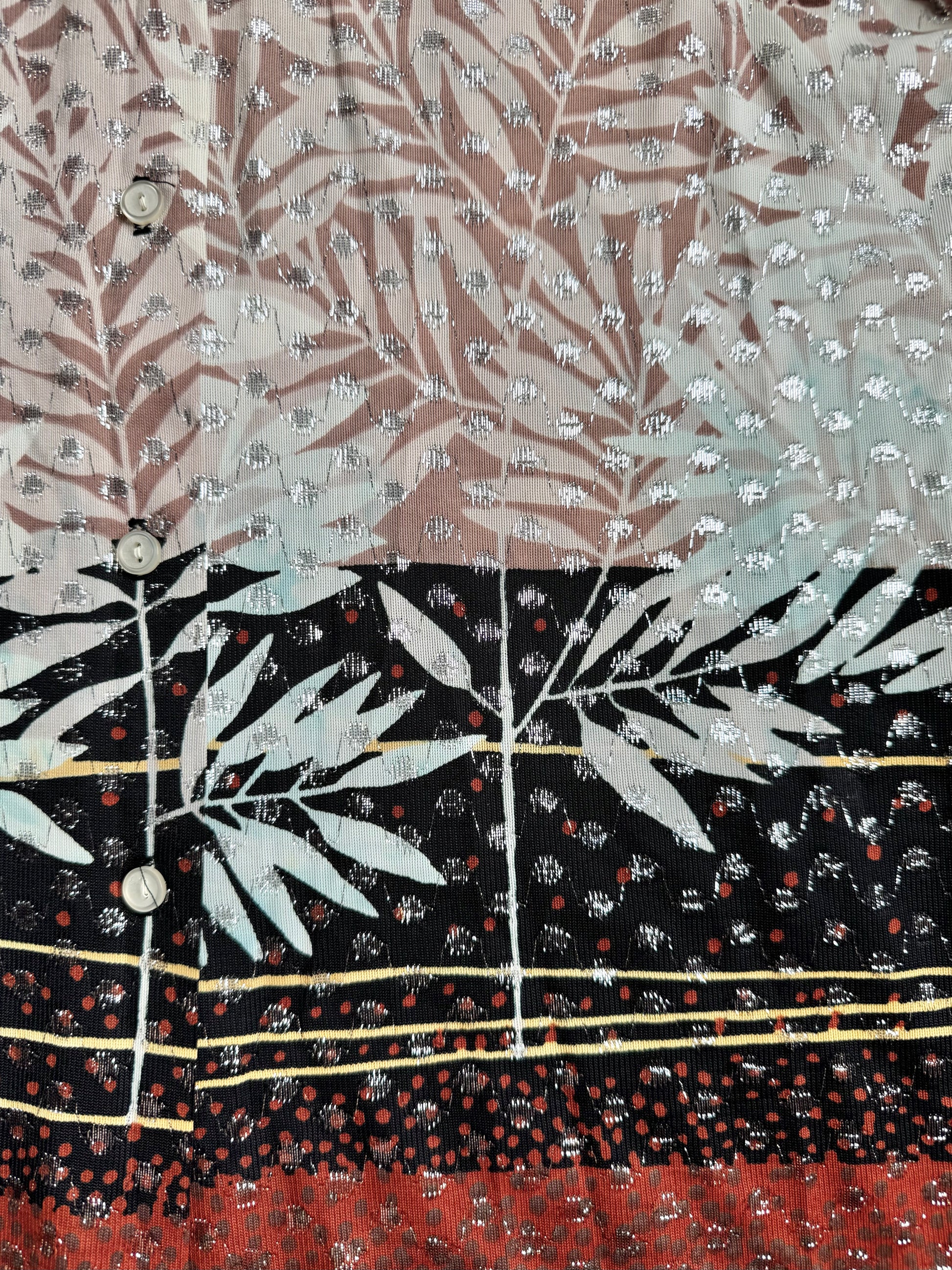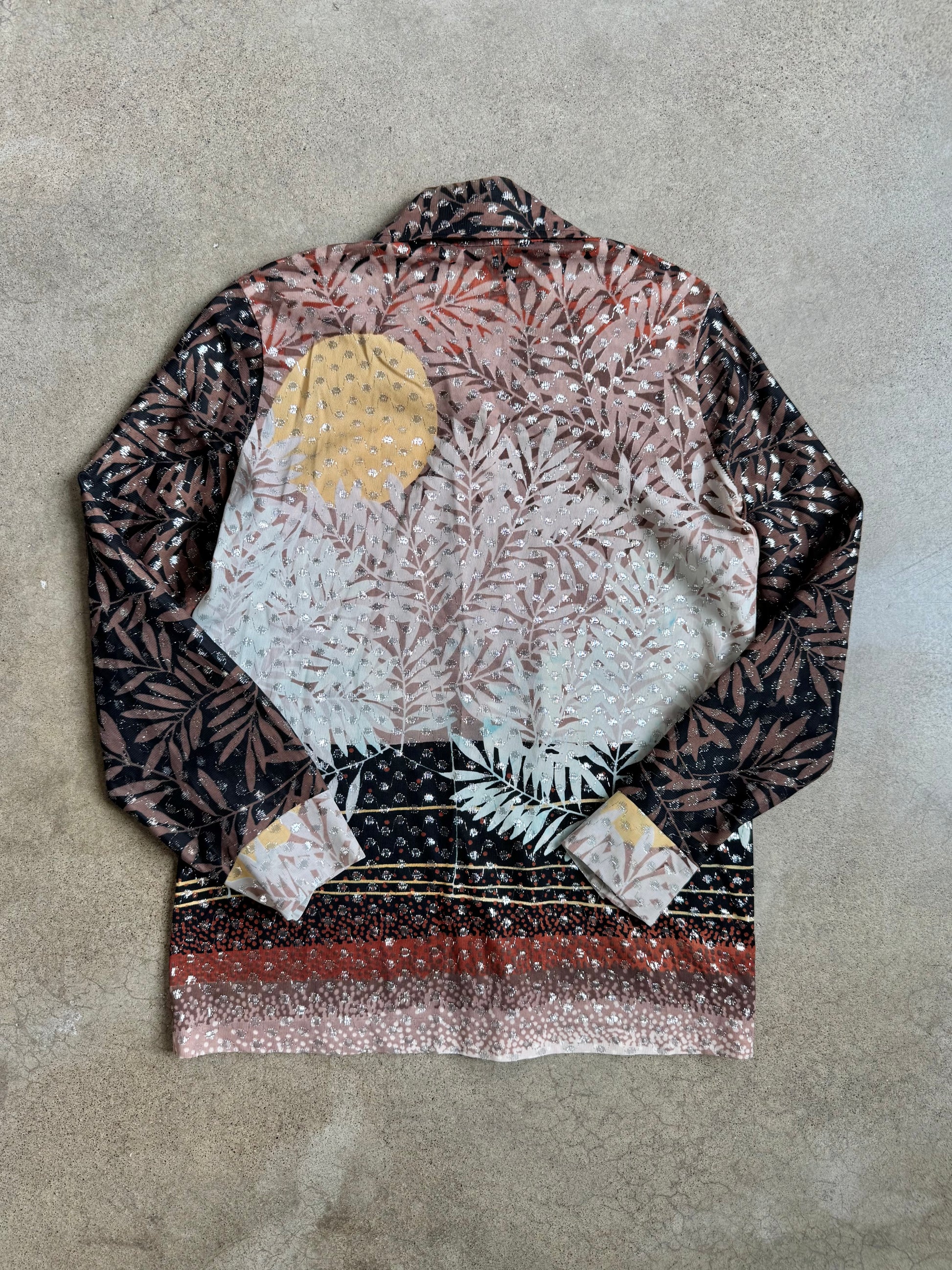 Vintage 1970s Natasha Originals Brown-Tone Botanical Print w/ Silver Metallic Button-Up Disco Shirt.