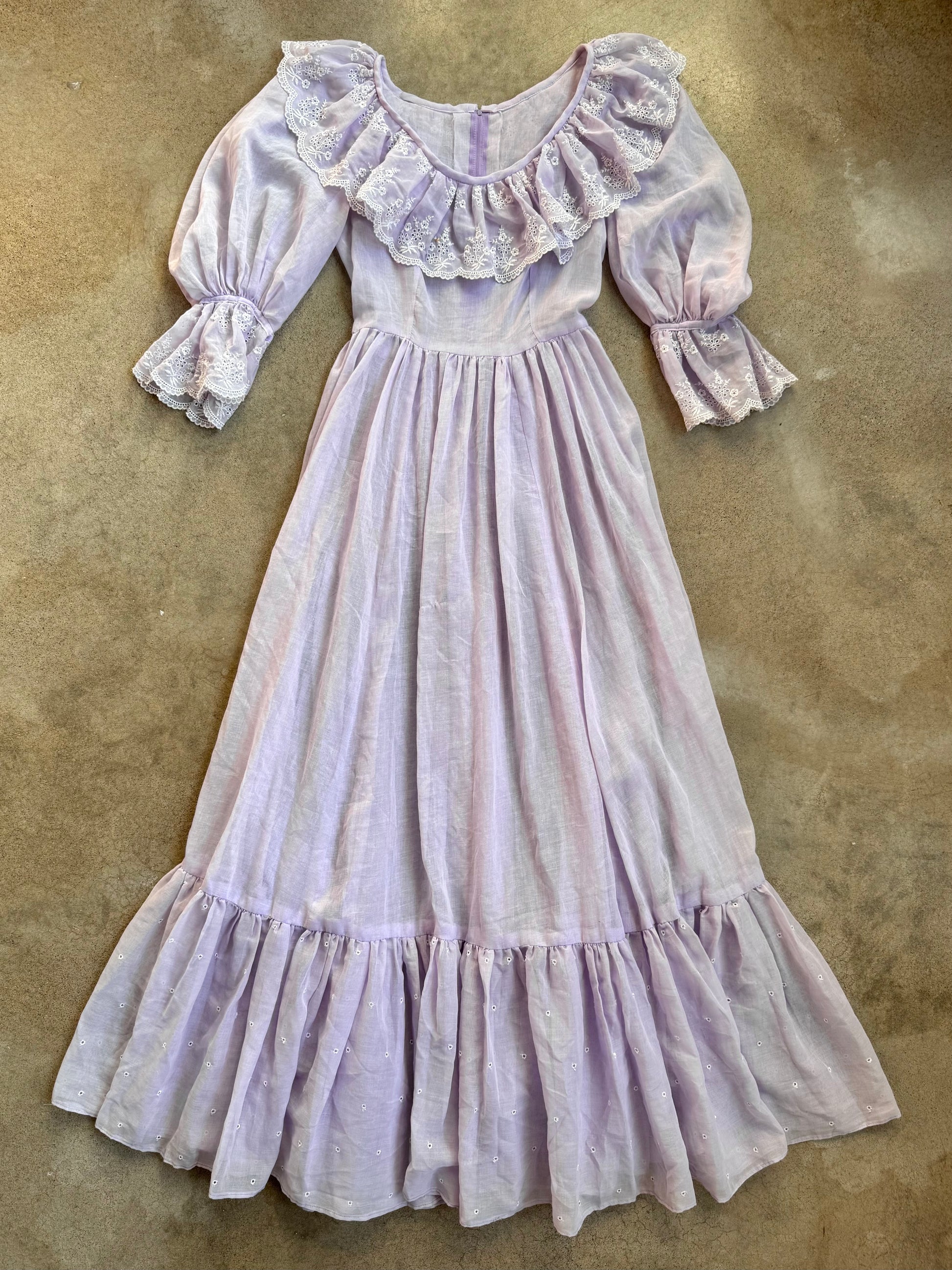 Vintage 1970s Purple Floral Eyelet Frilled Fairy Princess Maxi Dress | XS/S