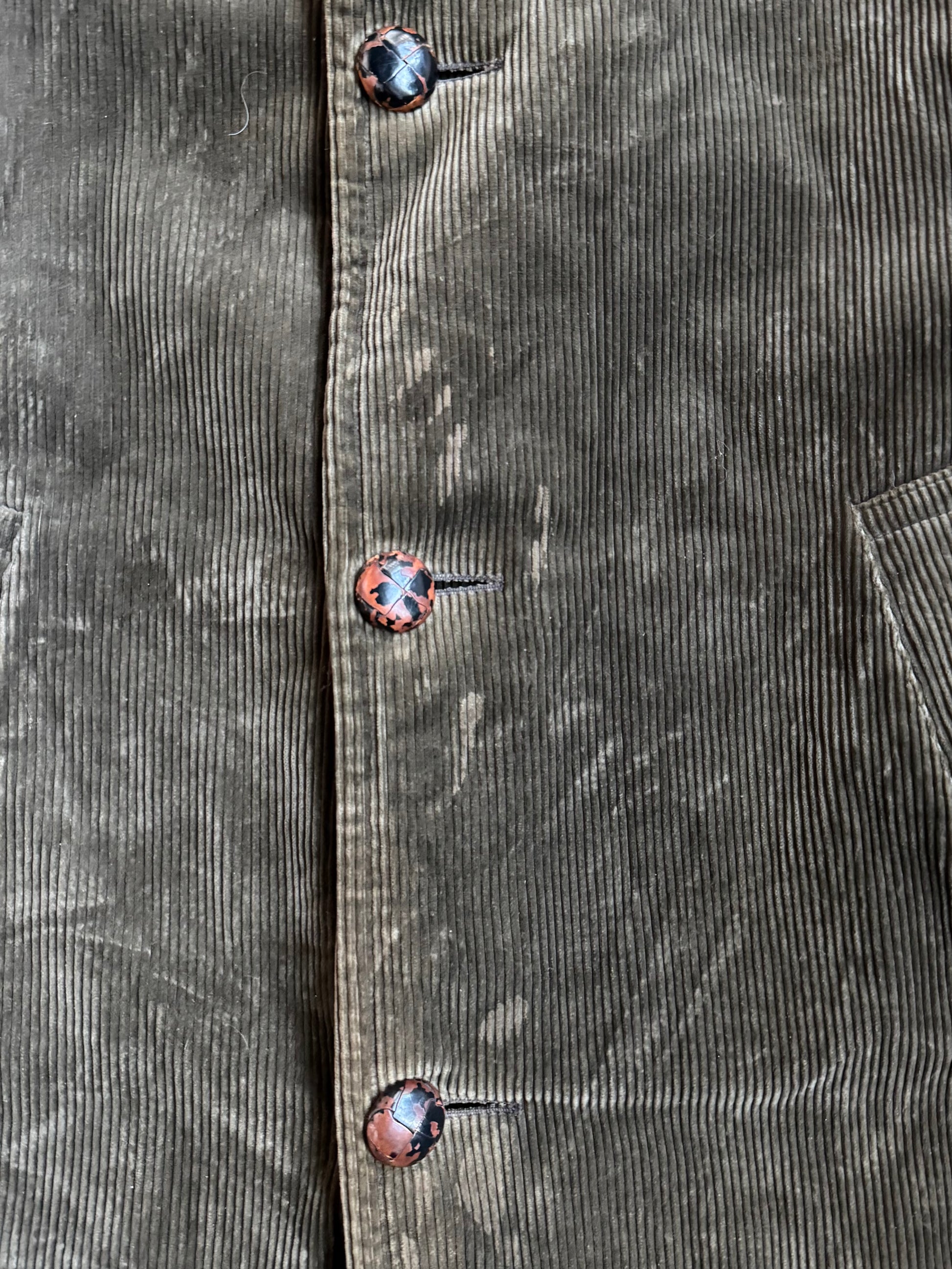 Item Condition - Cord fabric looks worn with some staining/discoloration throughout. Lining has a few small holes & bottom area has been mended with patches (see photos for imperfections).
