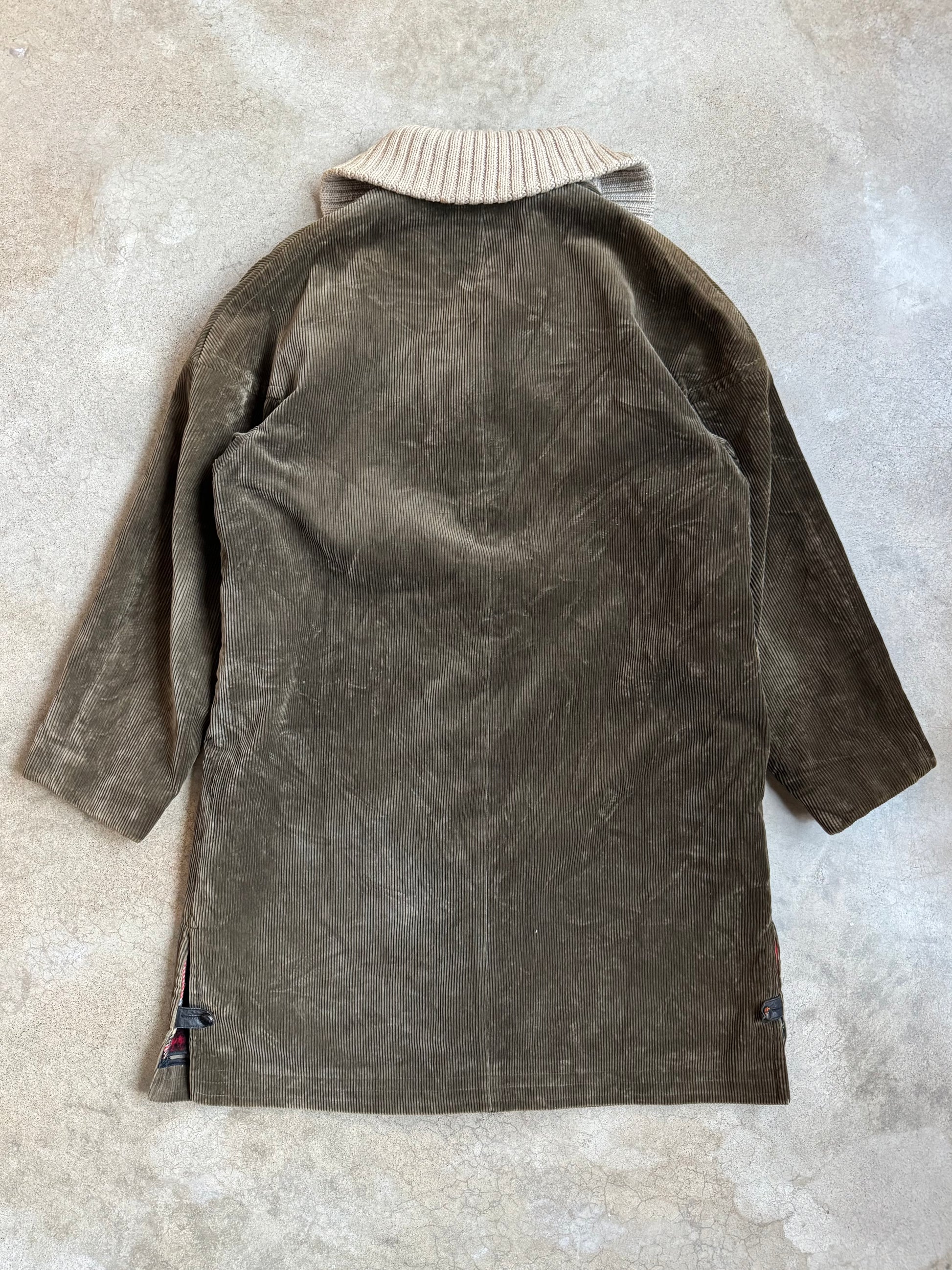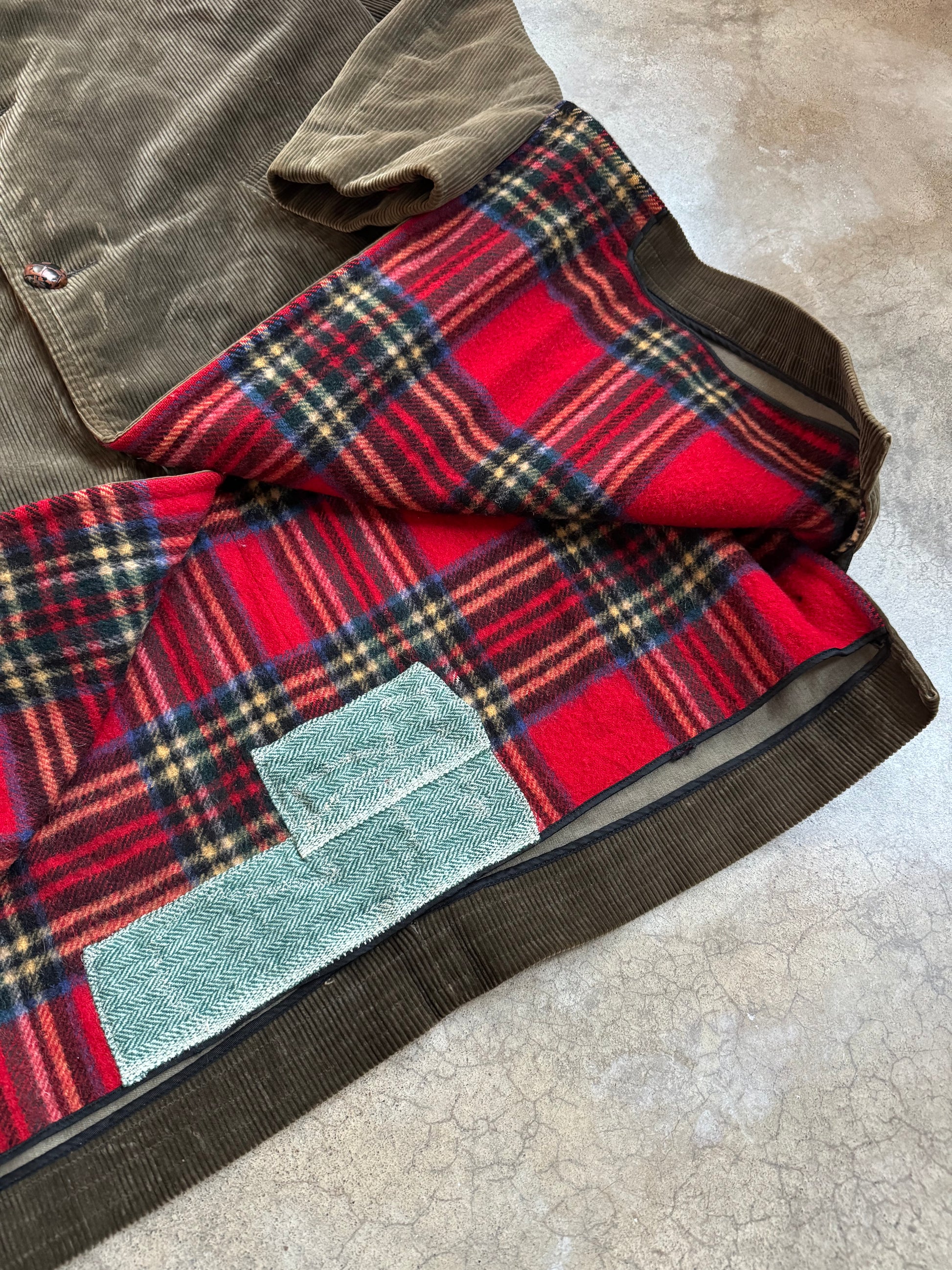 Vintage 1970s Zero King “The Goal Coat” Green Corduroy Button-Up Jacket w/ Plaid Wool Lining & Rib Knit Collar.