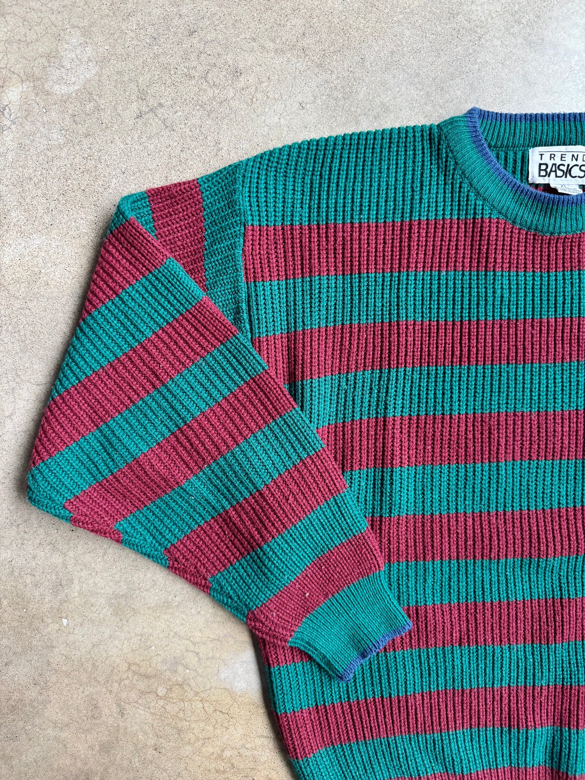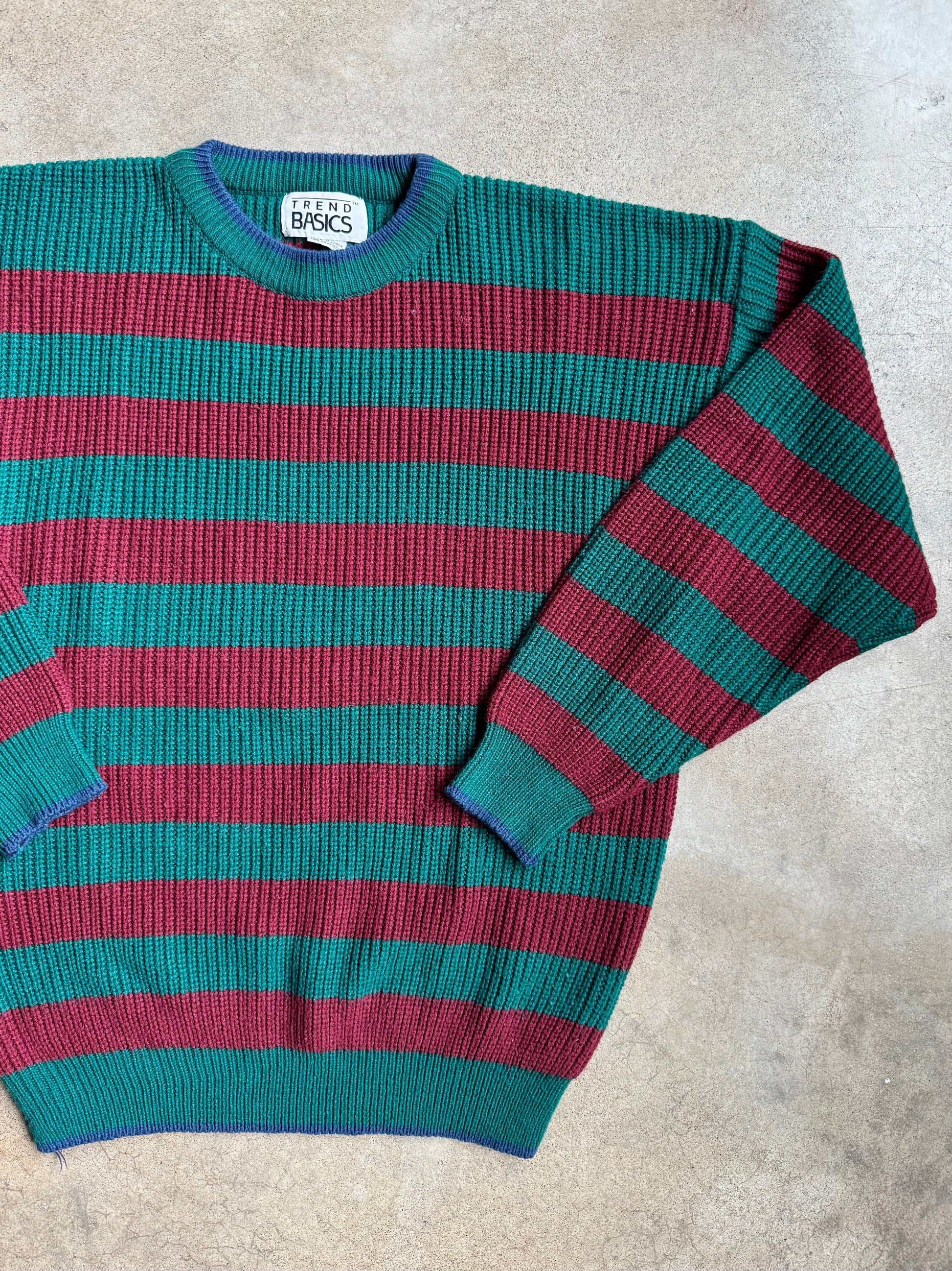 Vintage 1980s Trend Basics Burgundy & Green Striped Crewneck Sweater. 100% acrylic knit fabric.