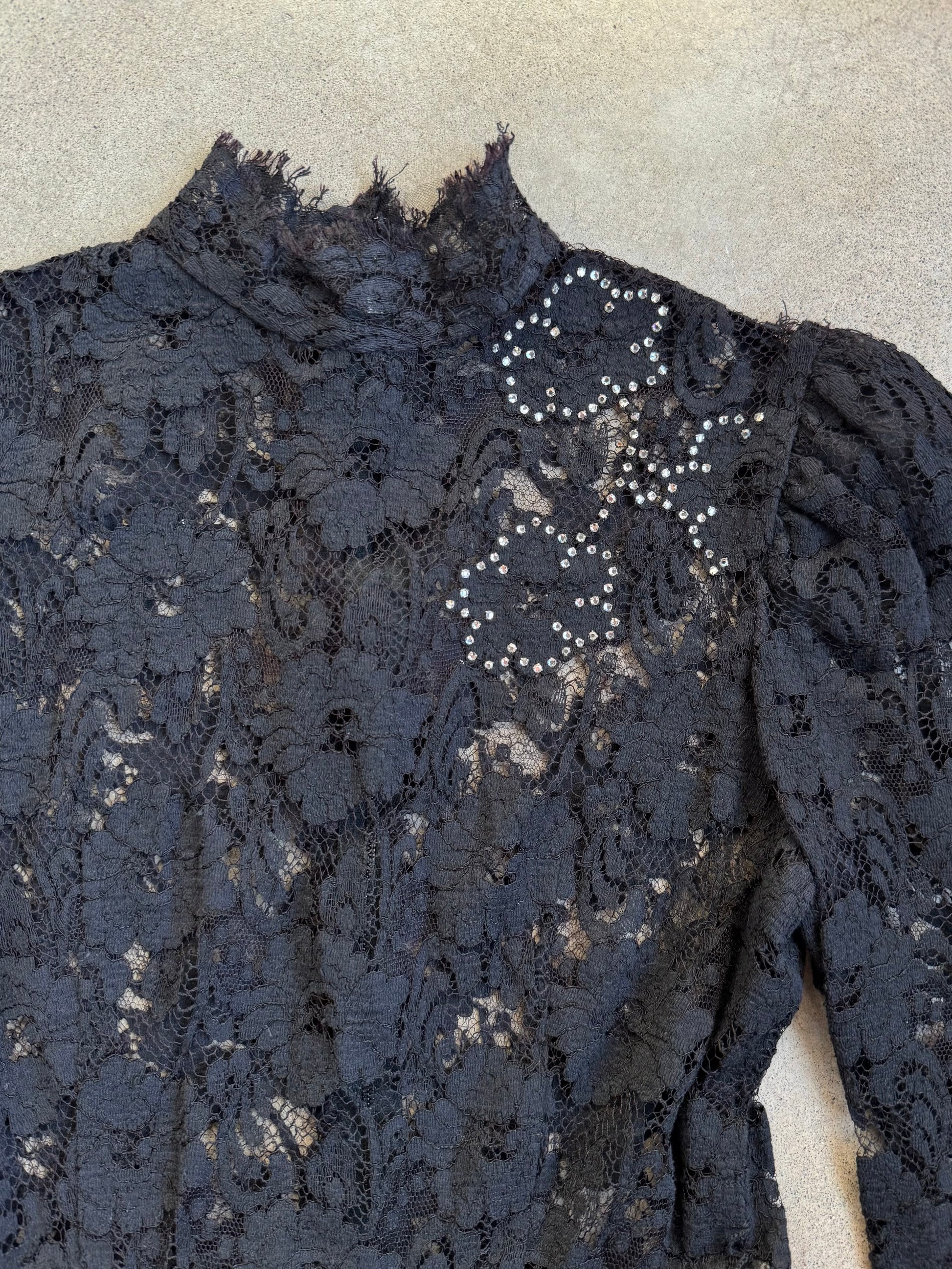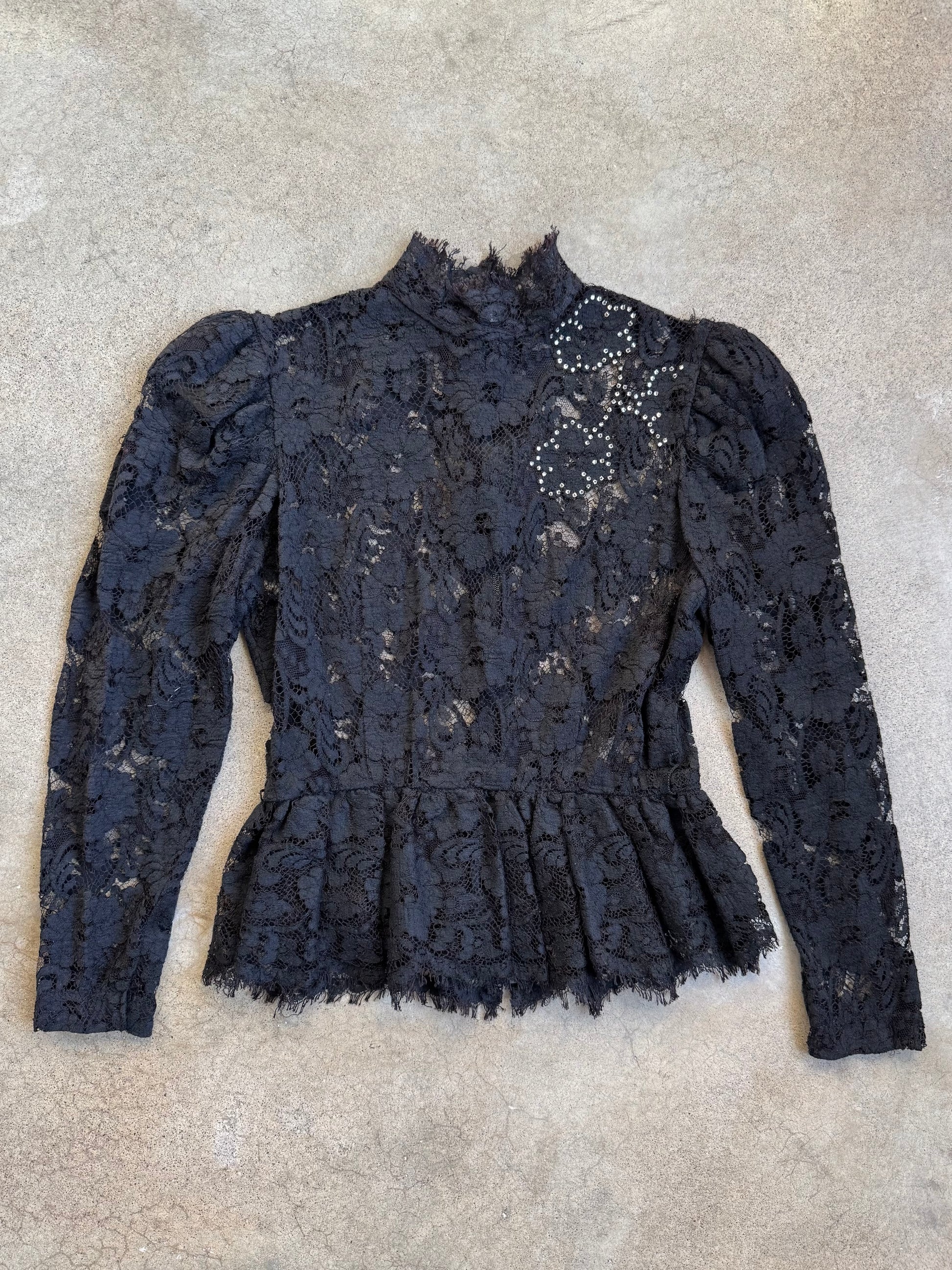 Vintage 1980s Black Lace Mesh Victorian-Style Peplum Top w/ Floral Rhinestone Detailing. Features a high-neck with hook & eye closures, puff sleeve detailing at shoulder & a zipper closure at back.