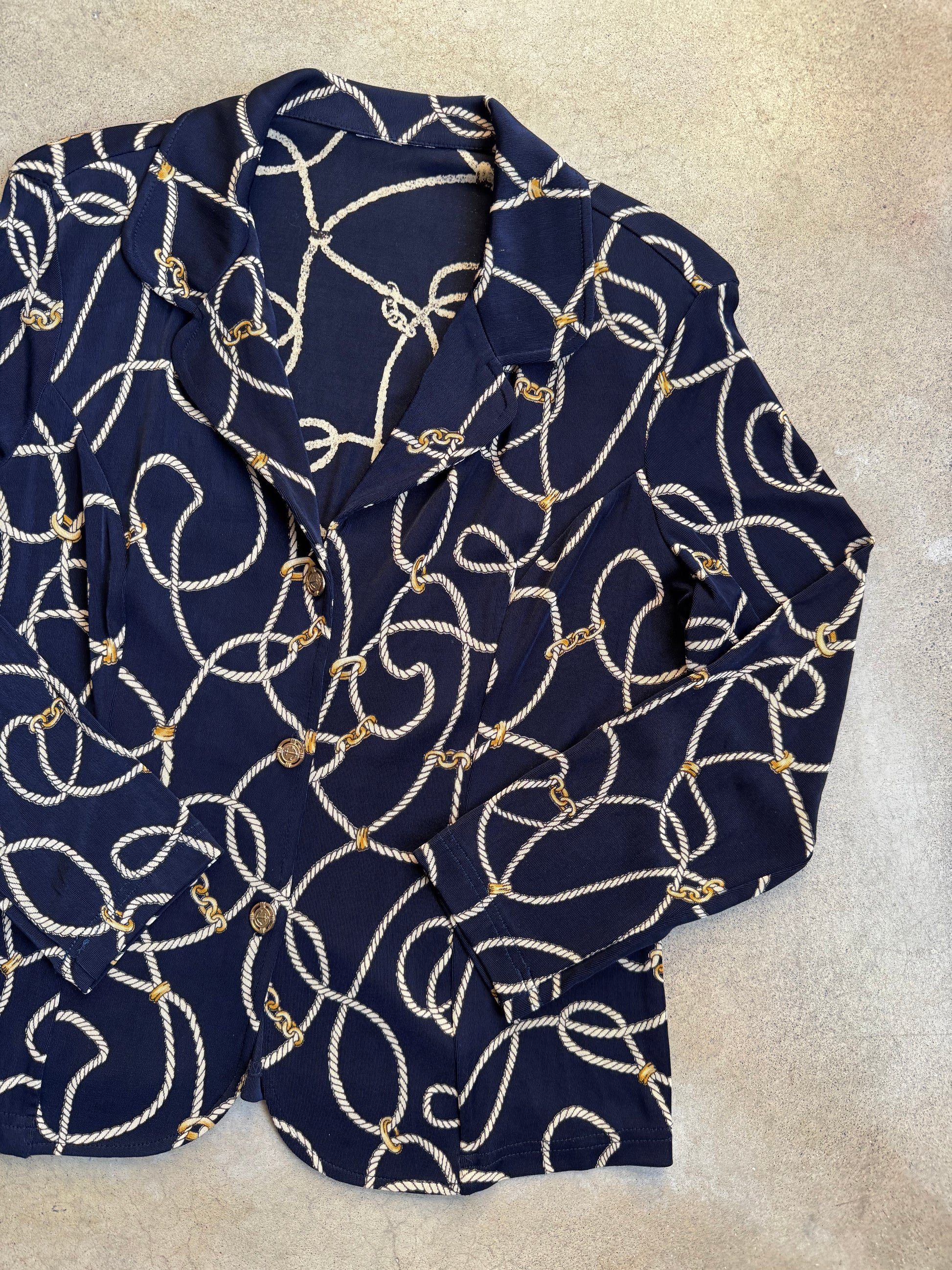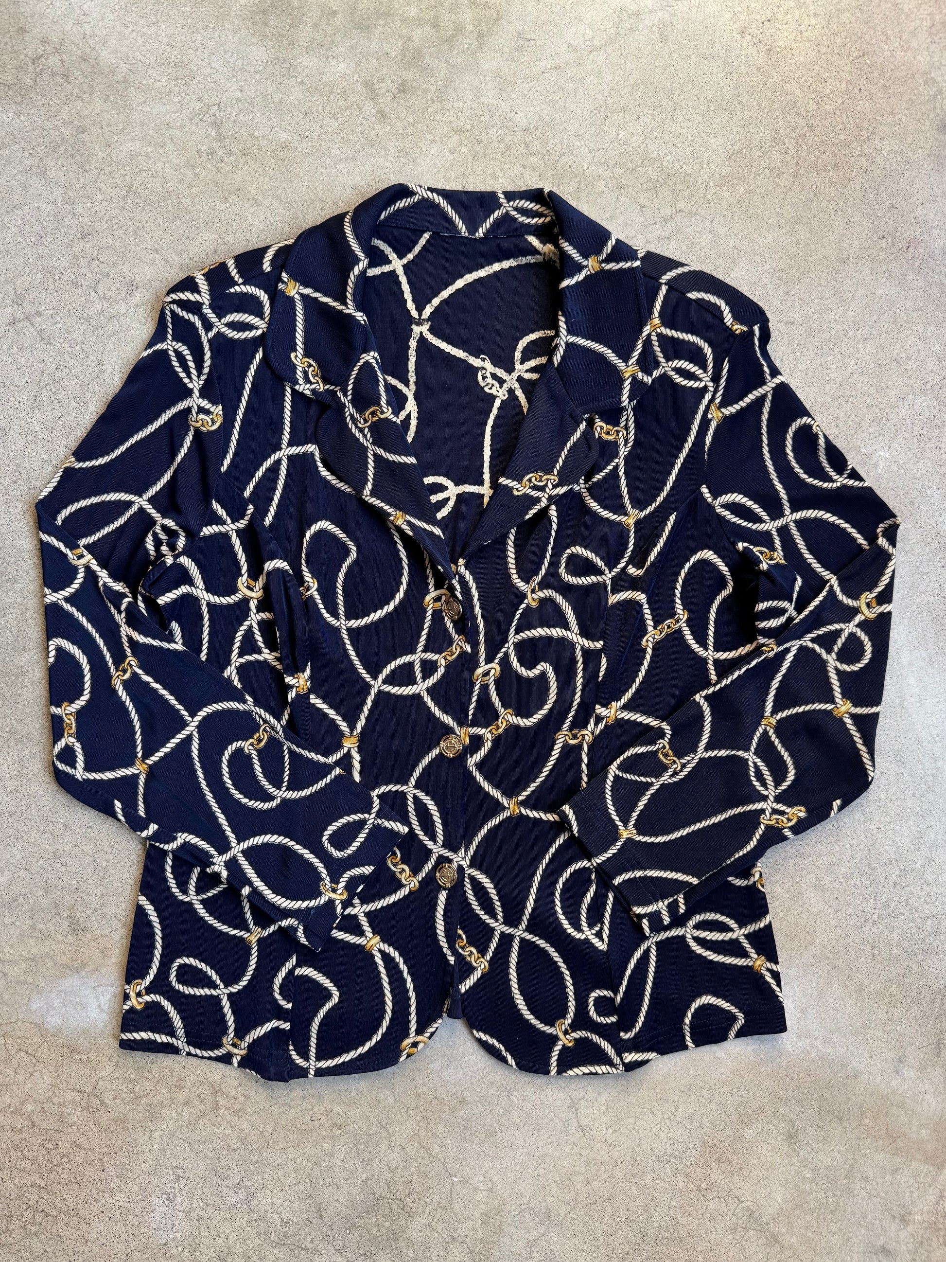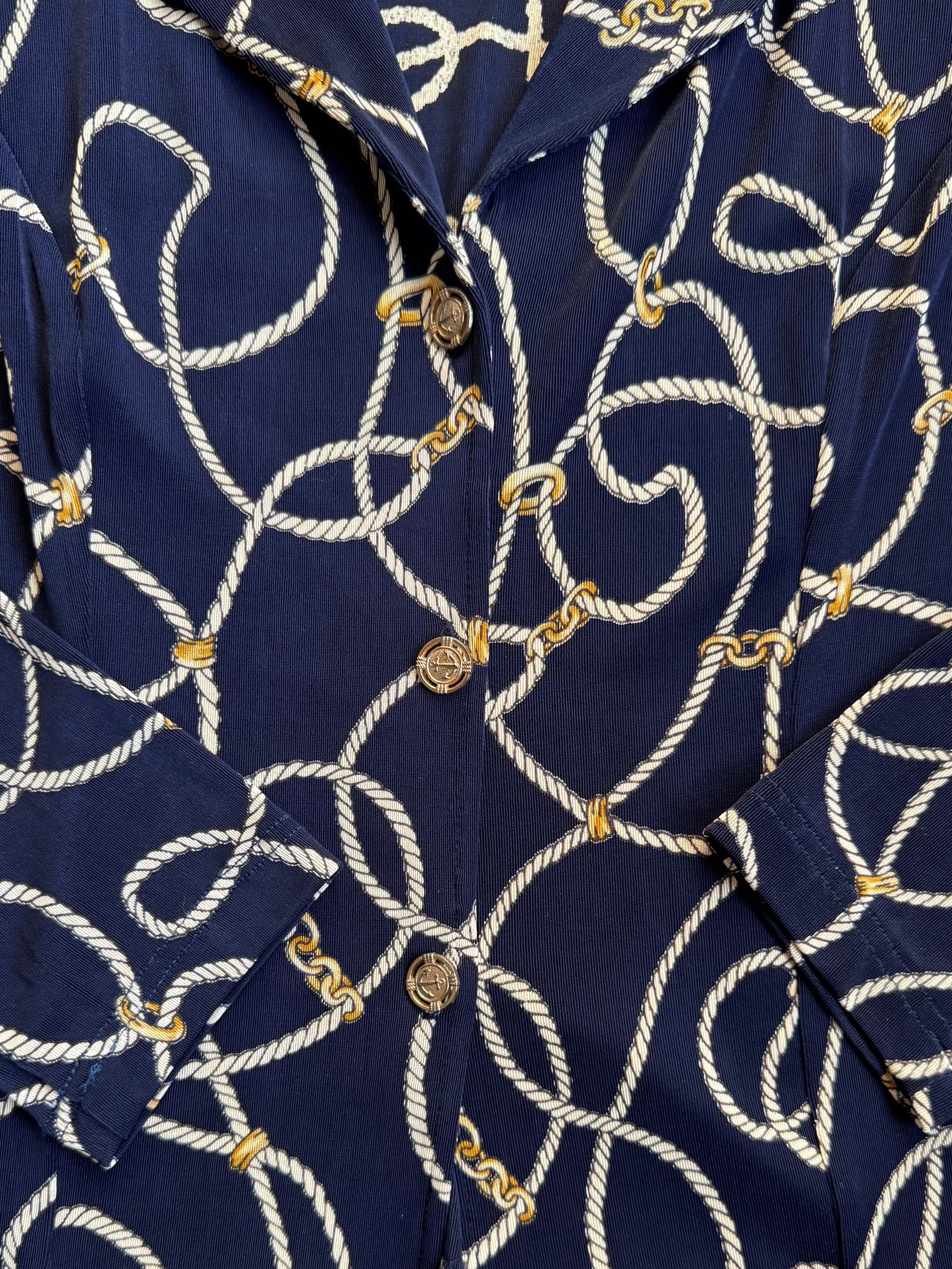 Vintage 1980s Navy Blue Nautical Rope & Gold Chain Print Slinky Blouse.