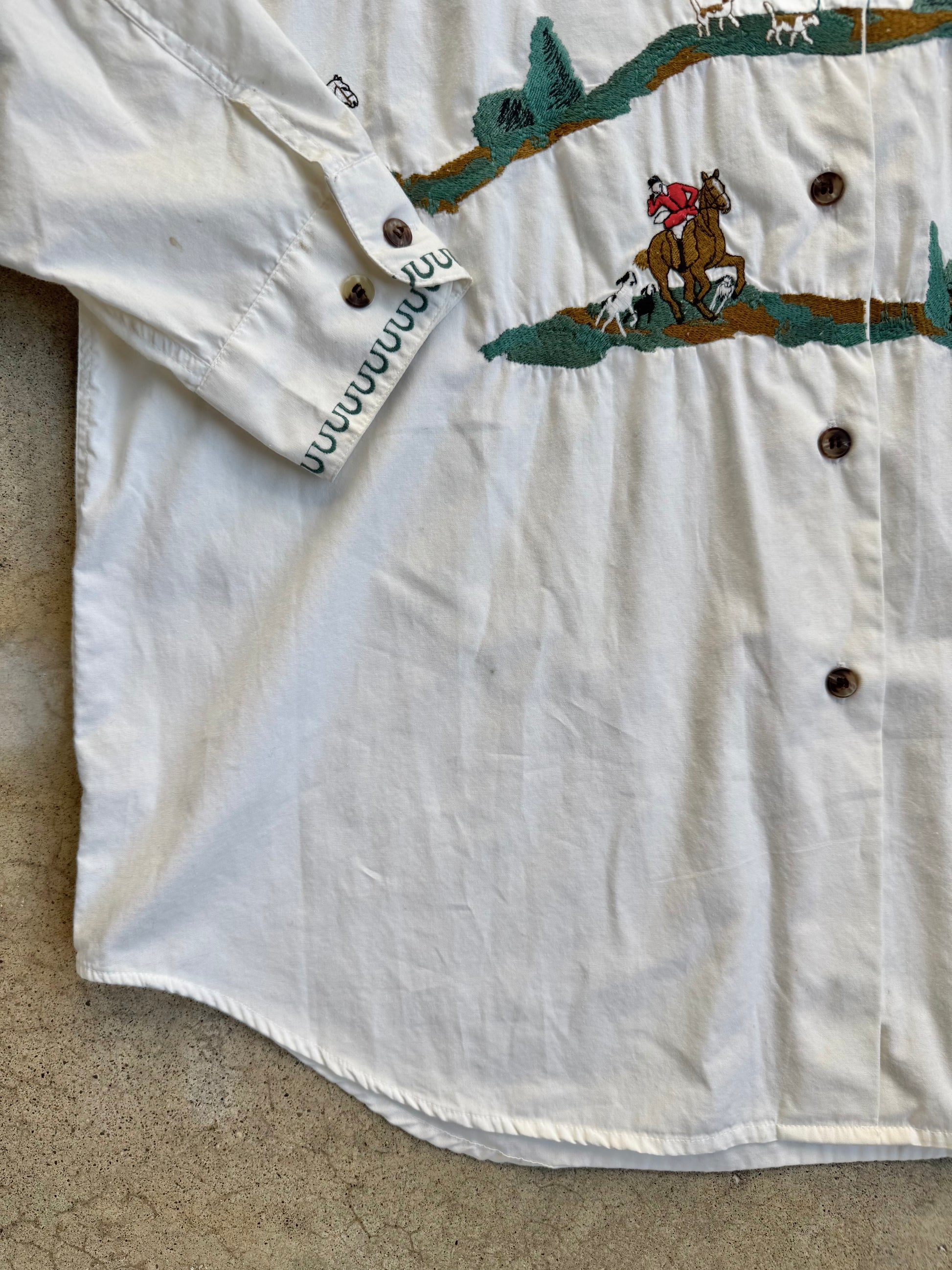 Vintage 1980s Cambridge Dry Goods Equestrian Embroidered Button-Up Shirt | M/L