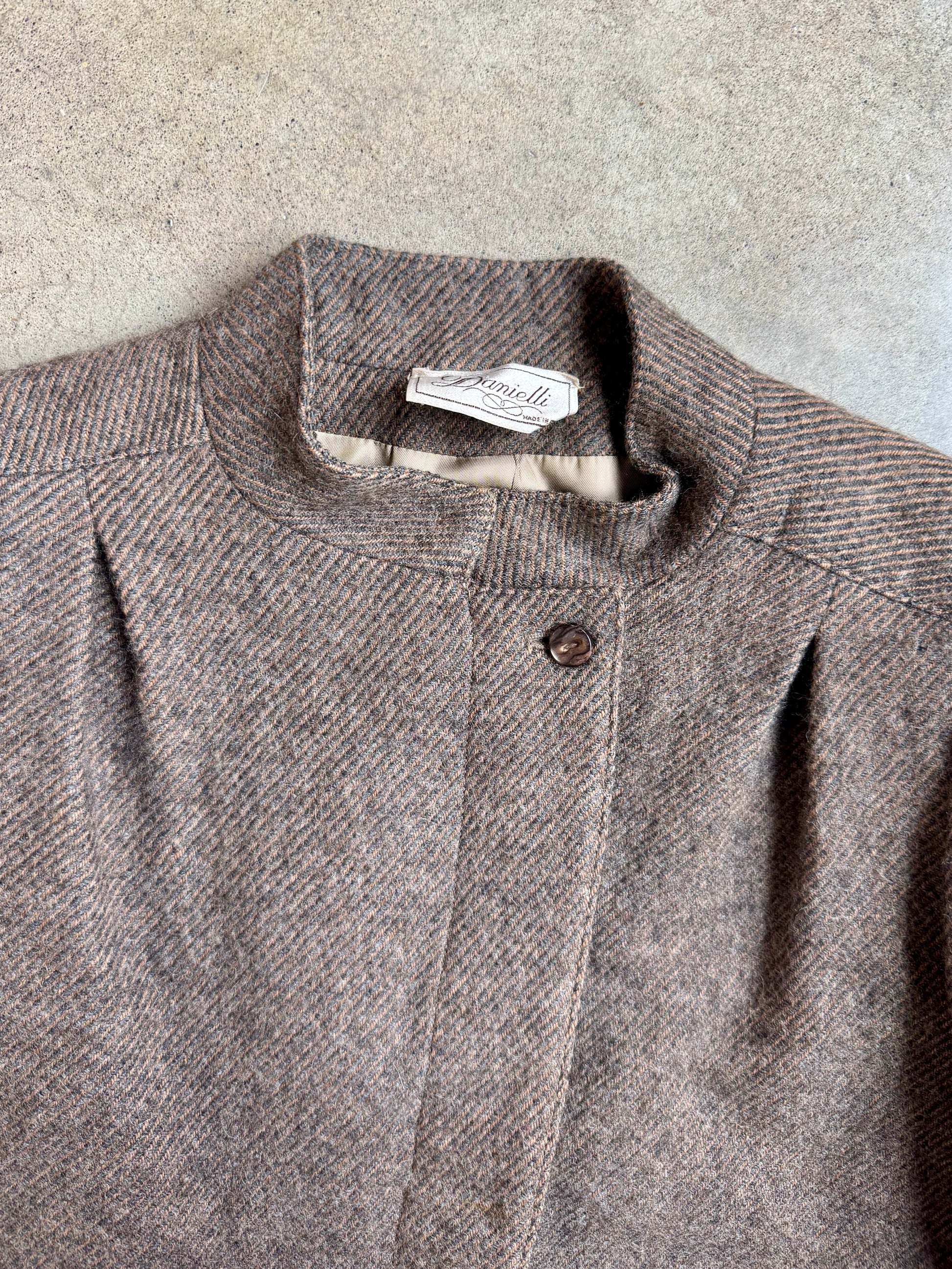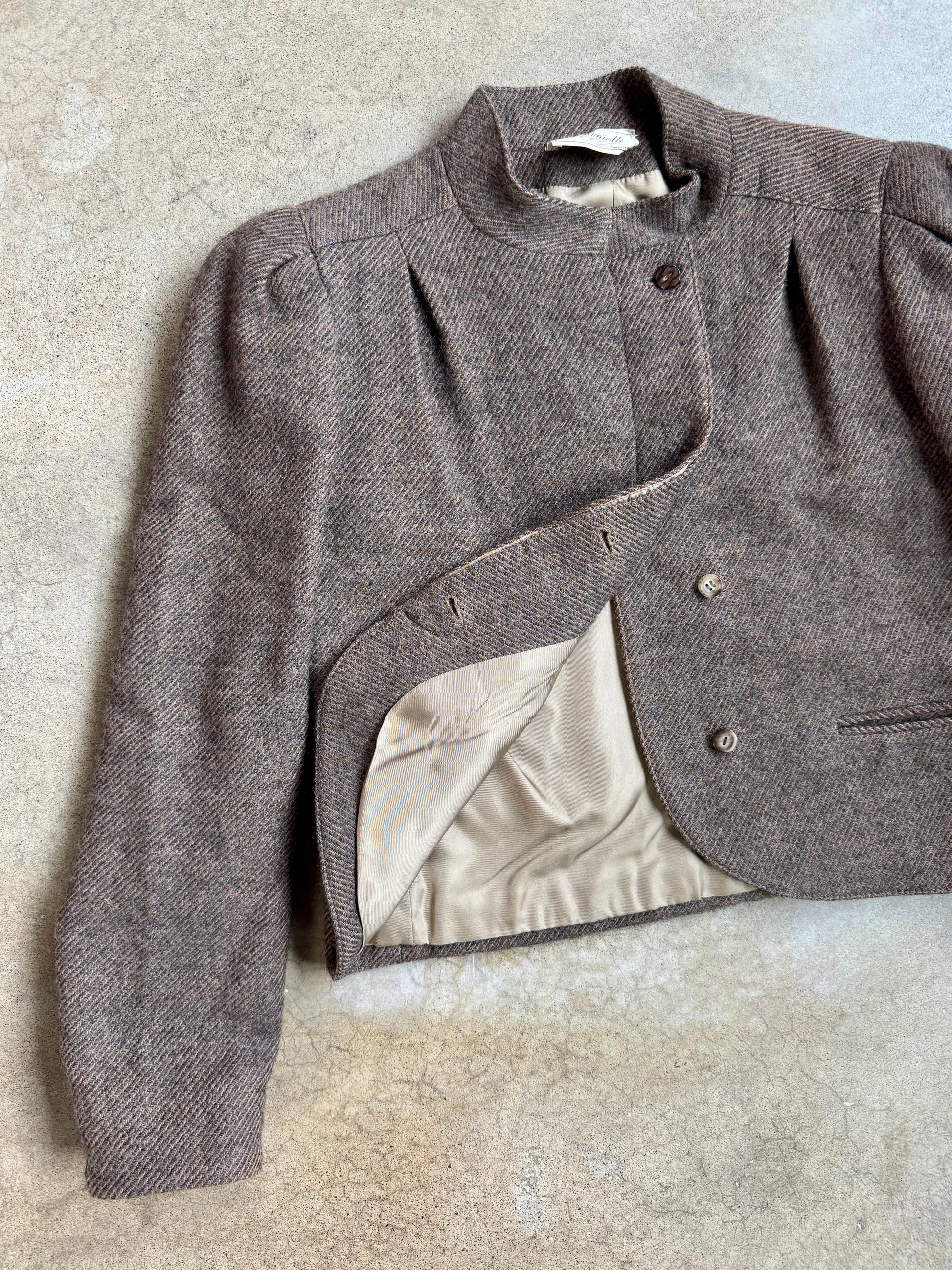 Vintage 1980s Danielli Italian Brown Wool Tweed Two-Piece Skirt Suit. Both pieces are fully lined.