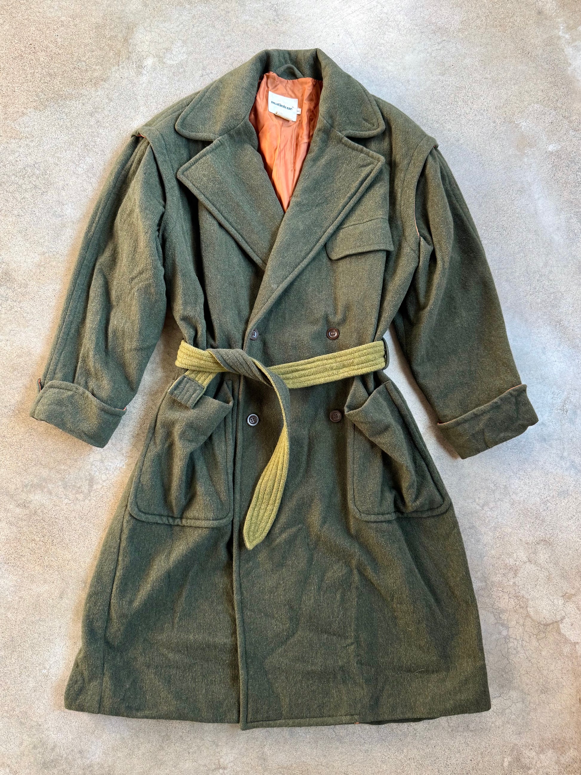 Vintage 1980s Matinique Green Wool Blend Trench-Style Overcoat w/ Tie Waist Belt. Oversized fit.