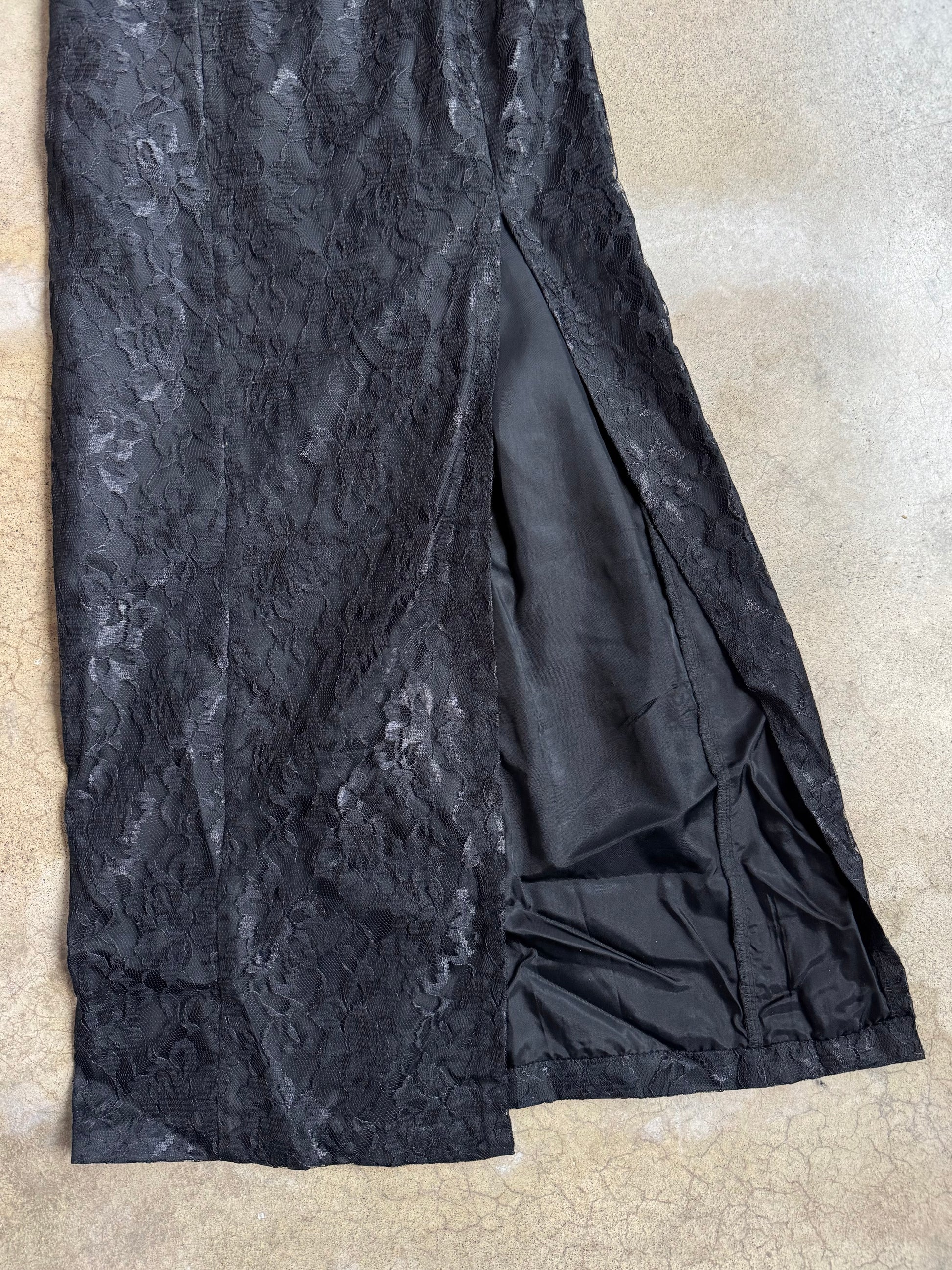Vintage 1980s L.A. Glo Black Lace High-Slit Formal Dress | XS