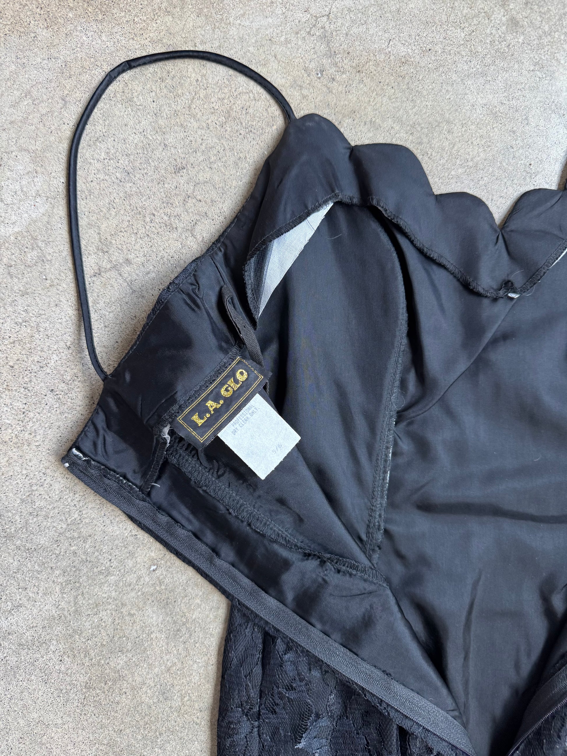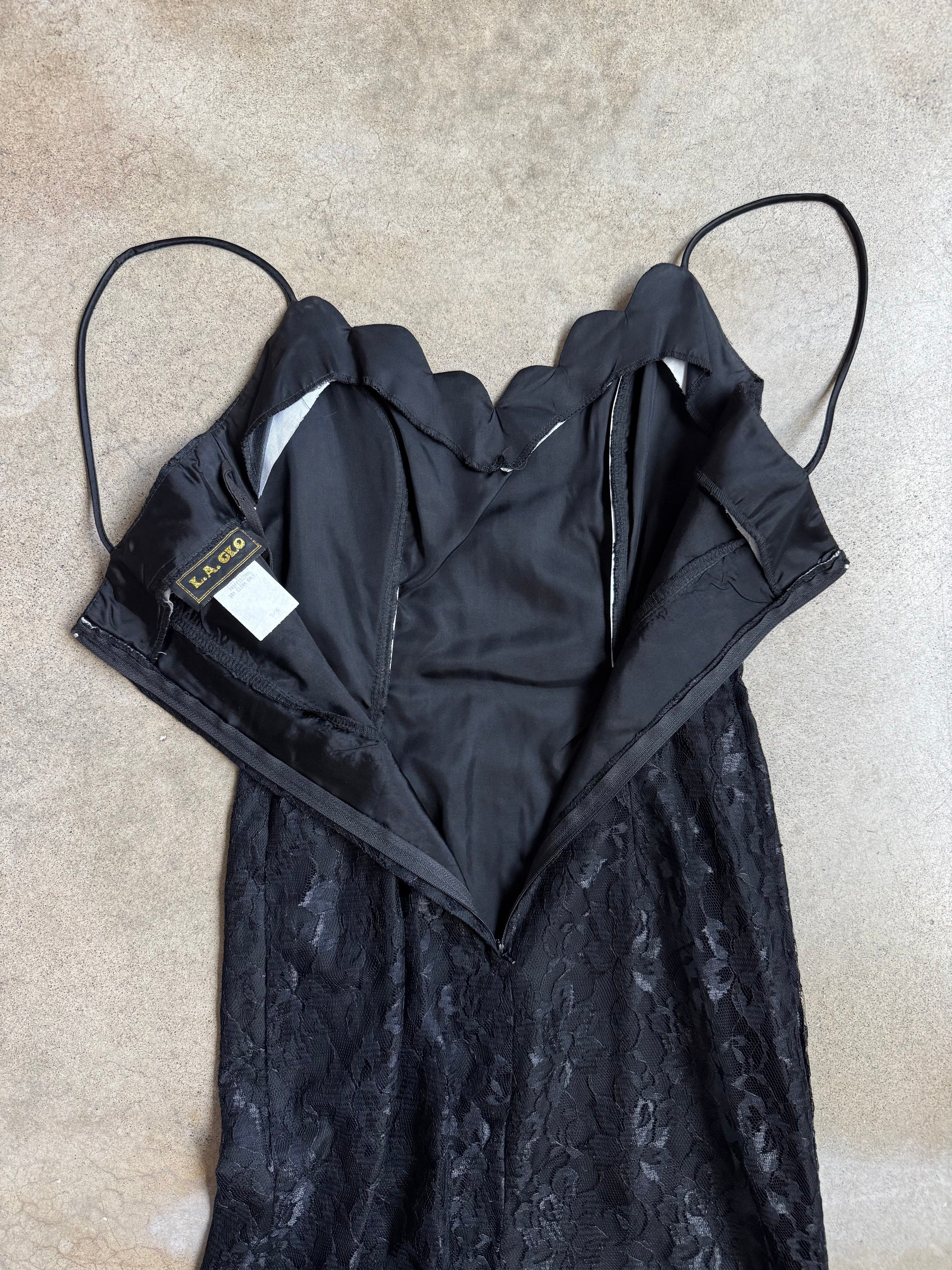 Vintage 1980s L.A. Glo Black Lace Thin Strap Formal Dress w/ High-Slit & Scalloped Neckline. Features structured boning around bodice and zipper closure at back. Fully lined.