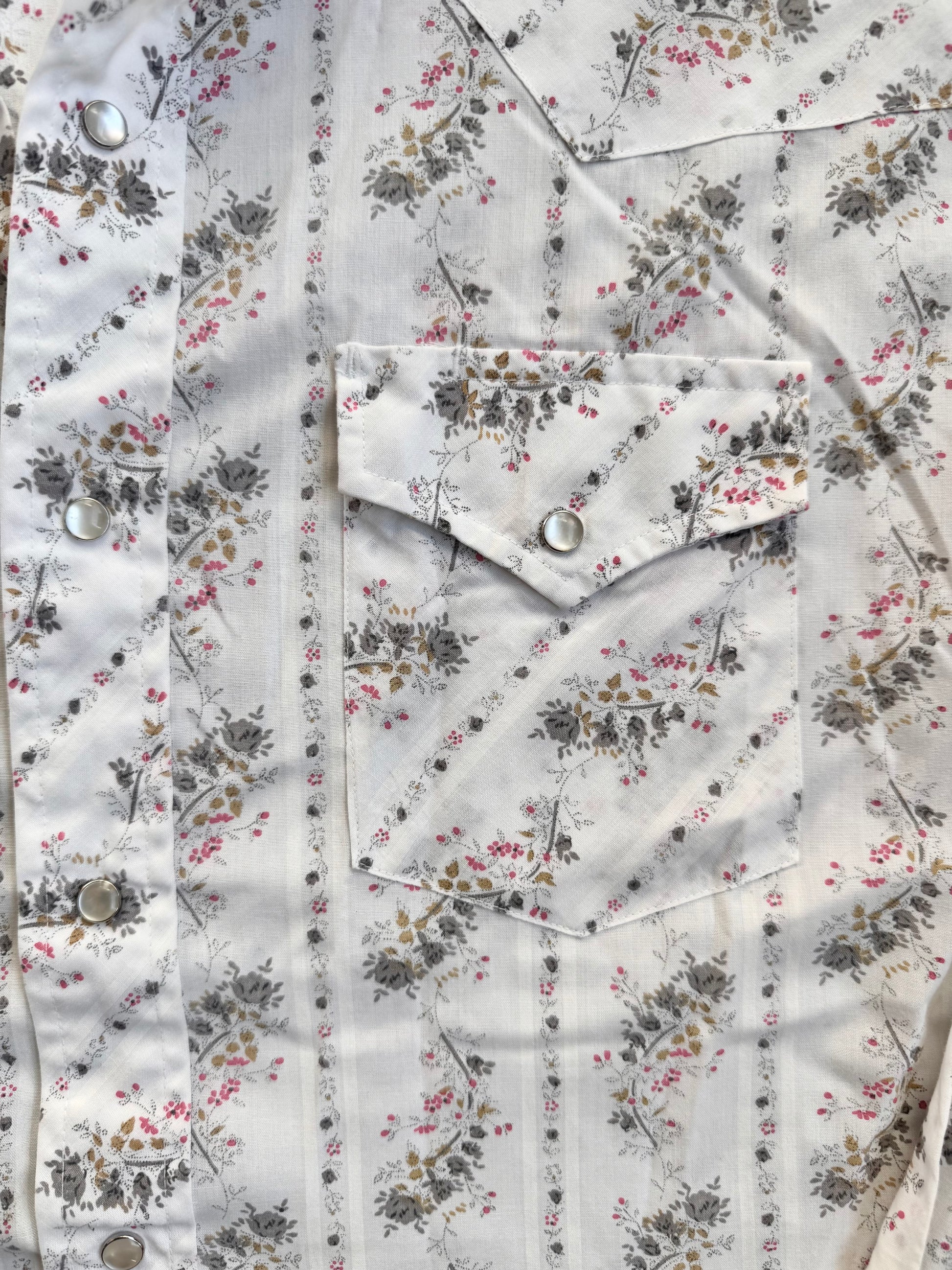 Vintage 1980s Corral West Ranchwear Pink Floral Button-Up Pearl Snap Western Shirt. Lightweight poly-cotton fabric.