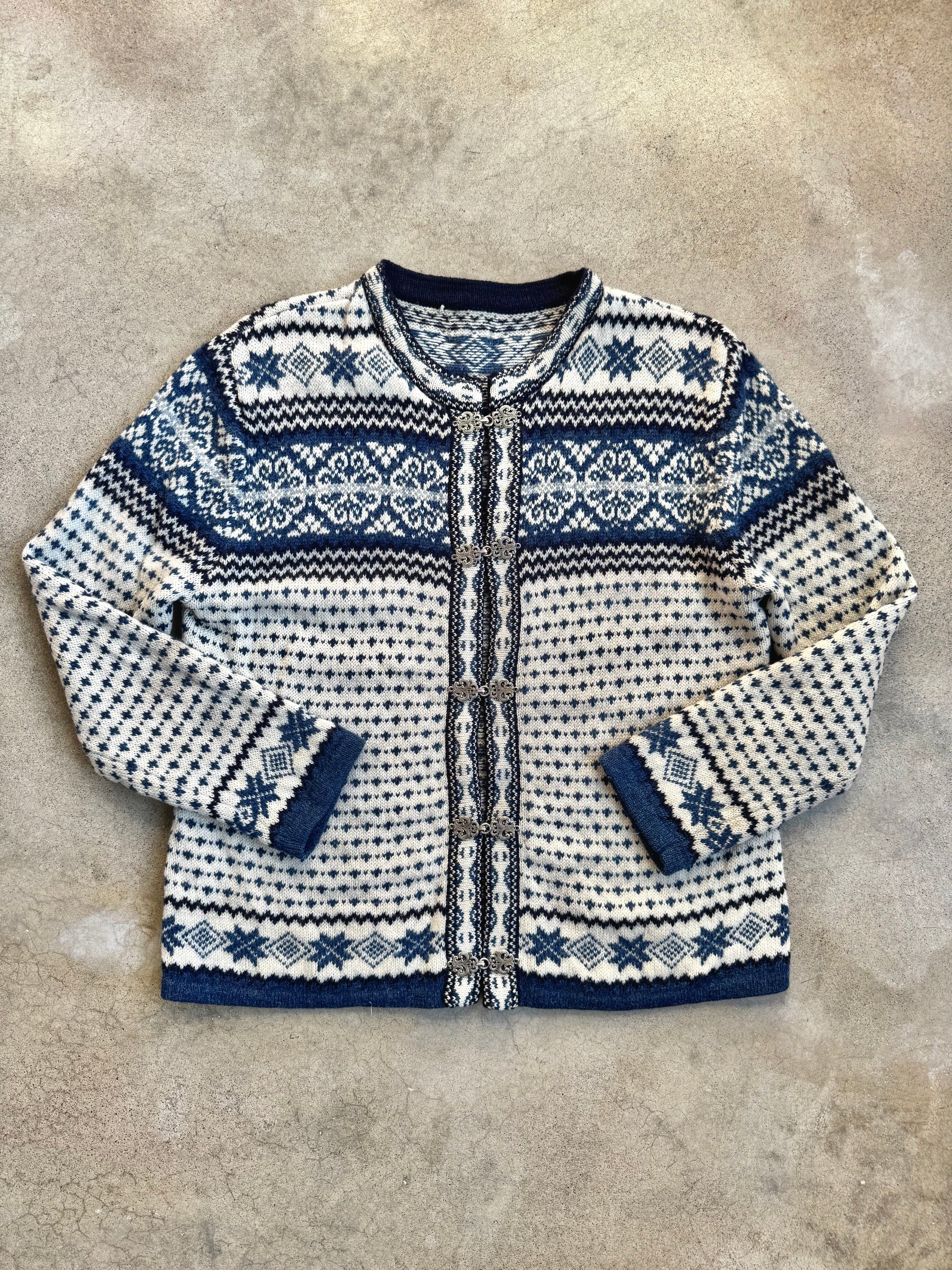 Vintage 1980s Nordic Blue & White Fair Isle Metal Clasp Wool Cardigan | M/L