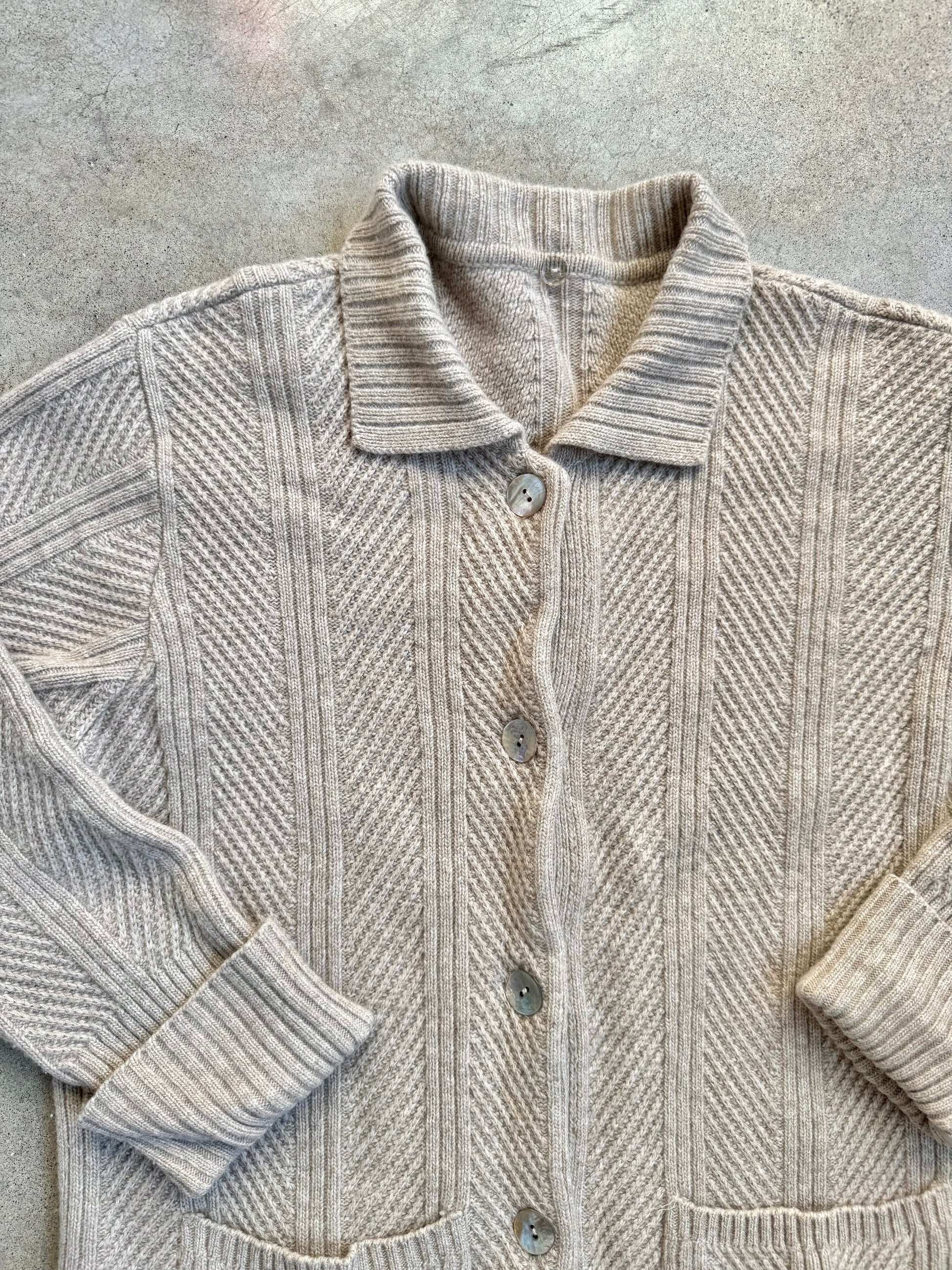 Vintage 1980s Beige Wool Knit Maxi-Length Cardigan Sweater Jacket.