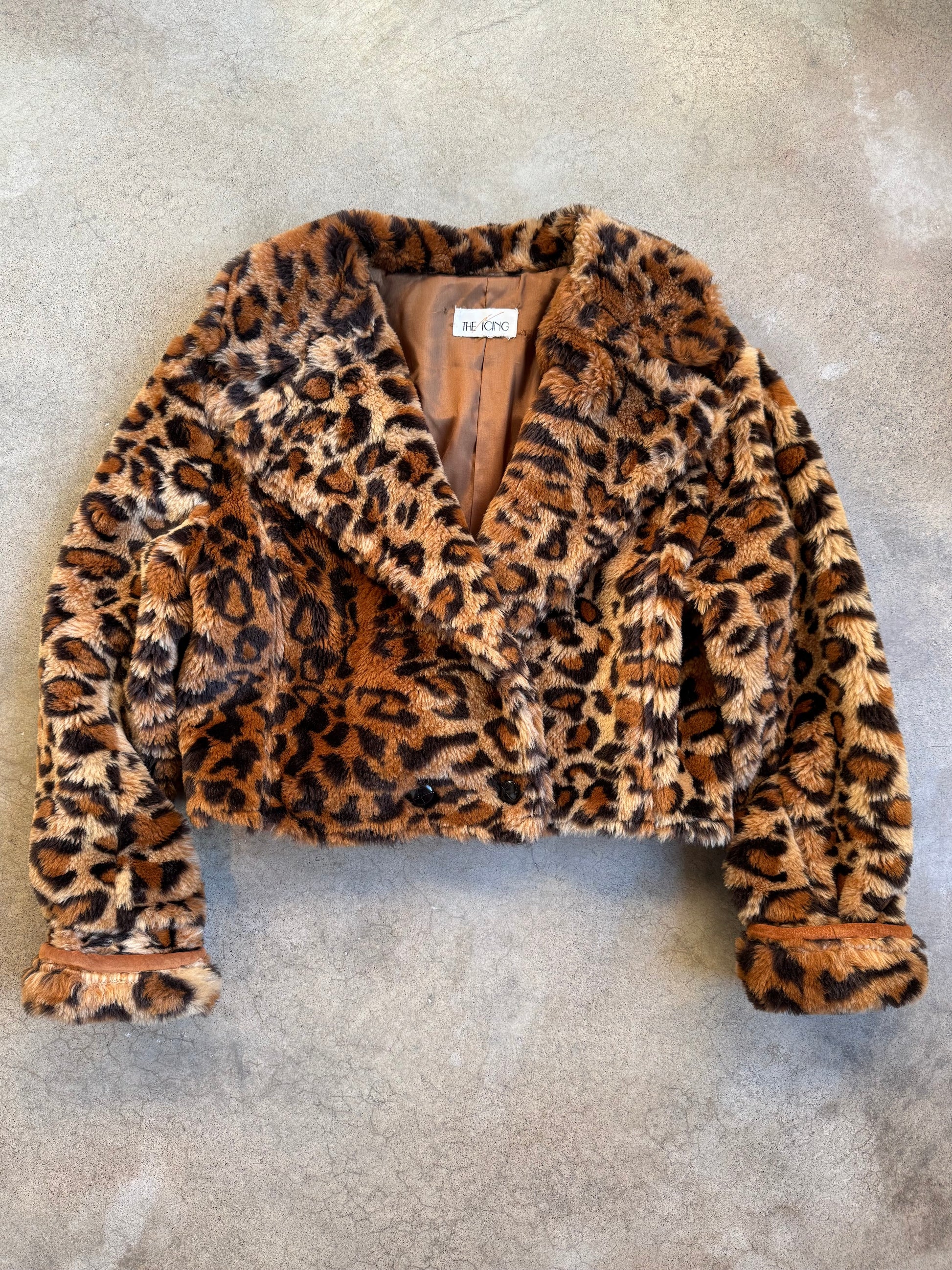 Vintage 1980s The Icing Leopard Animal Print Faux Fur Cropped Jacket.
