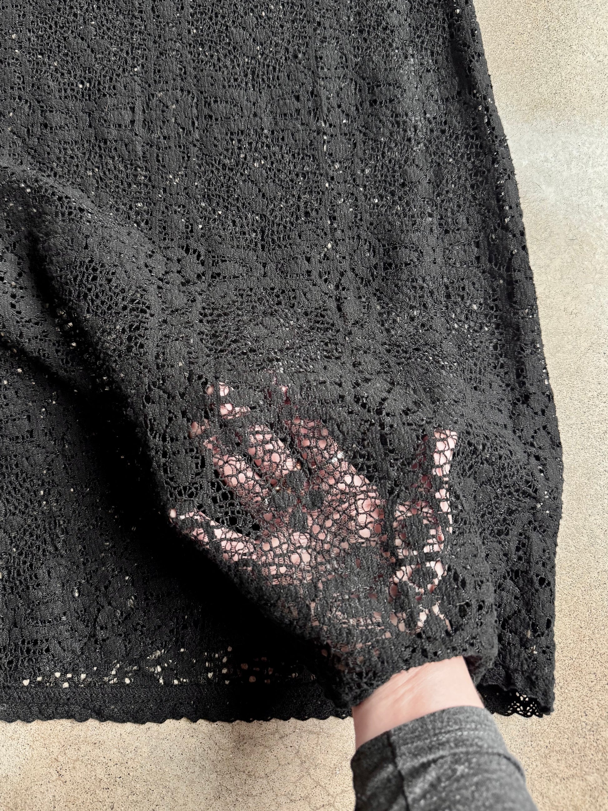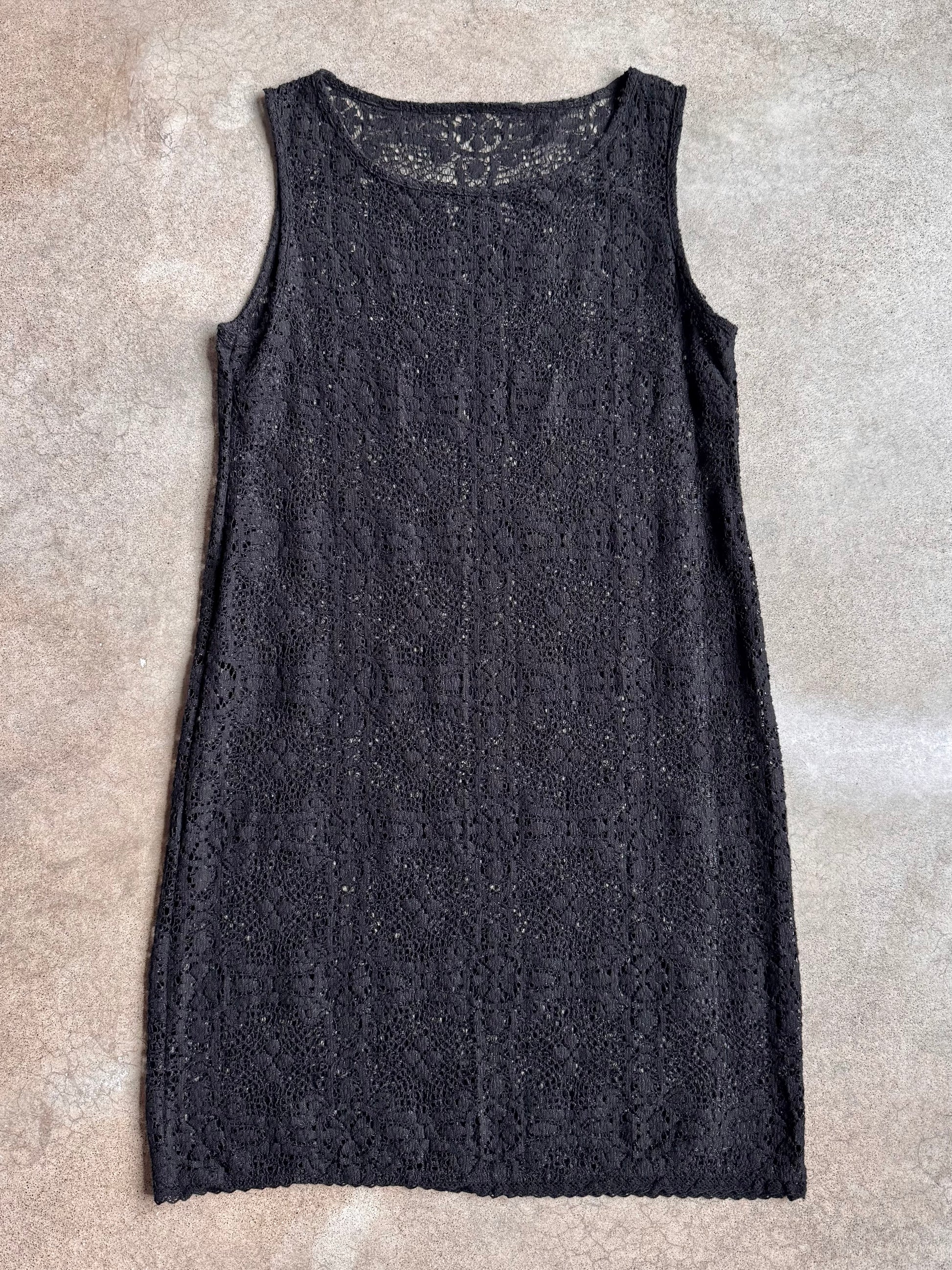 Vintage 1990s Black Crochet Lace Sleeveless Shift-Style Dress. Open-crochet (see-through), does not have a slip underneath.