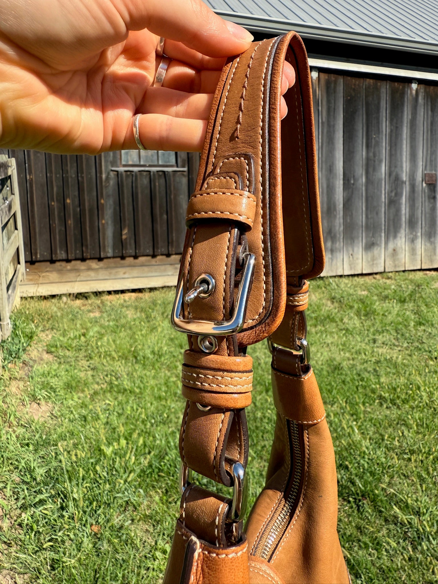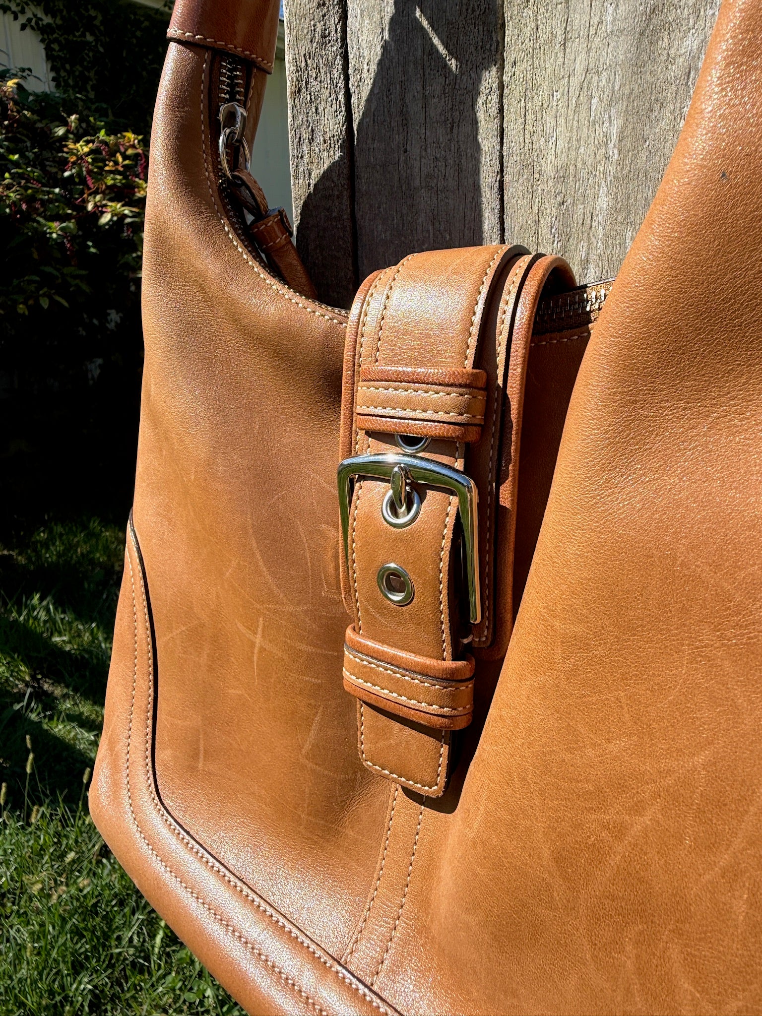 Vintage 2000s Coach Hampton Soho (Style No. 7463) Tan Leather Hobo Shoulder Bag w/ Silver Buckle.