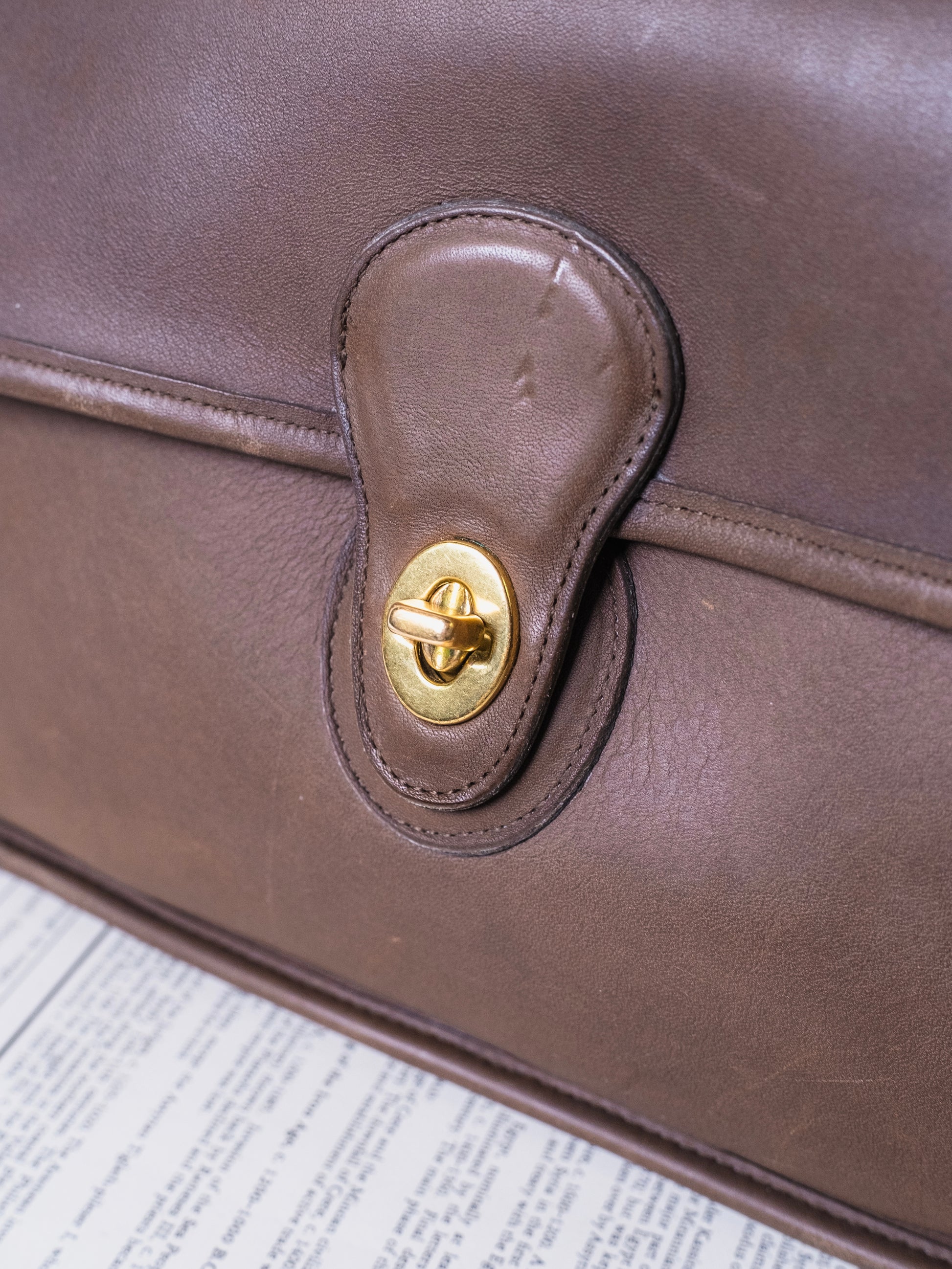 Vintage 1990s Coach Willis Bag (Style No. 9927) in Taupe. Features a turnlock closure with inside zipper pocket, outer front & back pockets, and an adjustable crossbody/shoulder strap (removable).