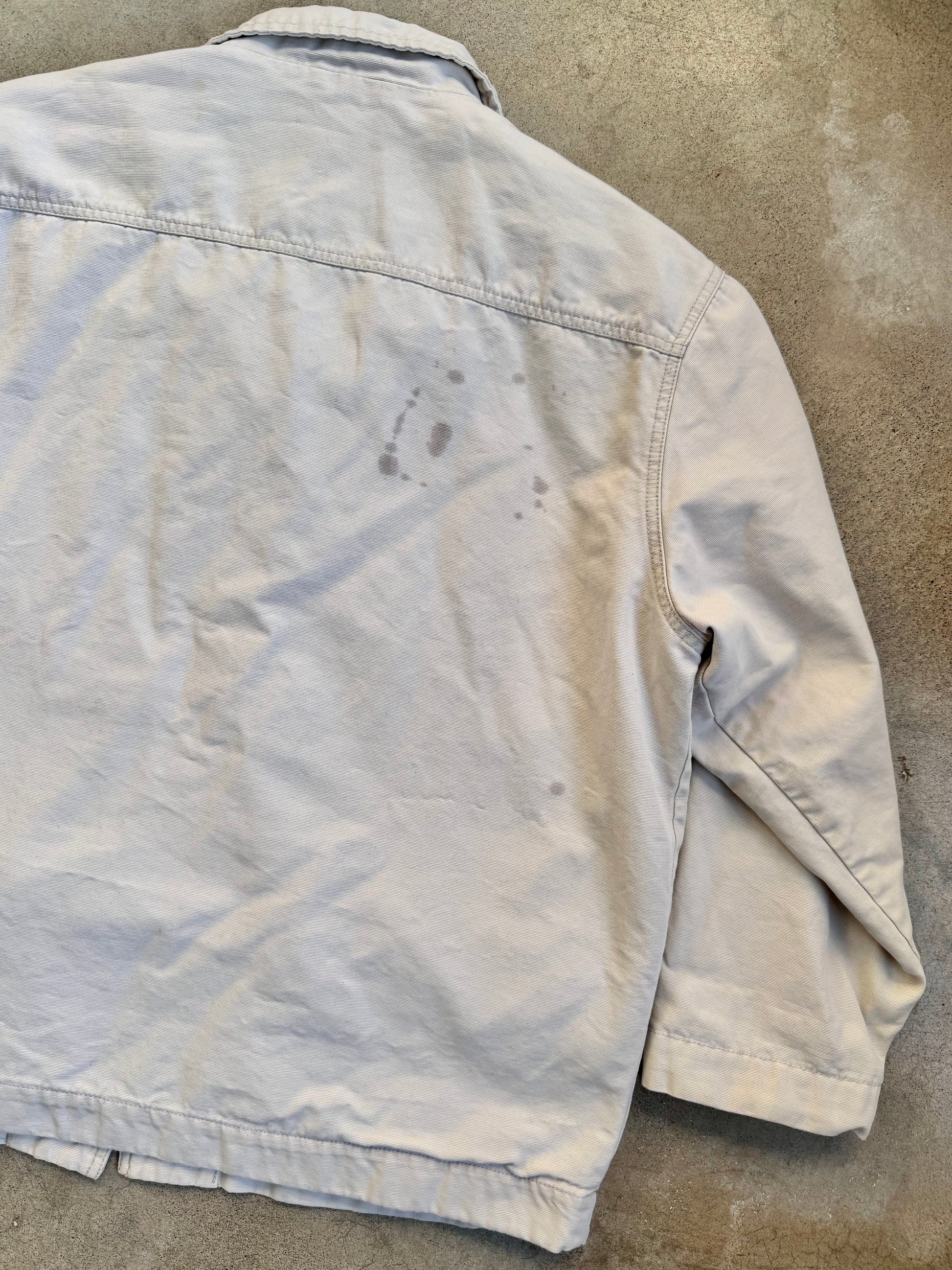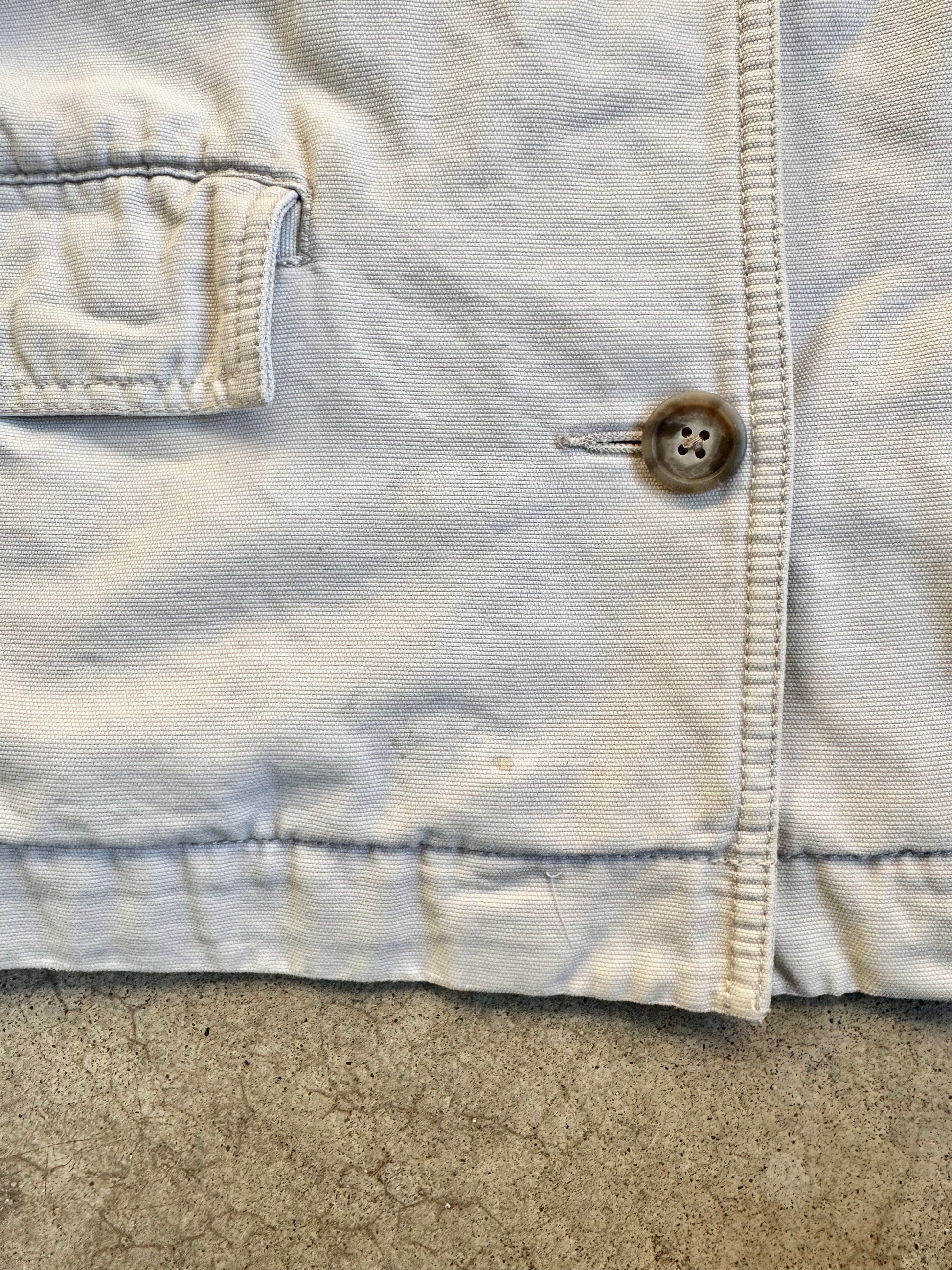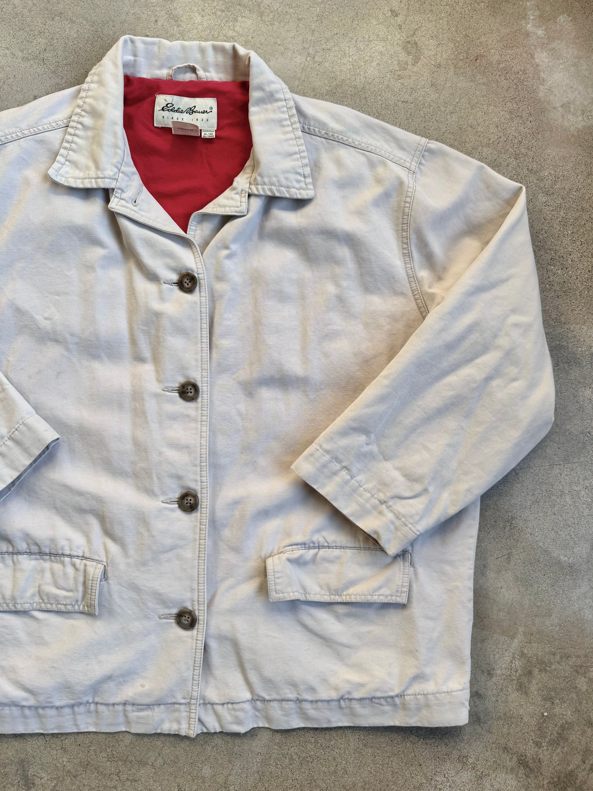 Vintage 1990s Eddie Bauer Beige Canvas Chore Jacket w/ Red Cotton Lining.