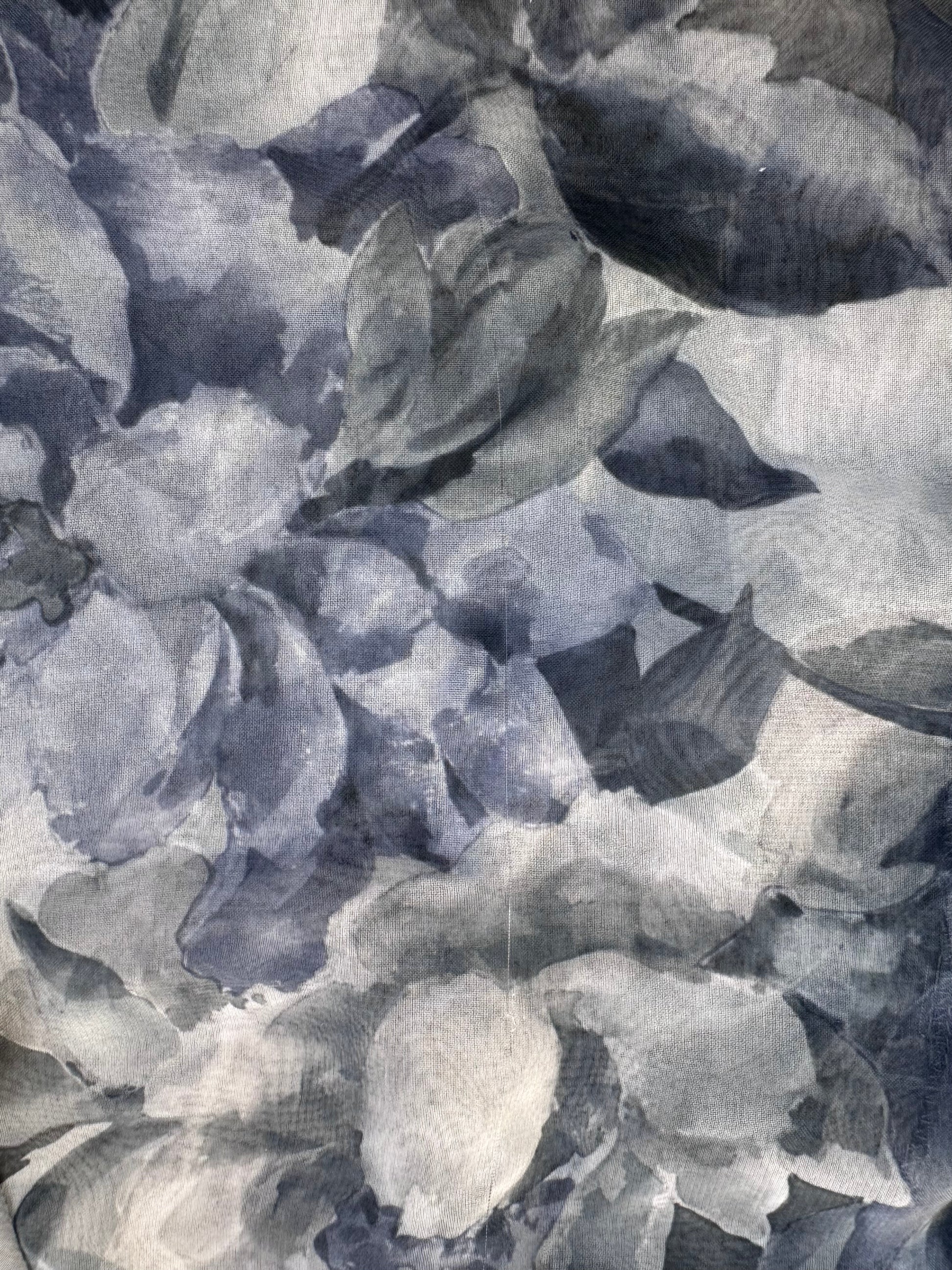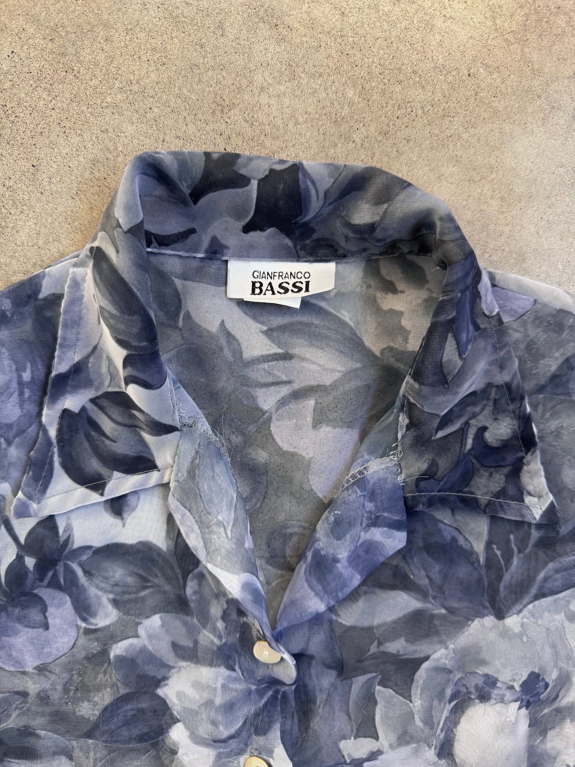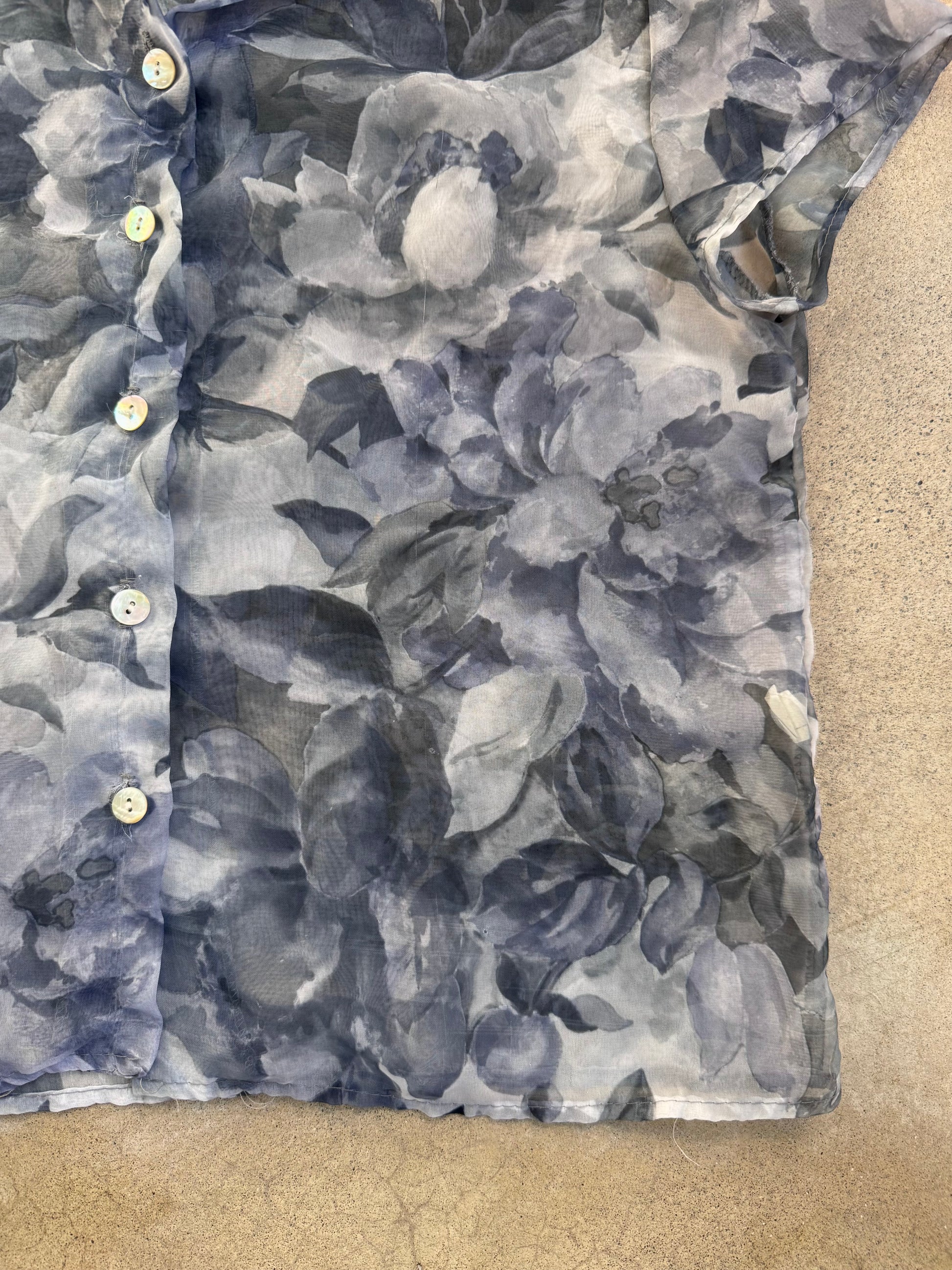Vintage 1990s Gianfranco Bassi Sheer Muted Blue & Grey Floral Short Sleeve Blouse.
