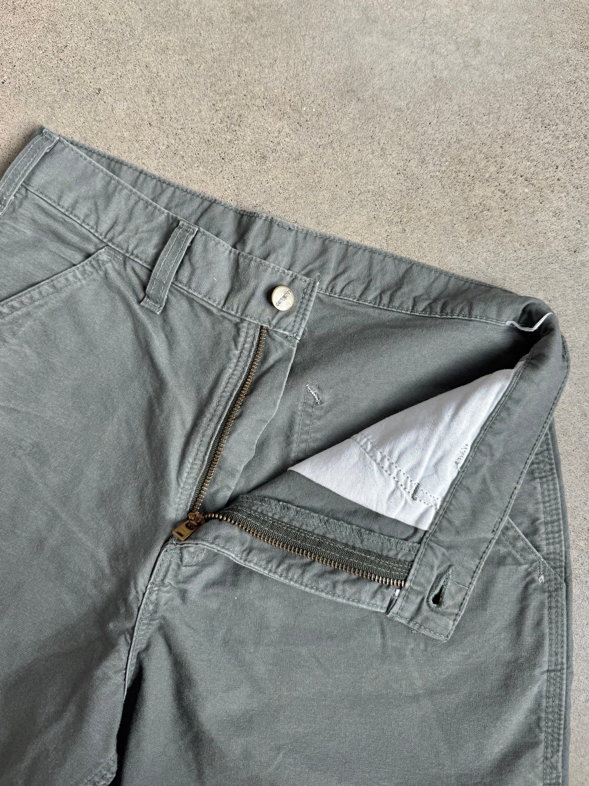 Vintage 1990s Carhartt Grey Canvas Utility Work Shorts. Features a zipper fly with button closure. Worn in, 100% cotton fabric.