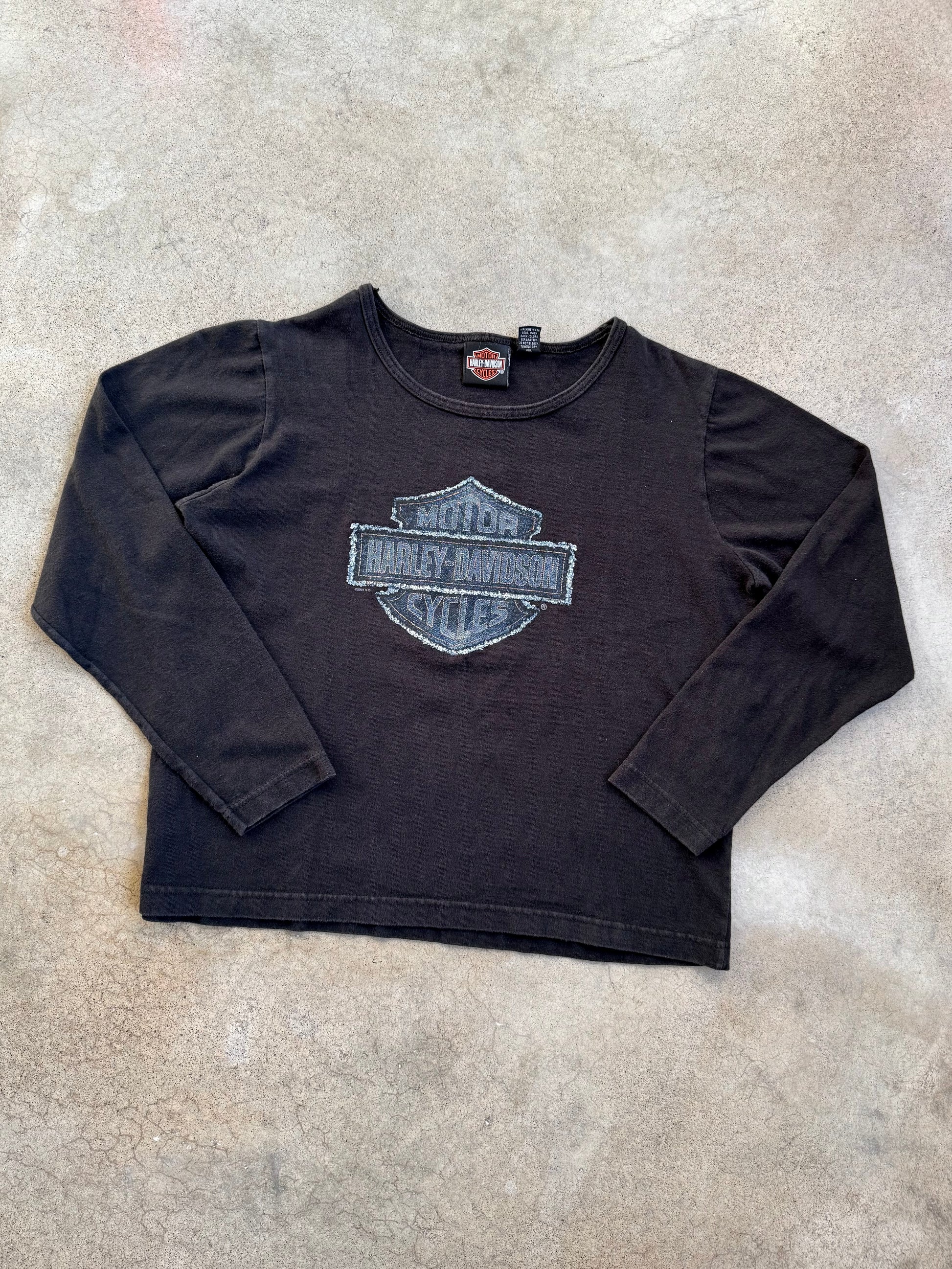 2000s Boston Harley Davidson Black Long Sleeve Graphic Tee. Features front denim printed graphic & Boston Harley embroidery at back. Relaxed, boxy women’s fit. 100% cotton fabric.
