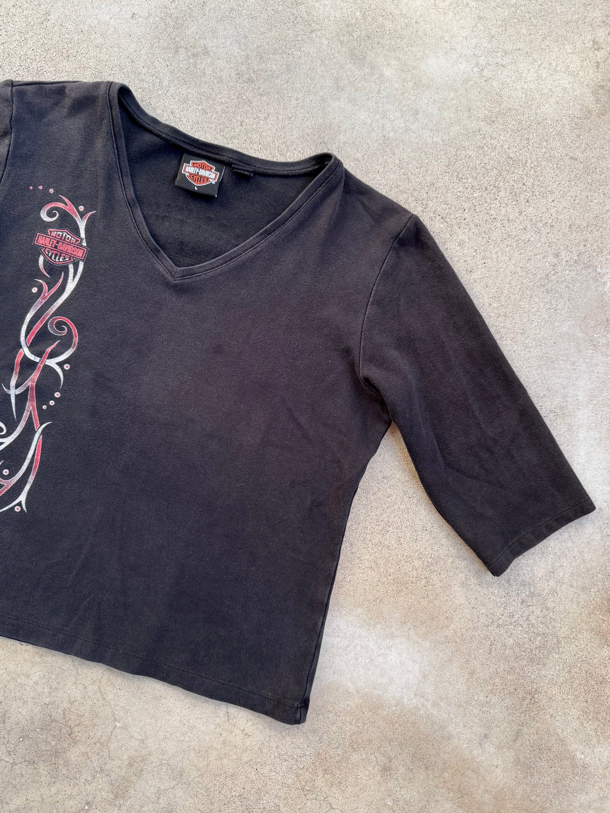 2000s Chi-Town Harley Davidson Cropped & Fitted V-Neck 3/4 Sleeve Black & Red Graphic Tee. Soft cotton stretch fabric.
