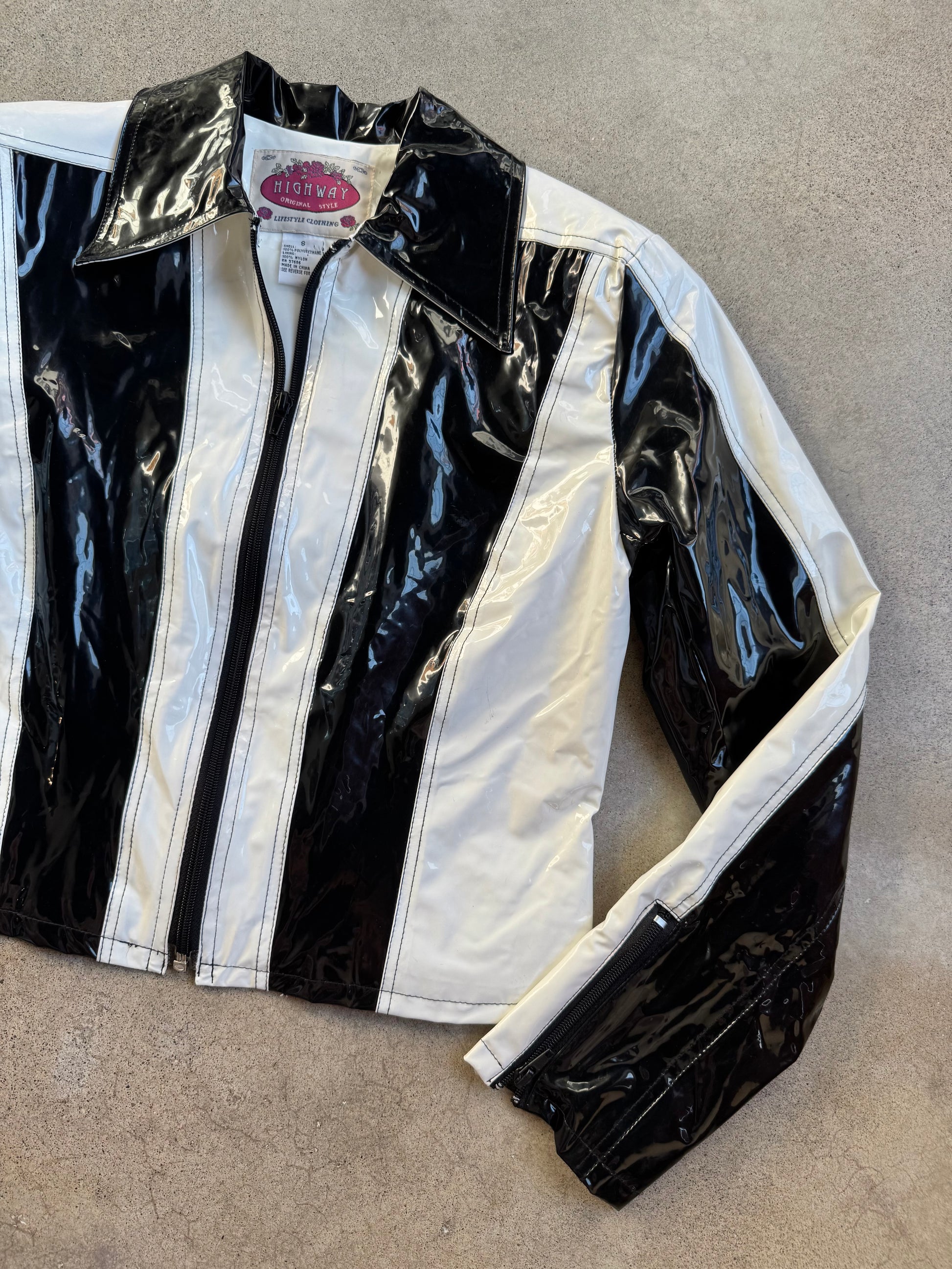 Vintage 1990s Highway Black & White Cropped Zip-Up Vinyl Jacket. Fully lined w/ shoulder padding inside lining.