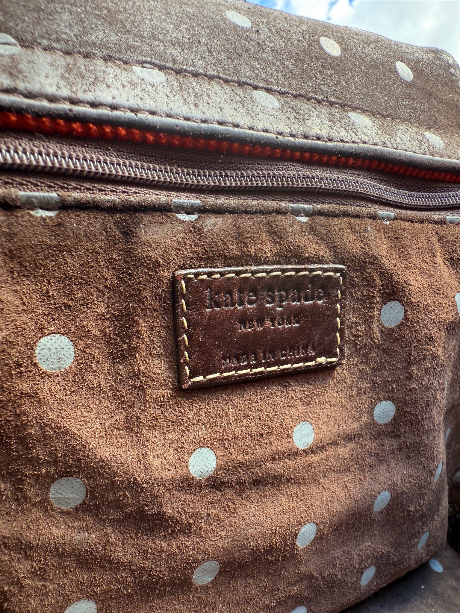 Vintage 1990s Kate Spade Burnt Orange/Red Corduroy Handbag w/ Brown Leather Straps. Features a magnetic button closure & polka dot lining inside compartment.