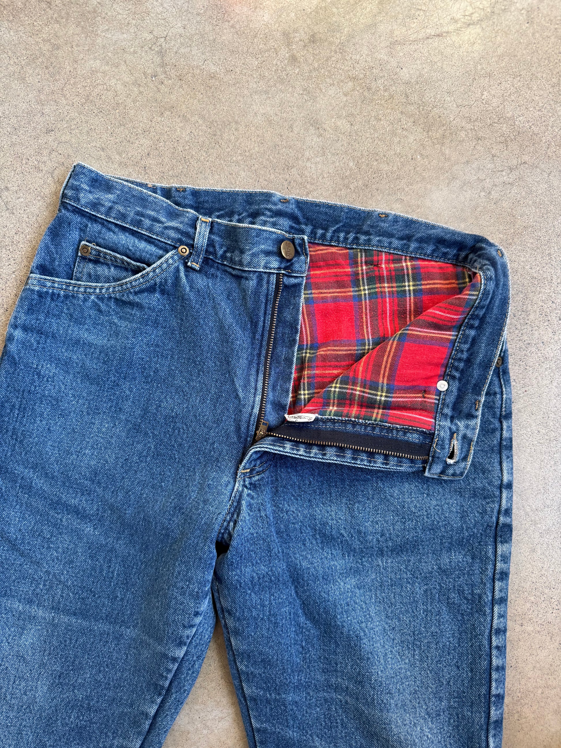 Vintage 1990s L.L. Bean Straight Leg Jeans w/ Red Plaid Cotton Flannel Lining. Features a zipper fly with button closure. 100% cotton fabric.