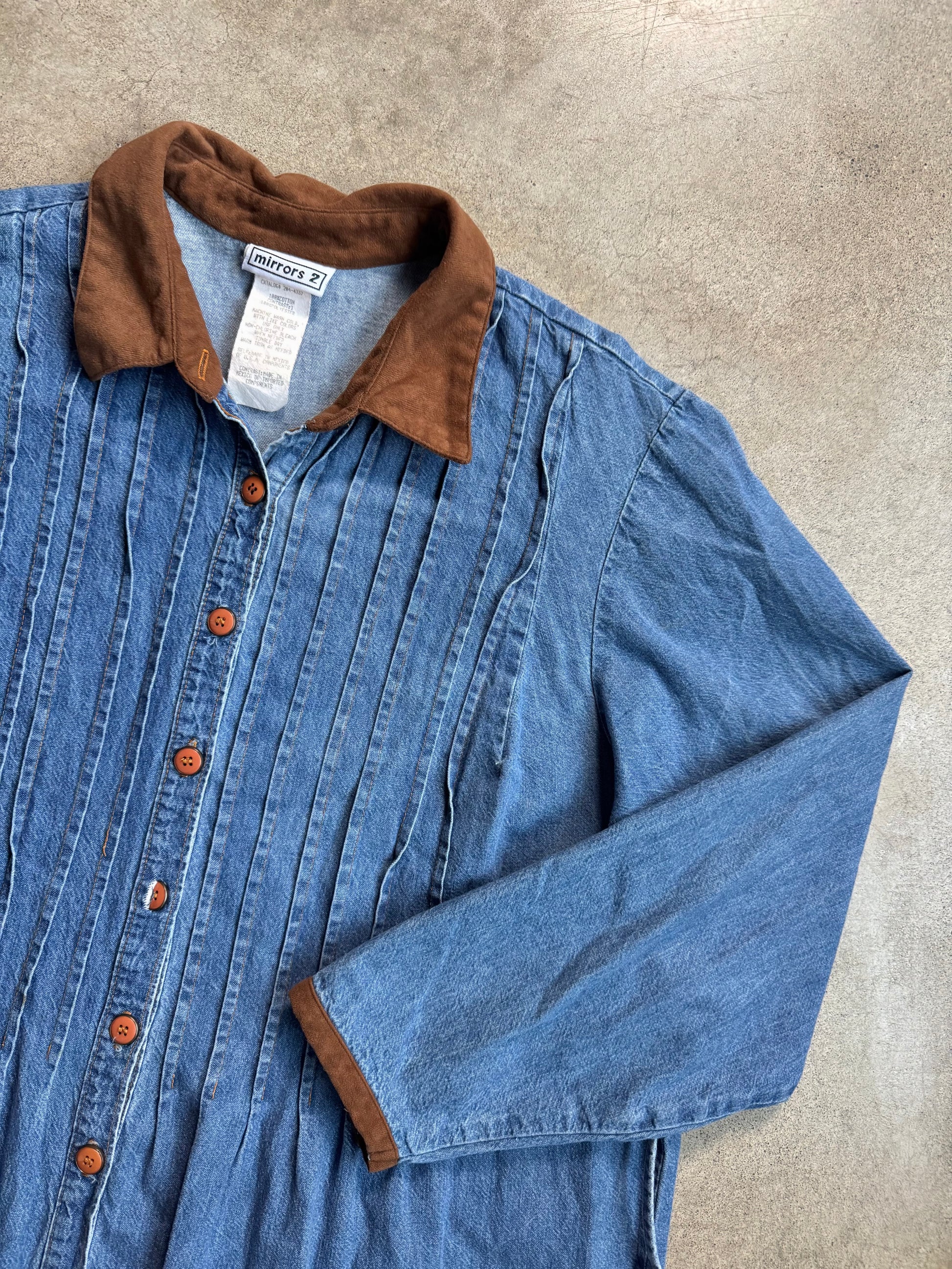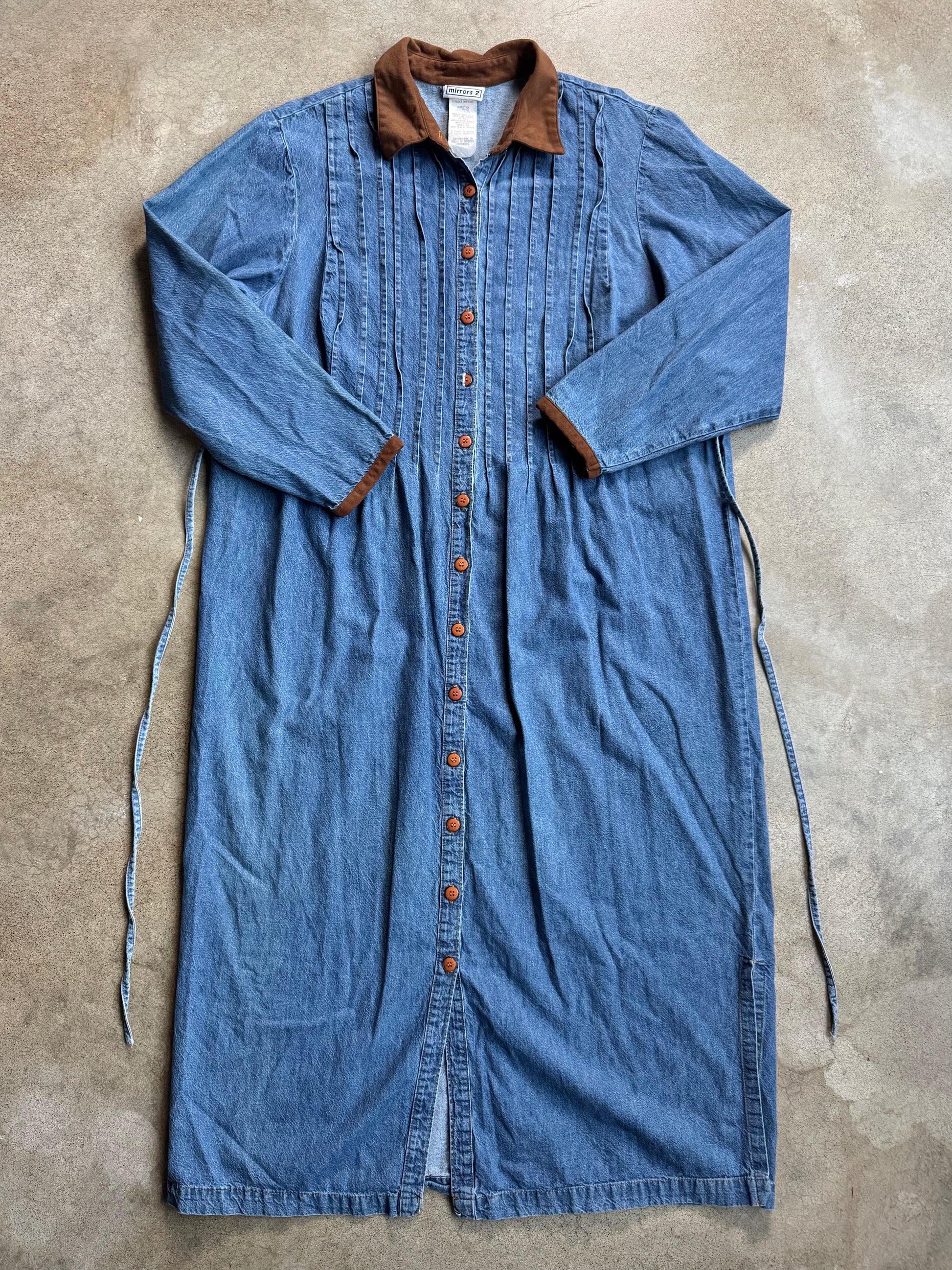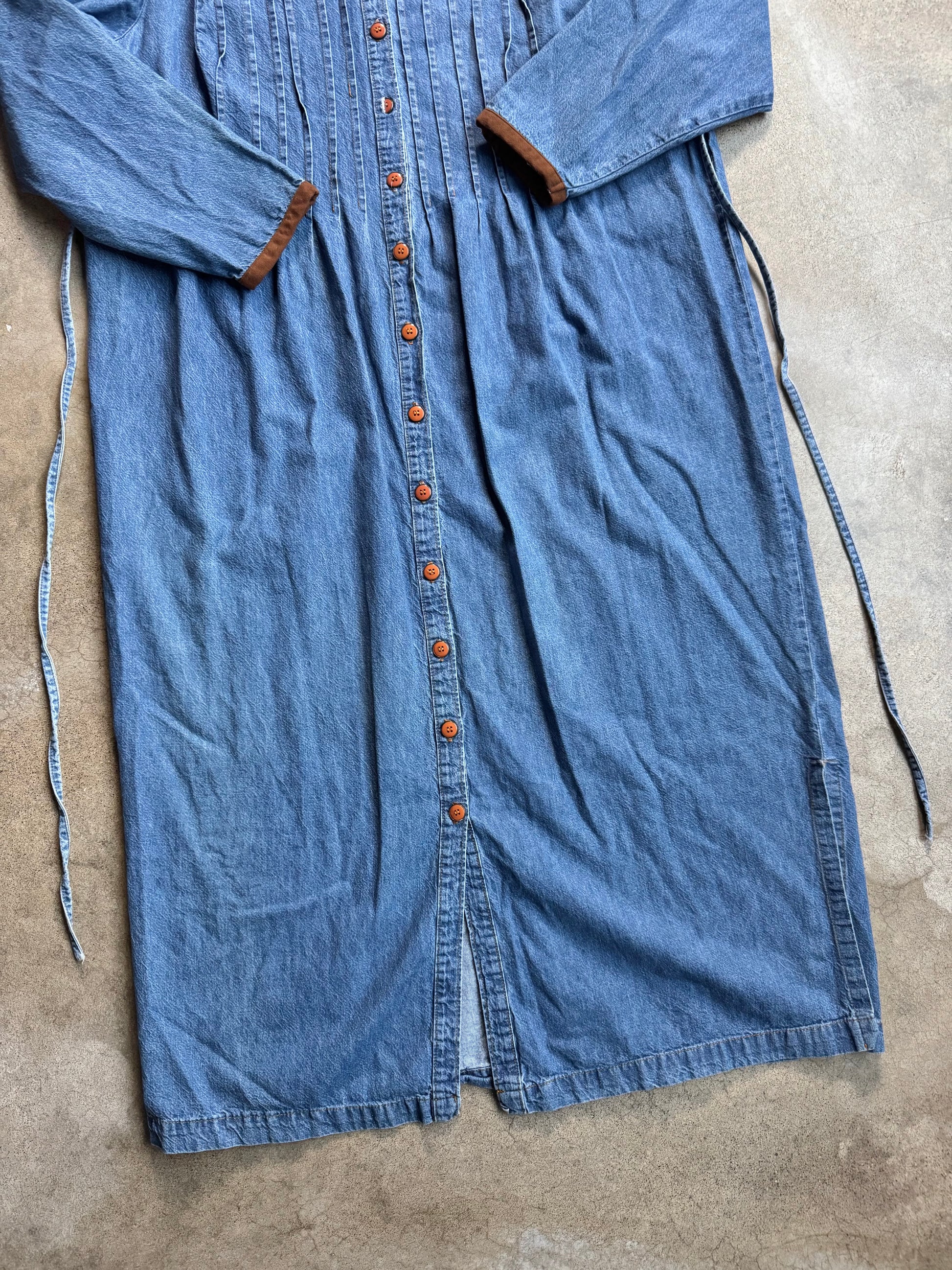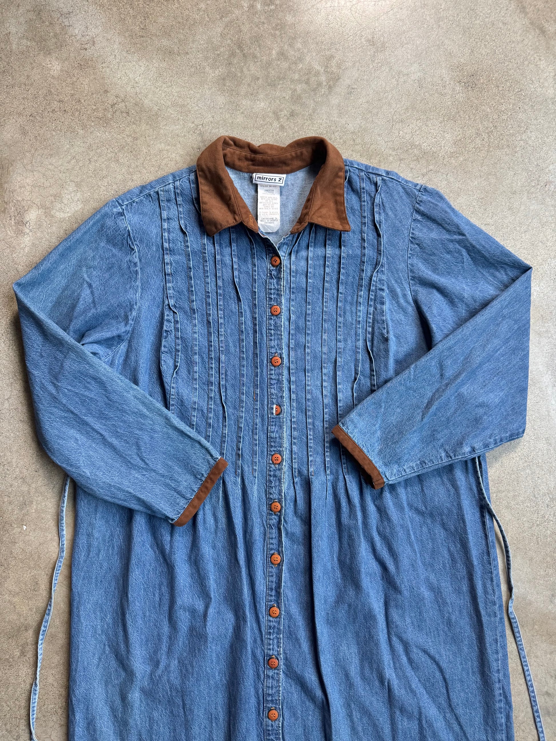 Vintage 1990s Mirrors 2 Denim Pleated Tie-Back Maxi Shirt Dress w/ Faux Suede Collar & Trim.