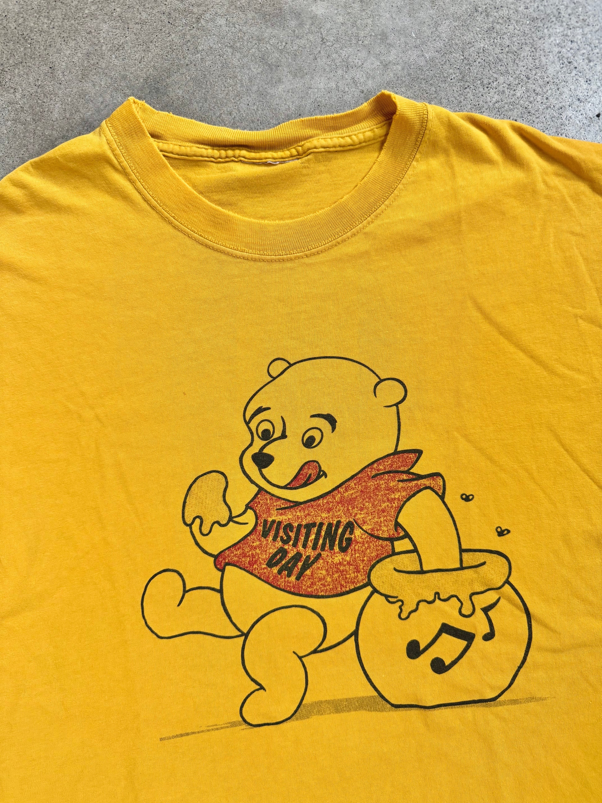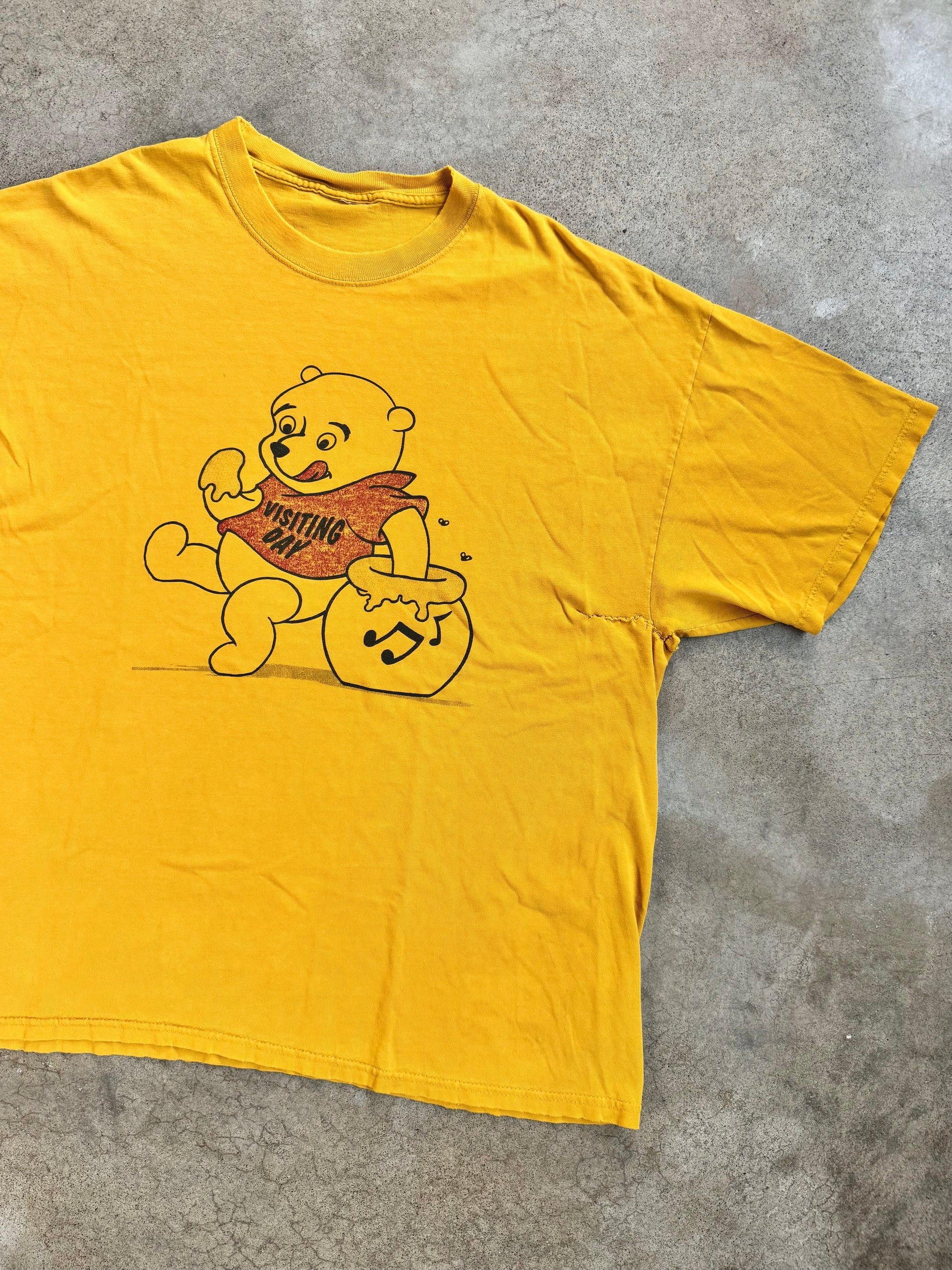 Vintage 1990s Distressed Yellow Winnie The Pooh “Visiting Day” Two-Sided Graphic Tee.