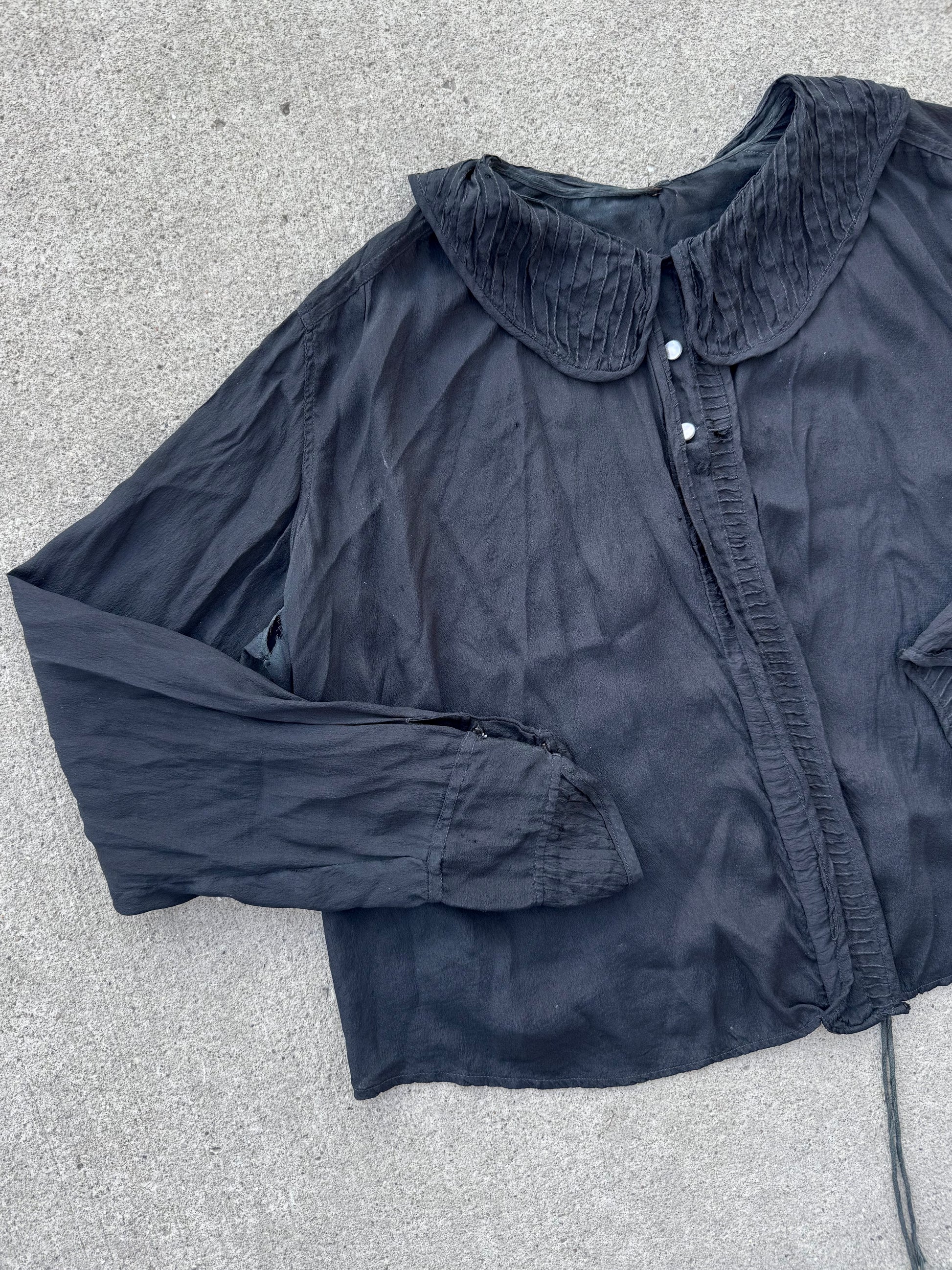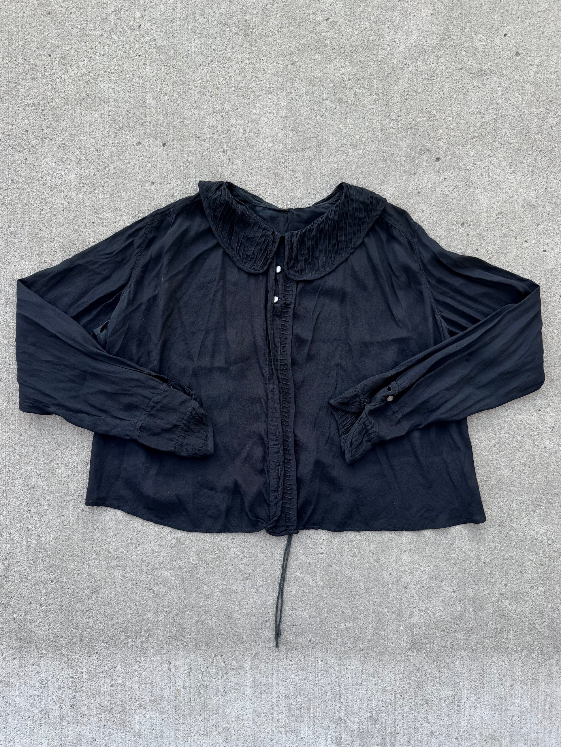 Antique 1910-20s 100% Silk Black Sheer Blouse. Features a Peter Pan collar & tie at back of waist.