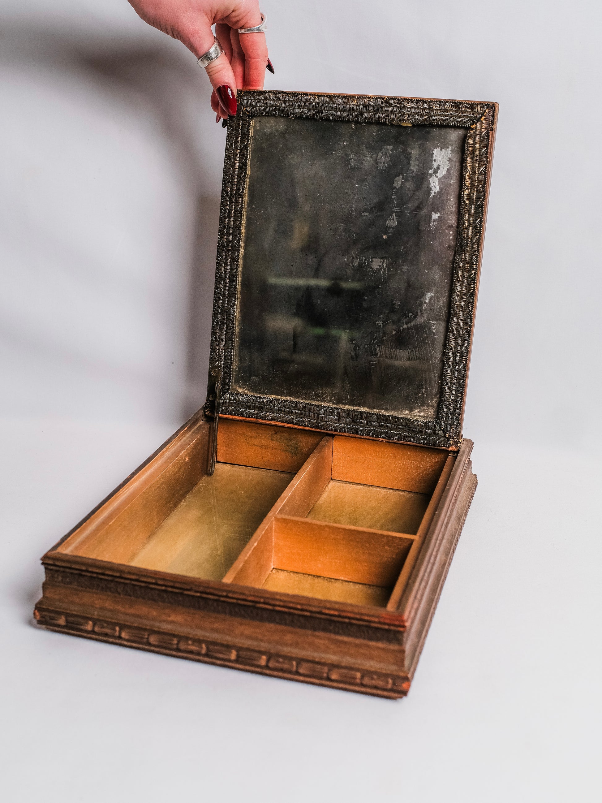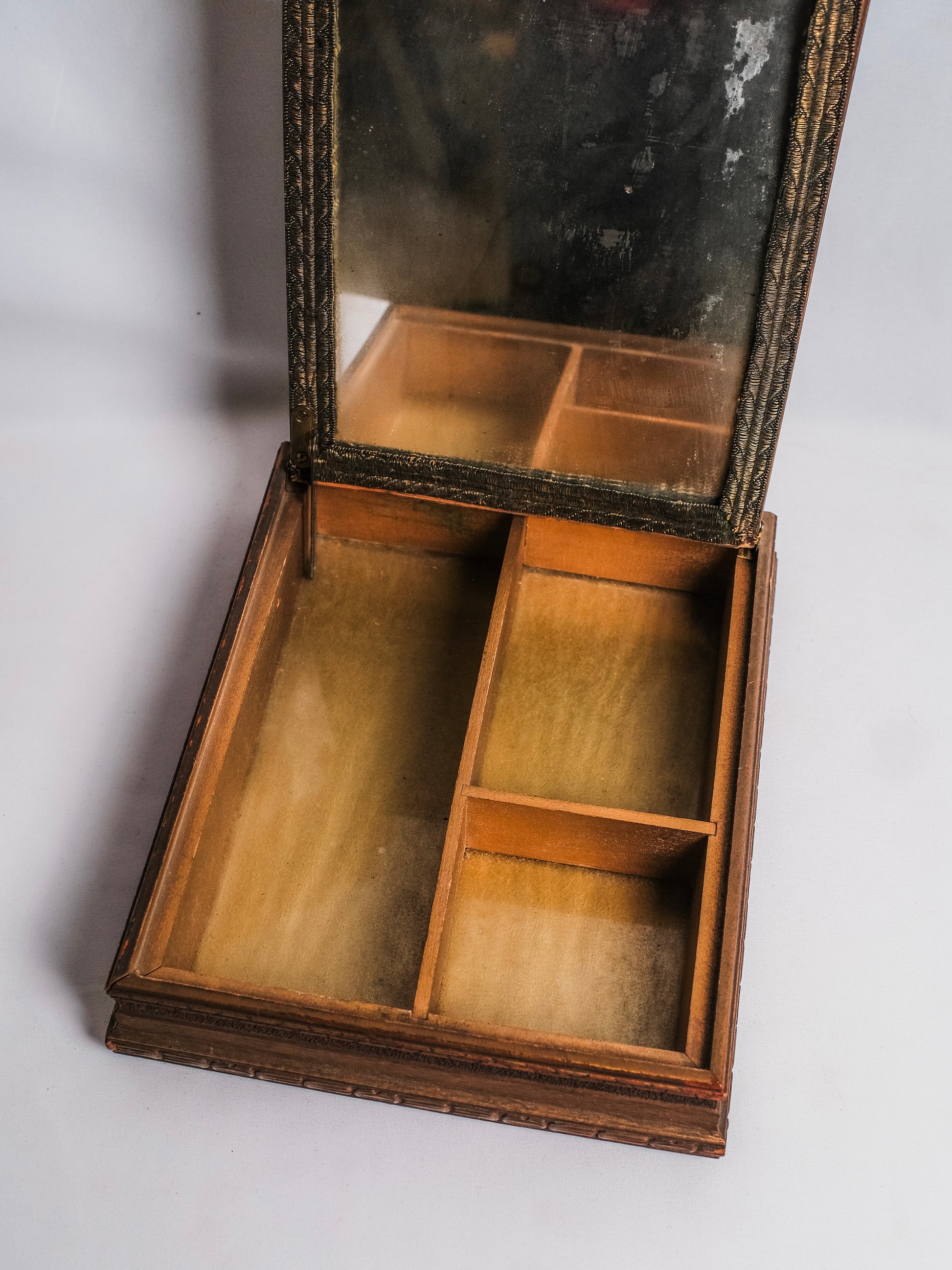 Item Condition - Inside mirror is worn/desilvered from age. No major flaws on outside of box.