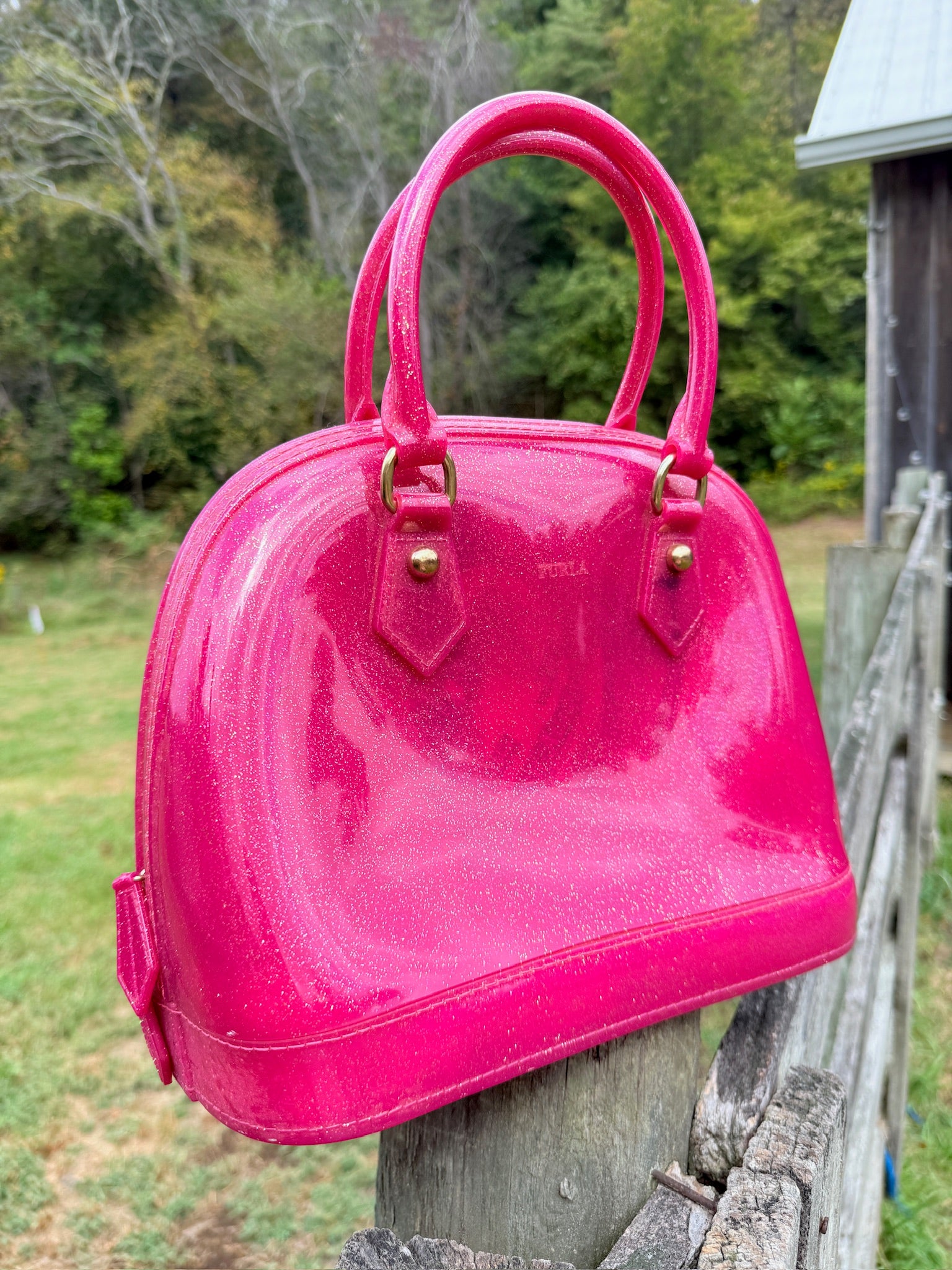 Furla Pink Candy Glitter Jelly Top Handle Bag w/ Crossbody Strap (removable).