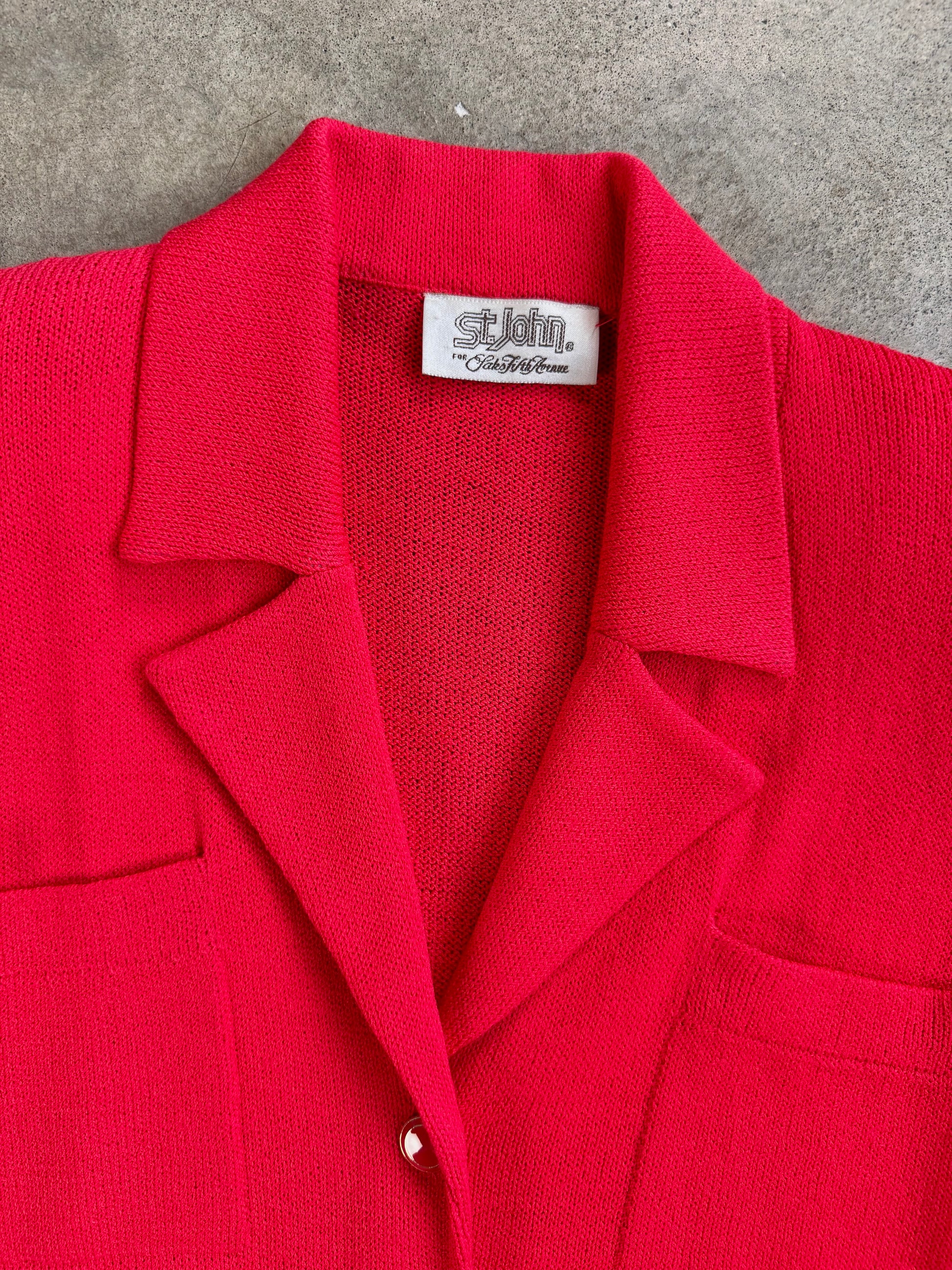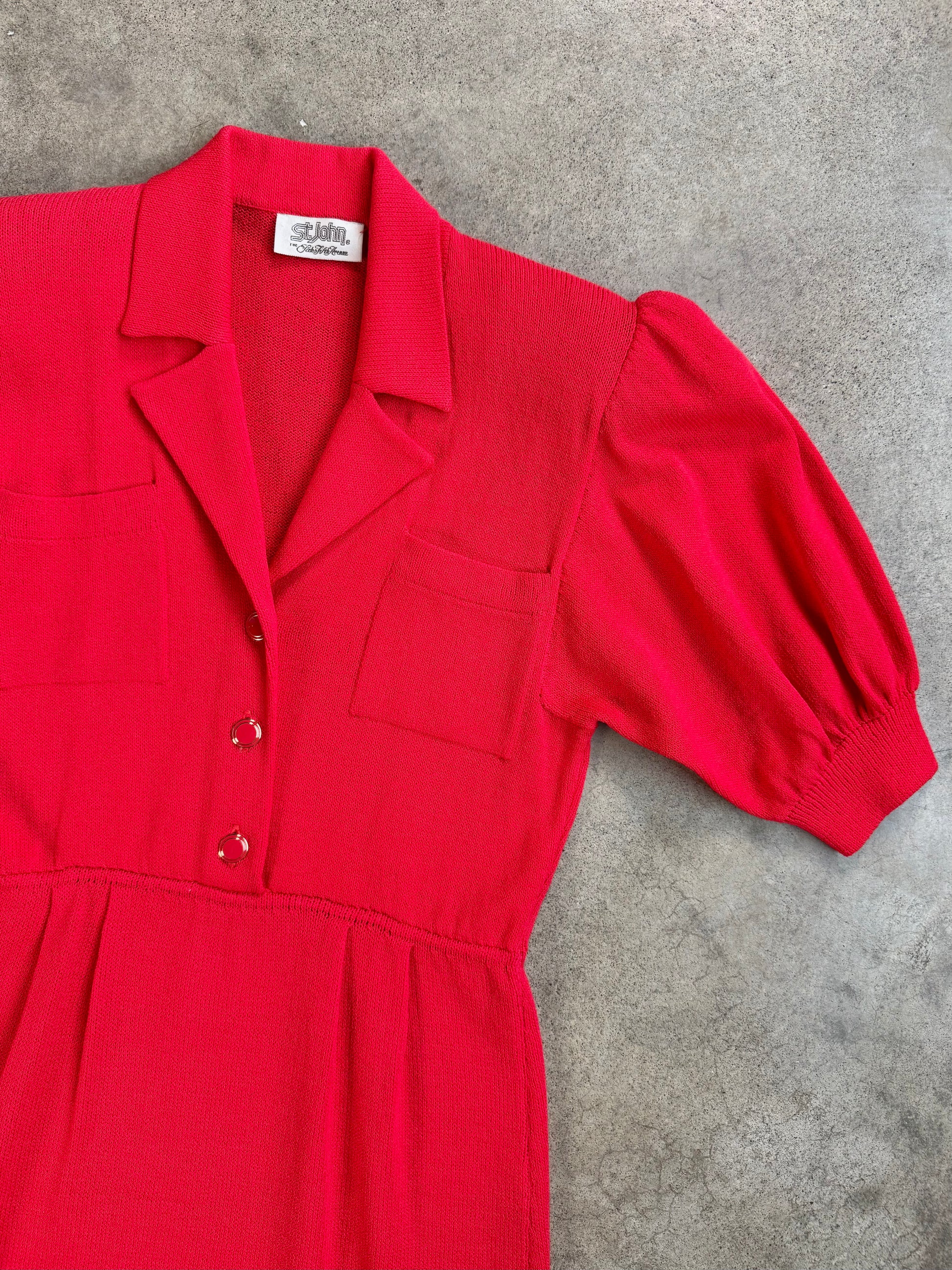 Vintage 1980s St. John for Saks Fifth Ave. Red Puff Sleeve Button-Front Knit Dress | S/M
