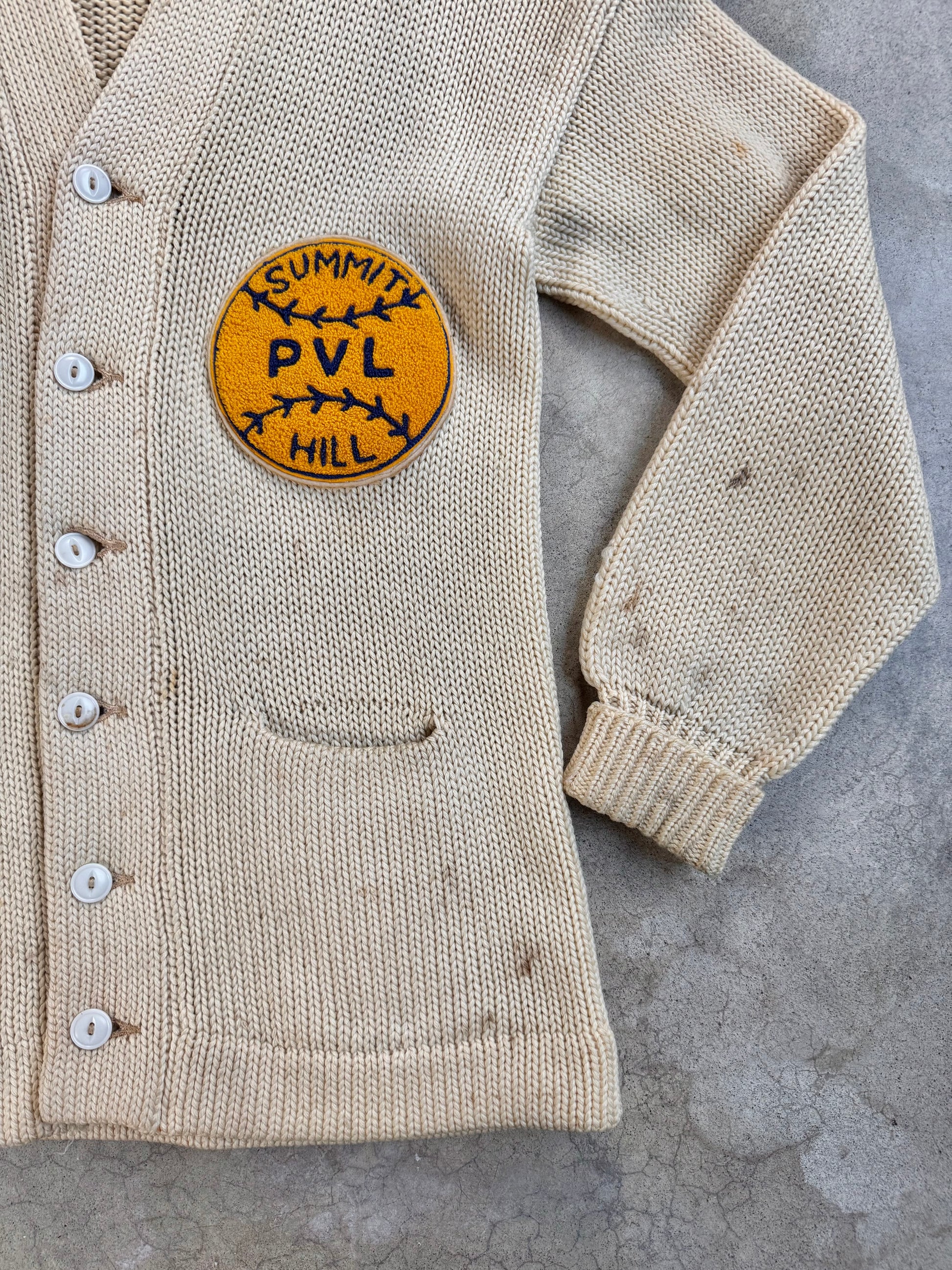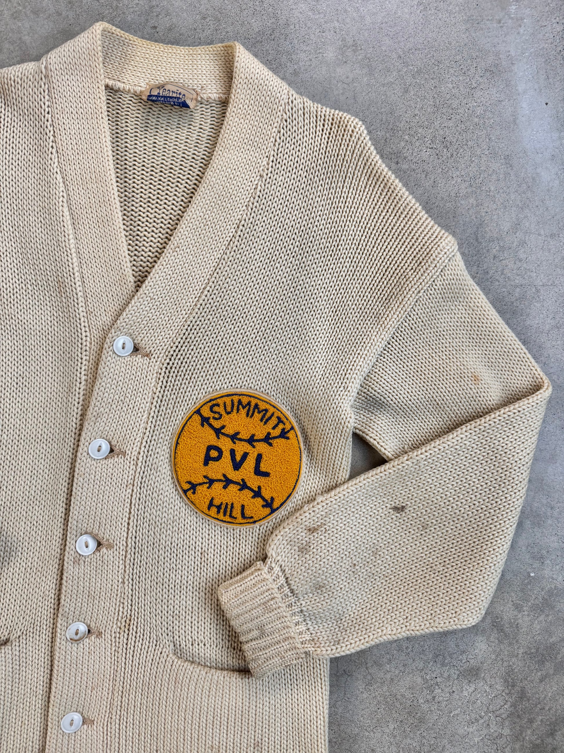 Vintage 1940s Yearite Distressed Summit Hill Patch Varsity Sweater. Thick, heavyweight buttoned cardigan. Features two front pockets & cuffed sleeve.