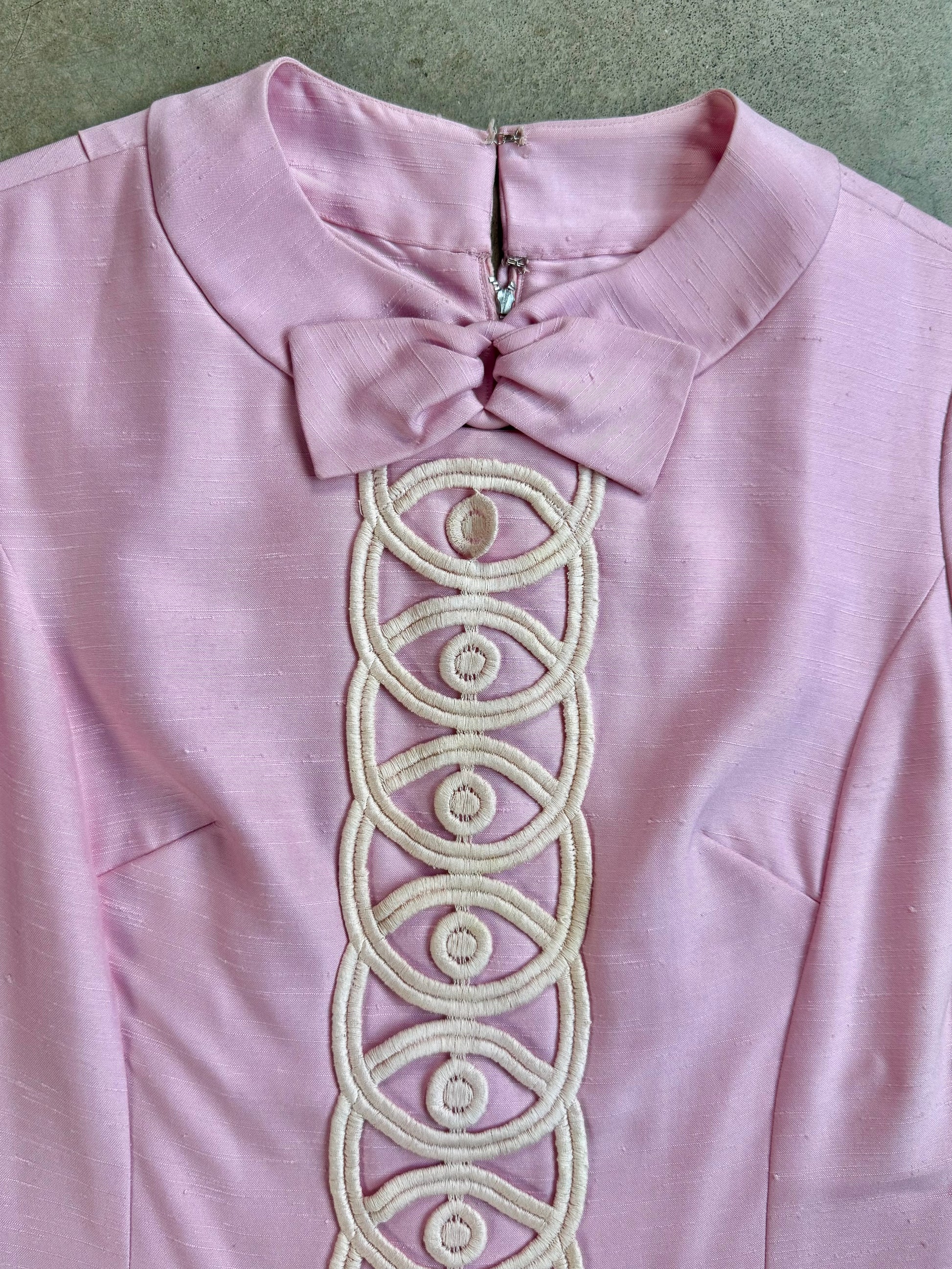 Vintage 1960s Mod Bubblegum Pink Embellished Short Sleeve Sheath Dress. Features a bow tie at neck, interlocking ring appliqué down the front, and a zipper closure at back.