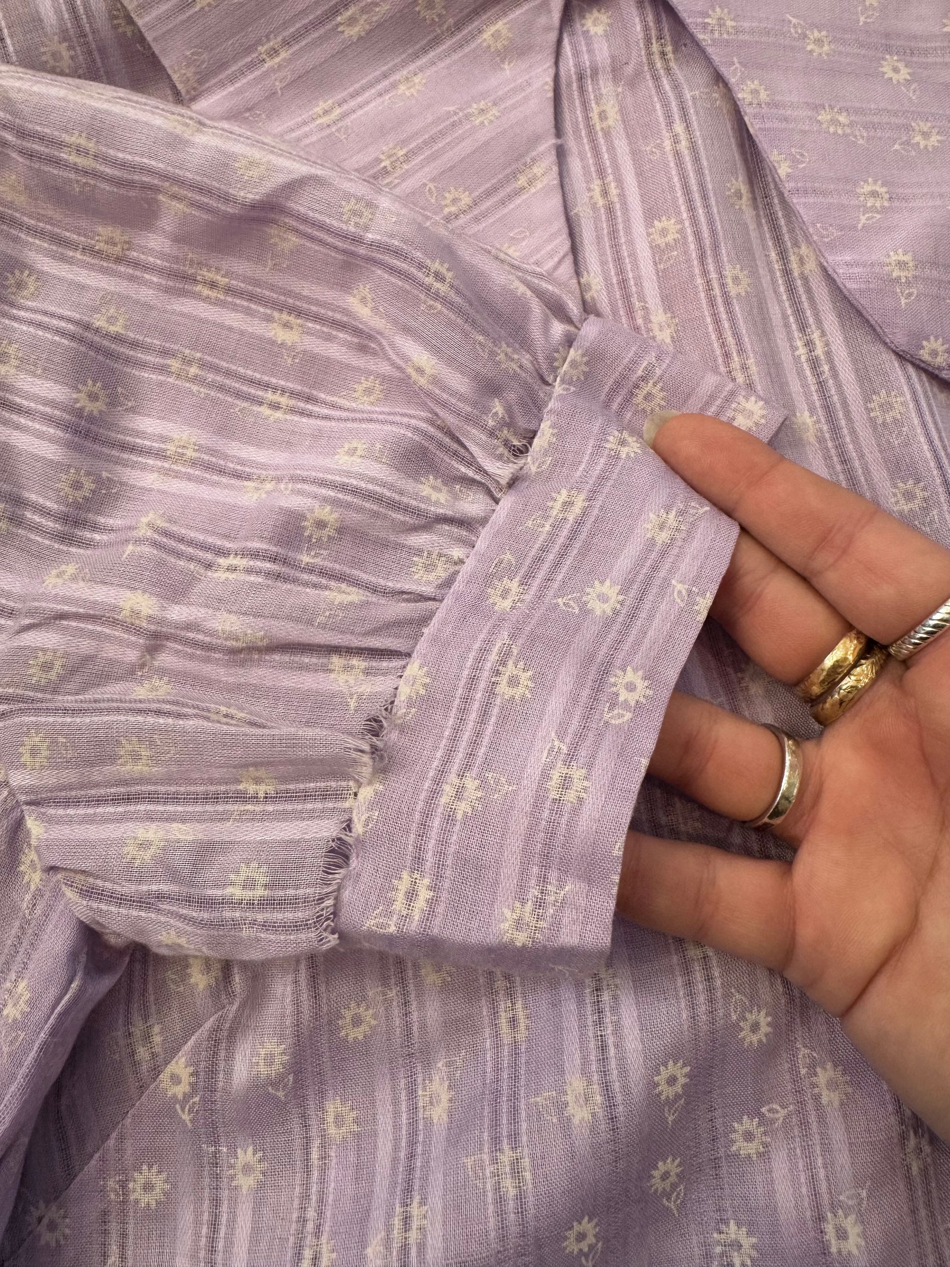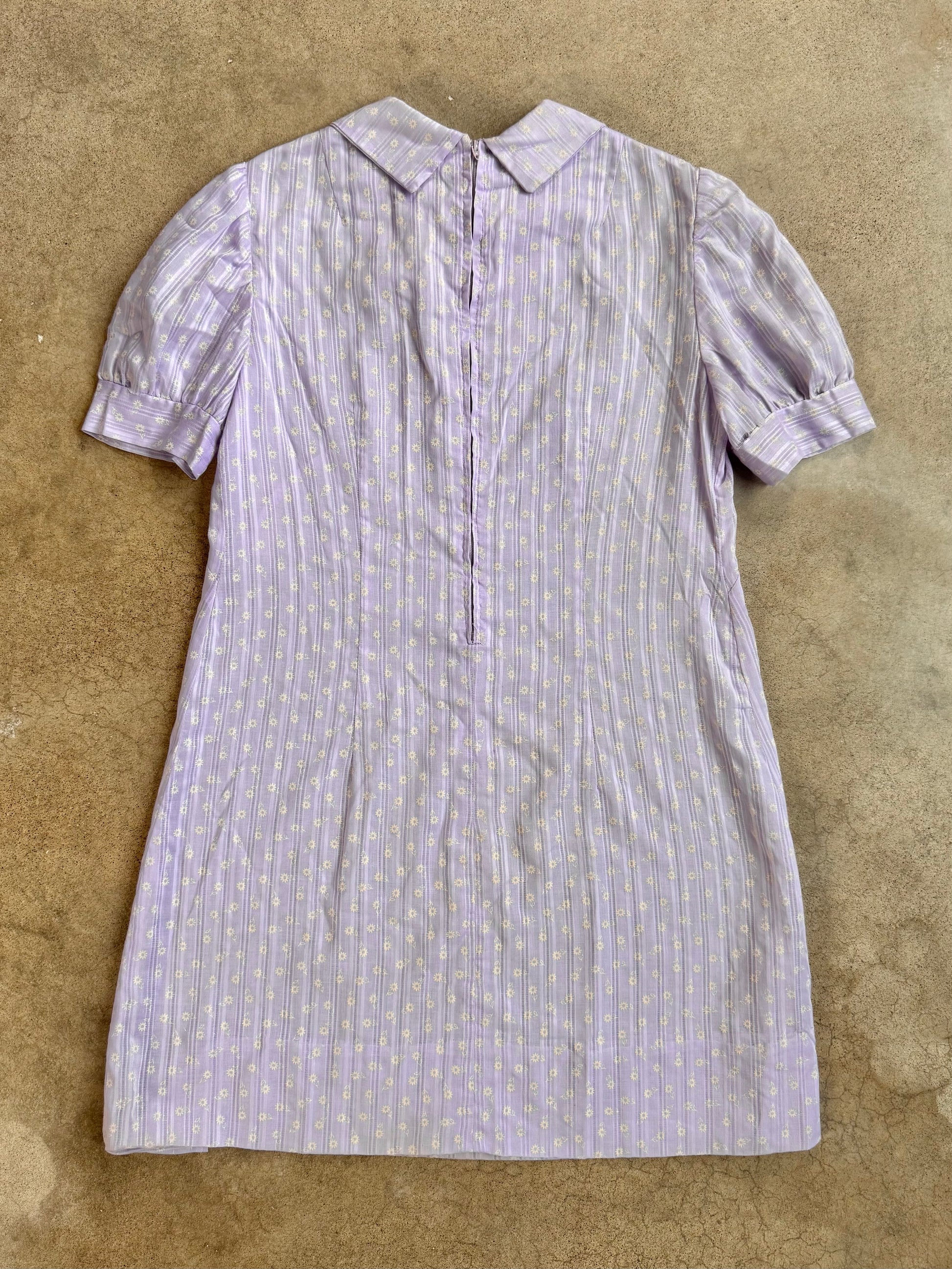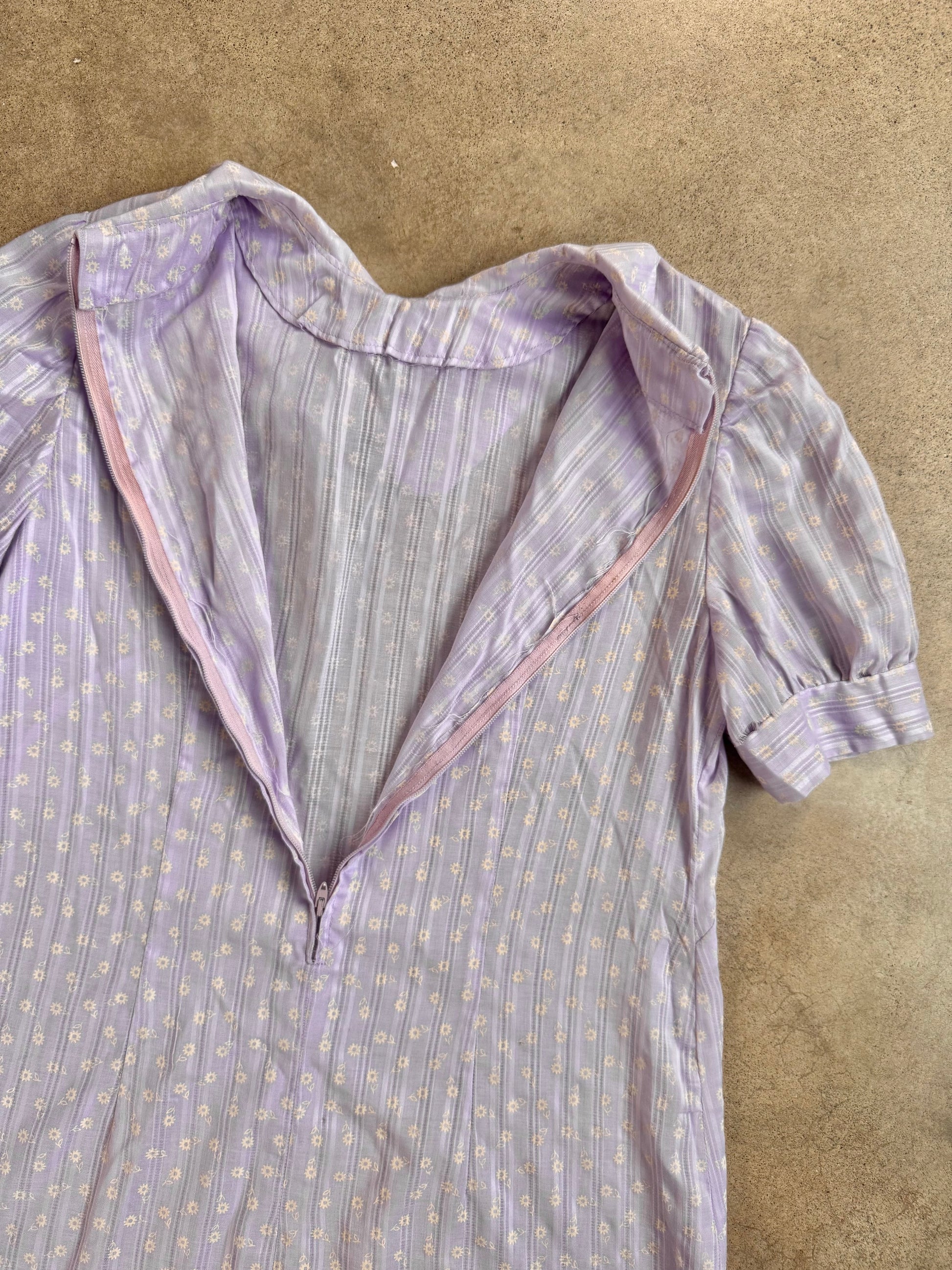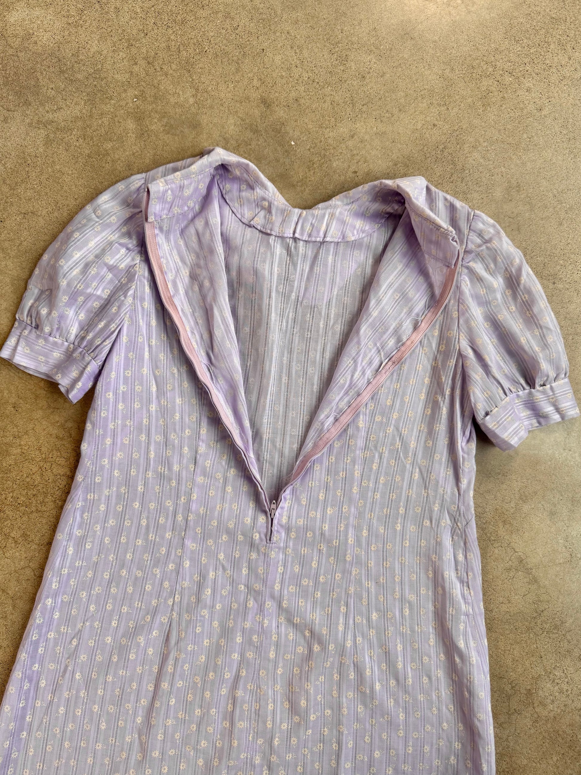 Vintage 1960s Purple Ditsy Floral Print Collared Puff Sleeve Dress. Features a zipper closure at back. Lightweight sheer fabric.