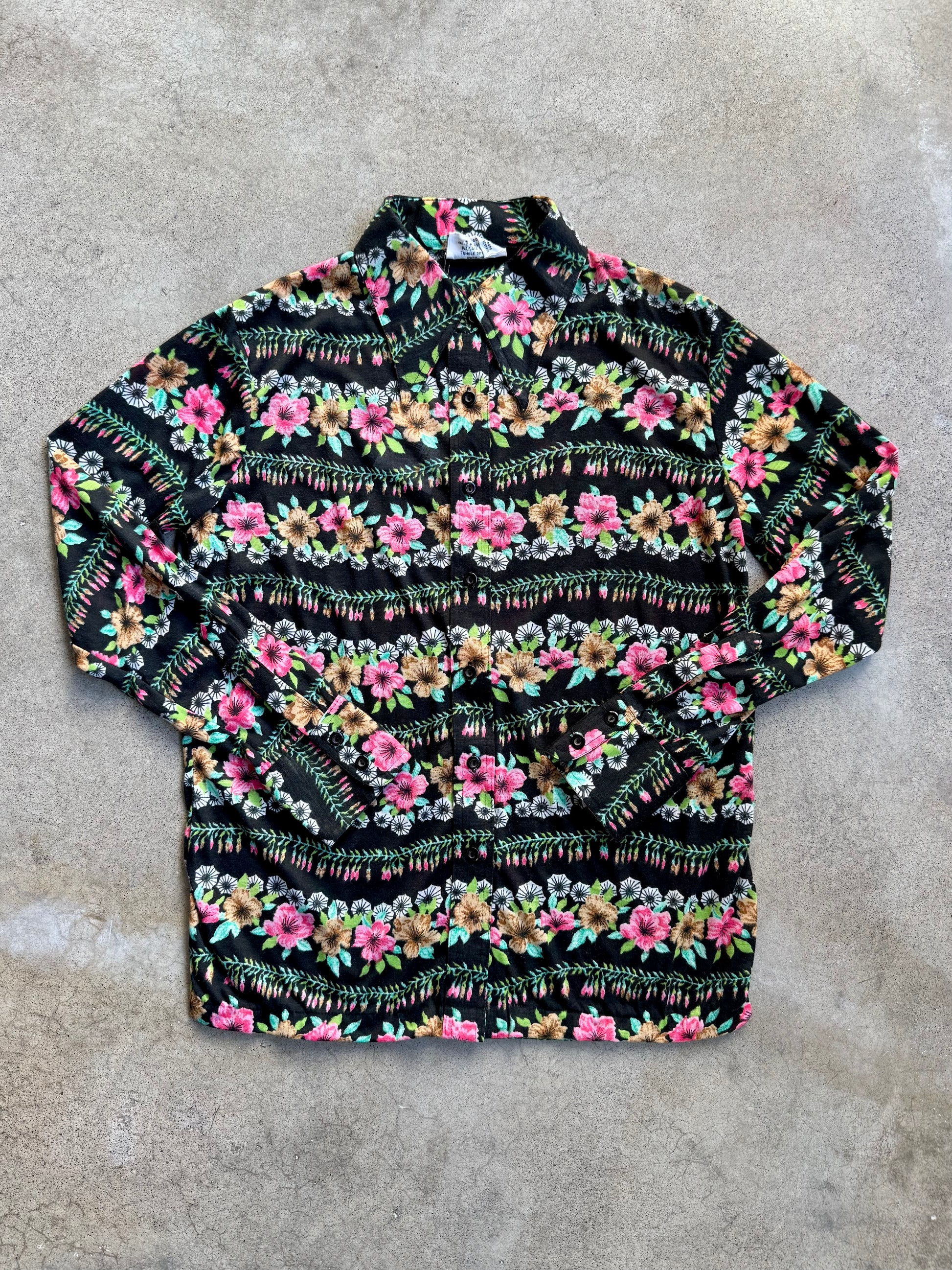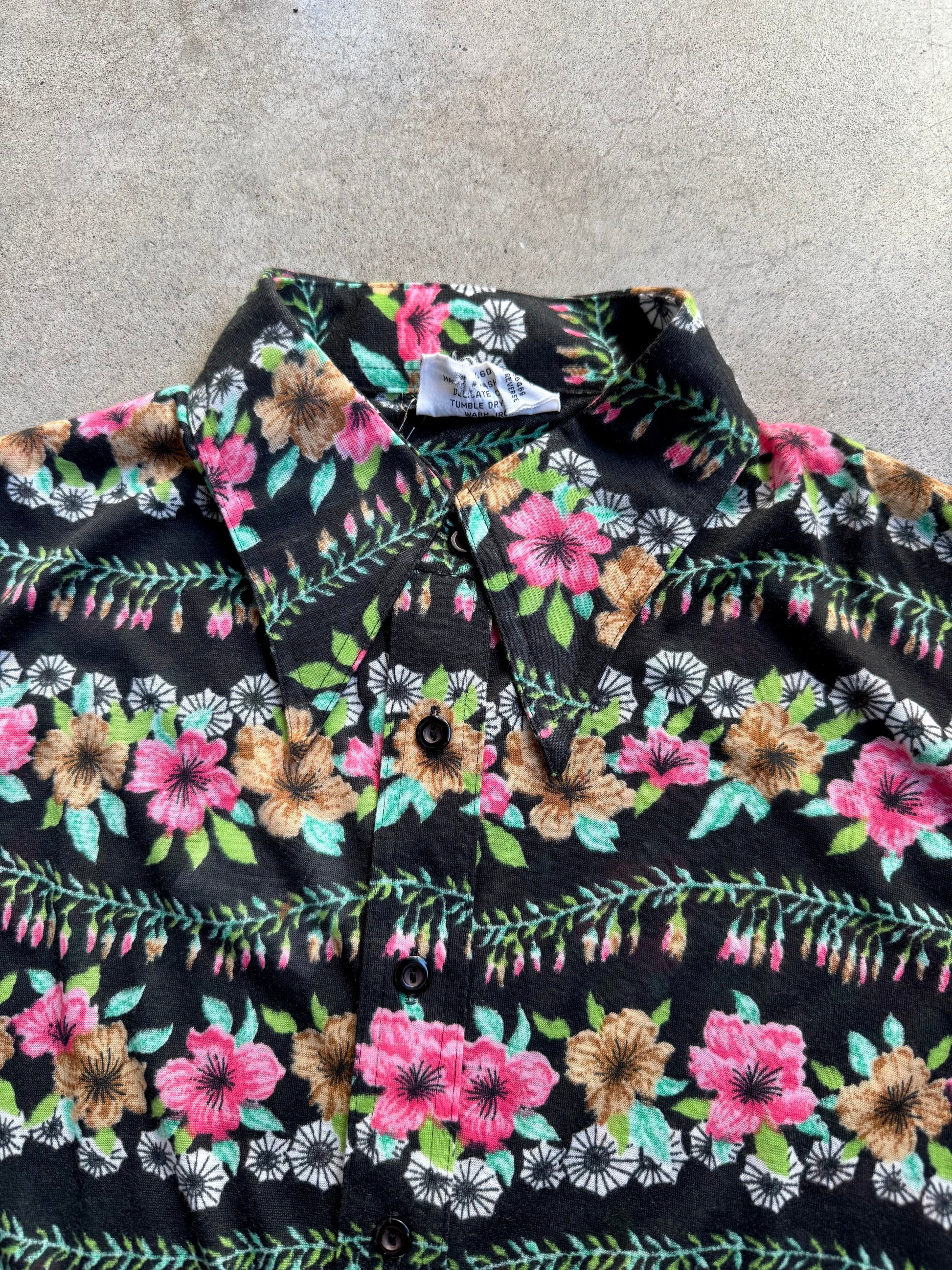 Vintage 1970s Kmart Floral Print Button-Up Shirt. Lightweight & soft poly knit fabric.